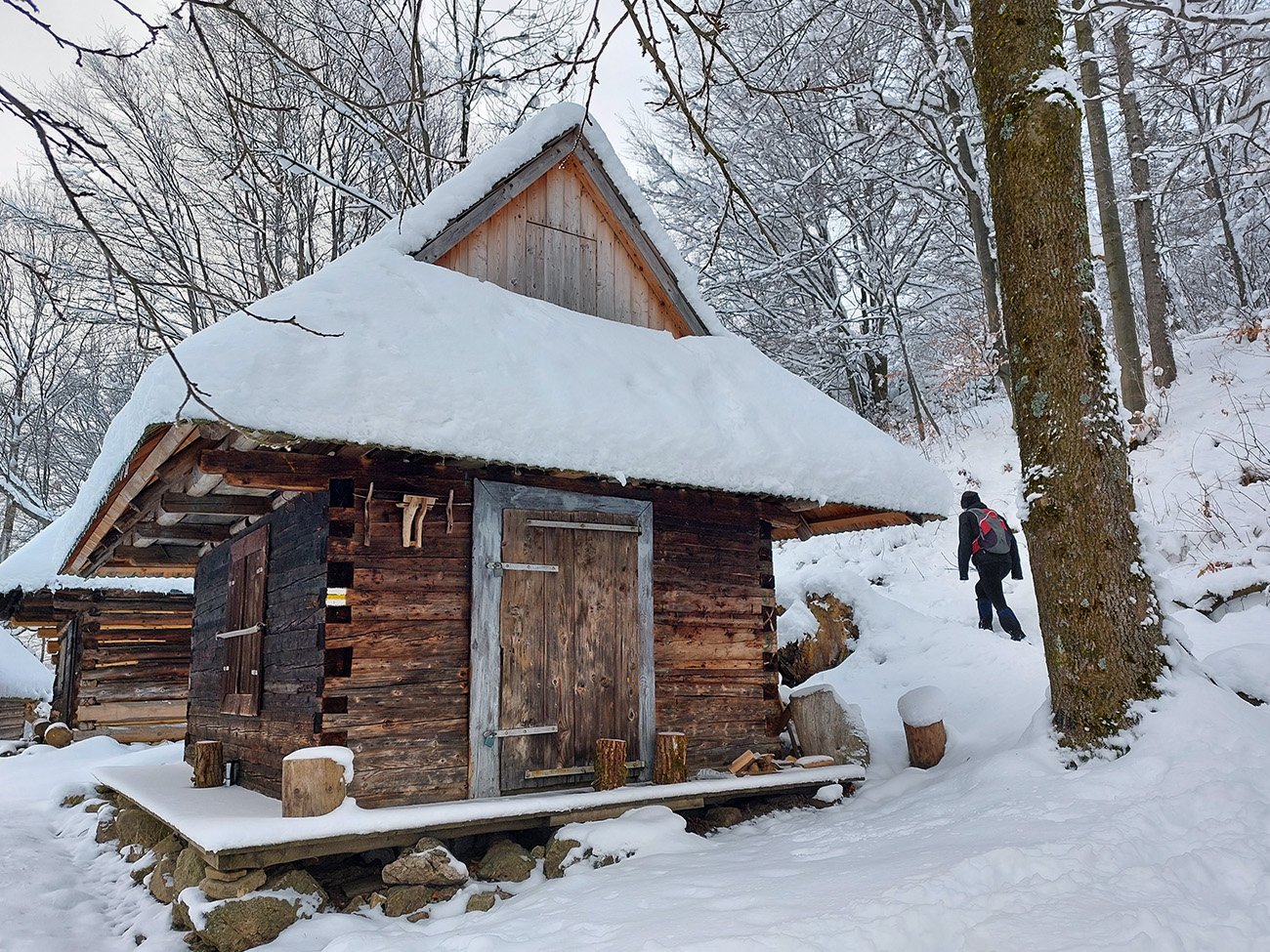 Potom už len pohodlný zošup dole lesom do Žaškovského sedla, po mäkkom snehu, miestami ako v bobovom tobogáne. Aj sme trochu kopli do vrtule, pre istotu, žeby nám vlak neušiel. V sedle na lúkach čisto bielo, len ojedinelé stopy na obe strany do dedín. A pod lesom relatívne nový prístrešok – vidno, že miestni turisti sa starajú.
