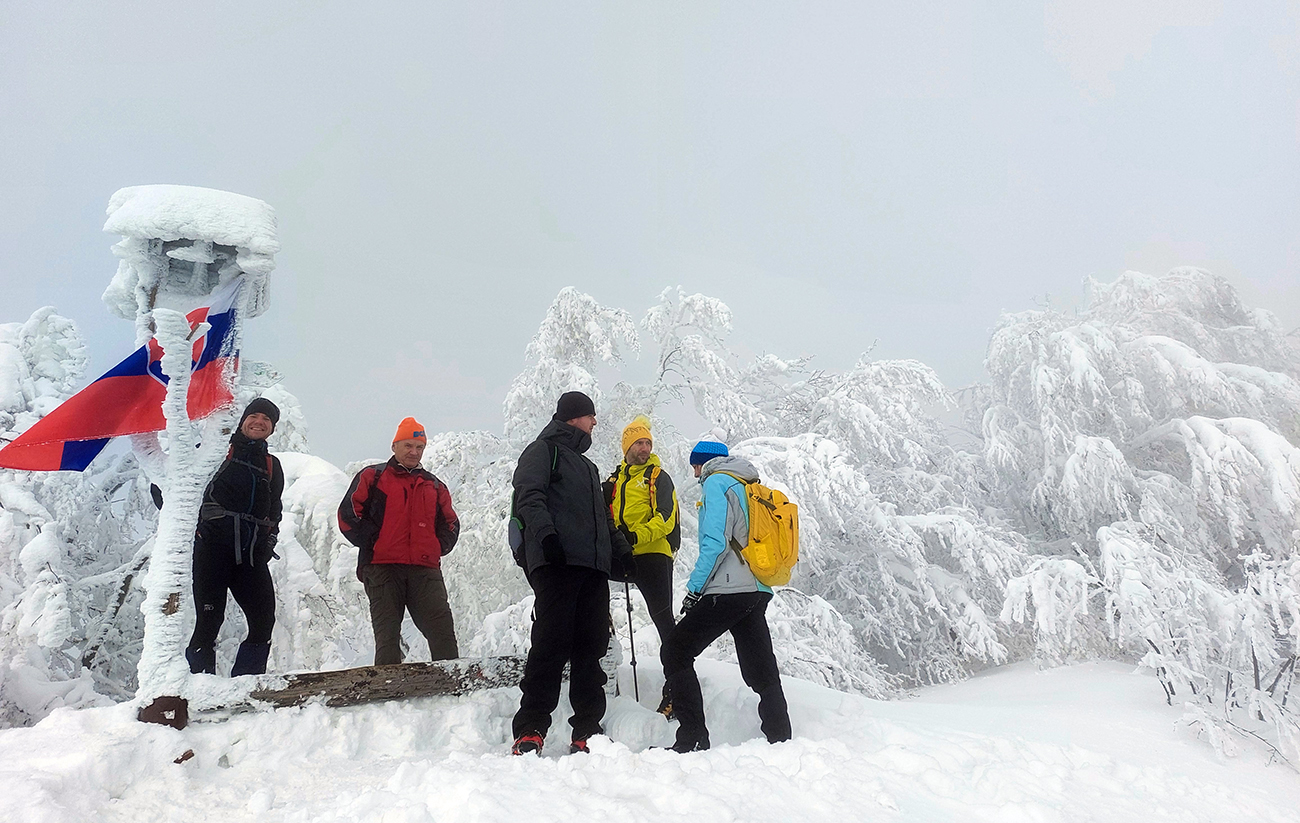 Po obhliadke sme sa teda pobrali - čoraz vyššie a nohami čoraz hlbšie. Žltú sme síce na chvíľu hneď na začiatku stratili, potom ale už bez pochýb až do konca – stromy našťastie nemali snehom obalené kmene, len koruny. Ešte sme si vychutnali krátku (značenú) odbočku a návštevu jednej z mnohých jaskyniek v tomto vápencovom masíve, a nasledovala dlhá, strmá a výživná robota až ku krížu.