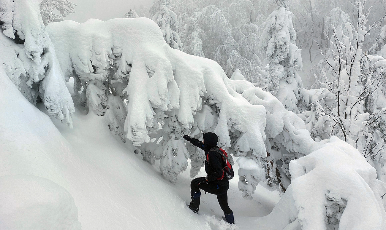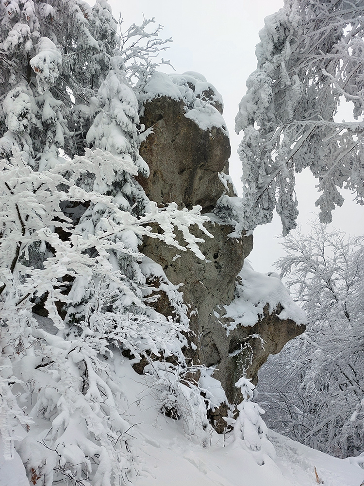 Netreba sa diviť, prečo nebol z tejto strany a o tomto čase chodník prechodený – je to superstrmý výstup, náročný aj za sucha. Obielené stromy a s výškou pribúdajúce skalky, bralá a vežičky mu ale teraz dodávali osobitné čaro, a keďže sme sa neponáhľali, bolo pri vydýchavaní aj napriek hmle a čiernobielemu svetu stále na čo pozerať.