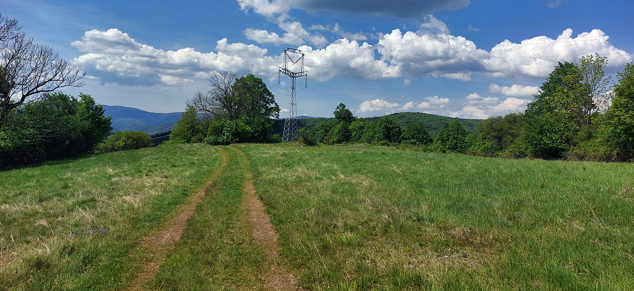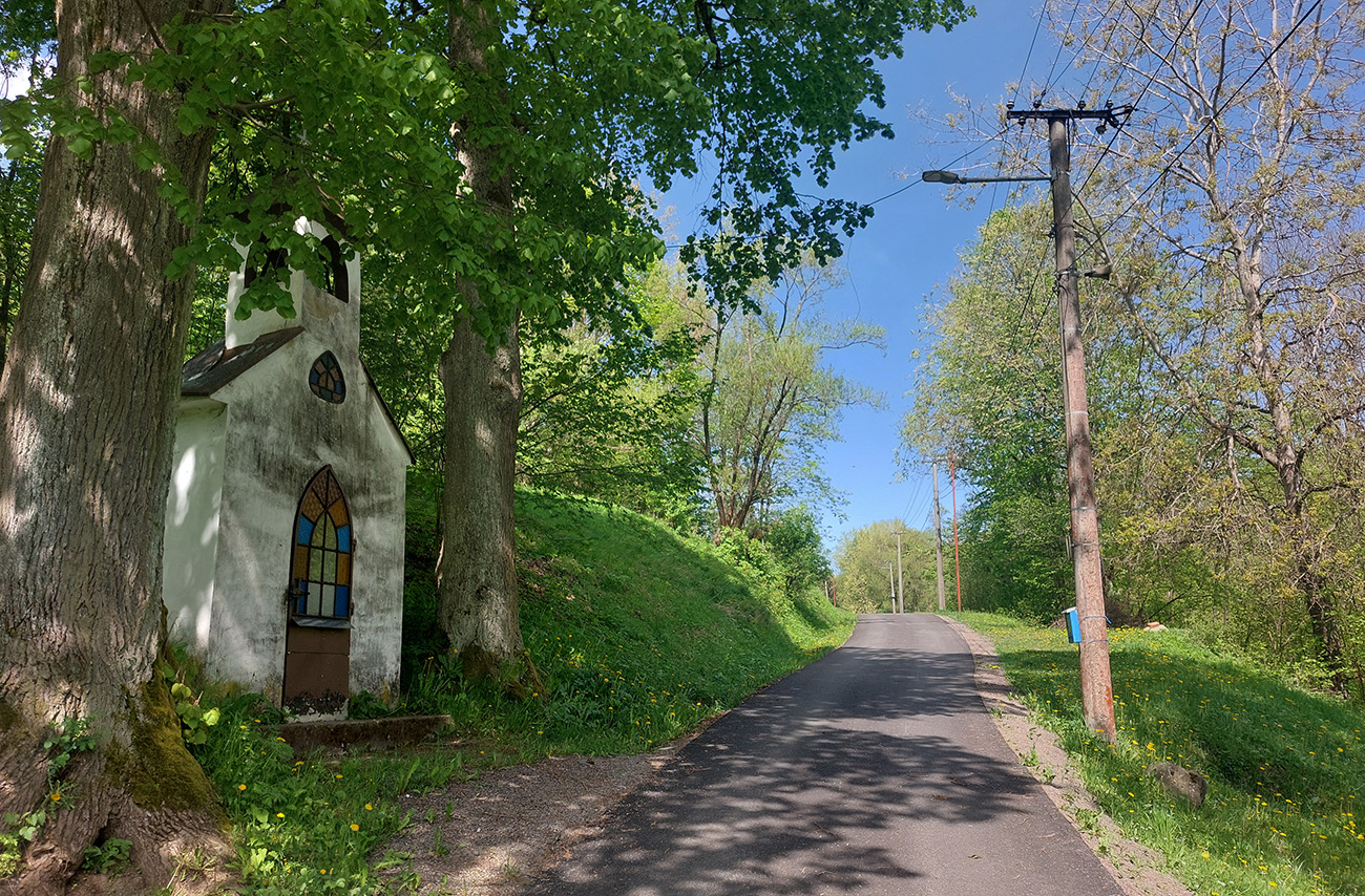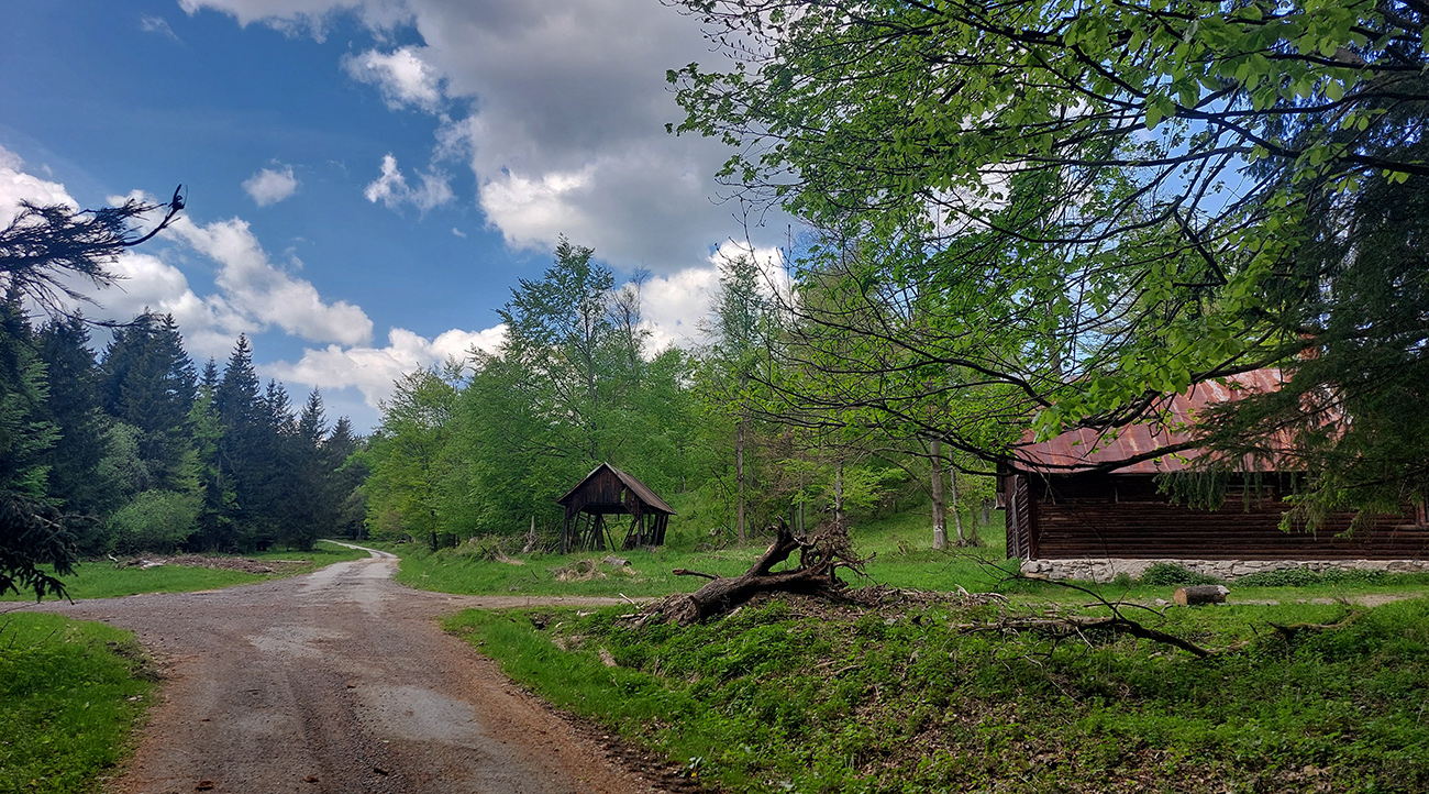 Pár stoviek strmých asfaltových metrov, prudko doľava (akoby niekomu do dvora) a ešte strmší úsek von z dediny, tienistým úvozom po hline a šotoline. Treba sa trochu priprieť, ale ide to, cesta dobrá. Von z lesa na ďalšie veľké lúky – to je preklopenie do doliny potoka Kopernica, a zase na rozľahlých lúkach cesty nezreteľné. Pár orientačných bodov – stromov tam je: