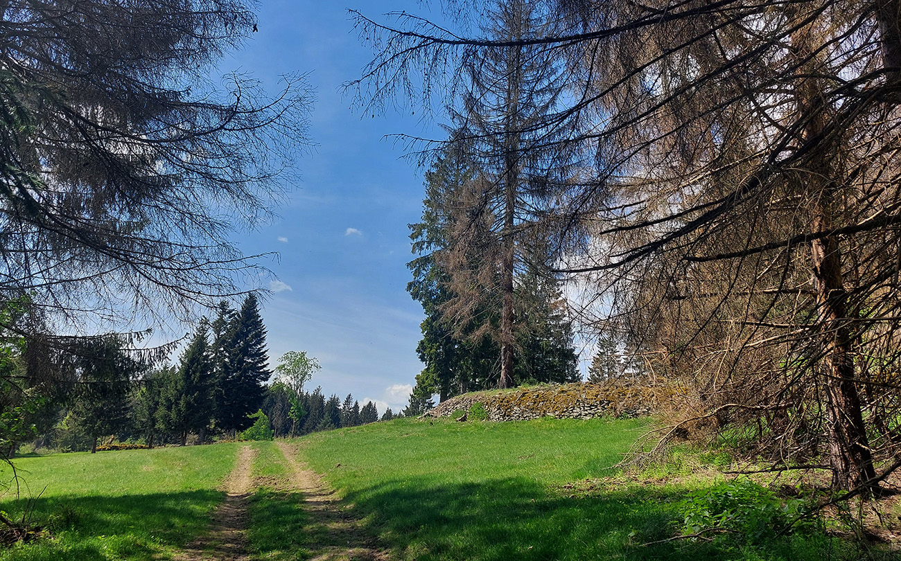 Už som vedel, že to budem musieť skrátiť, ale nevadilo. Užil som si krásny spodný (južný) okraj Kunešovskej planiny, príjemne po trávičke pomedzi remízky lesa. Následne aj prejazd cez lúčnatý Bernardov (884 m) s parádnymi výhľadmi. Na lúkach sú tu všade mohutné múry z vyzbieraných kameňov – voľakedy to tu miestni kosili.