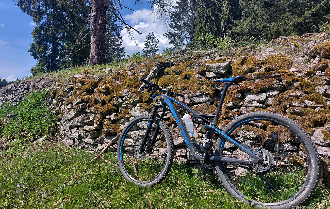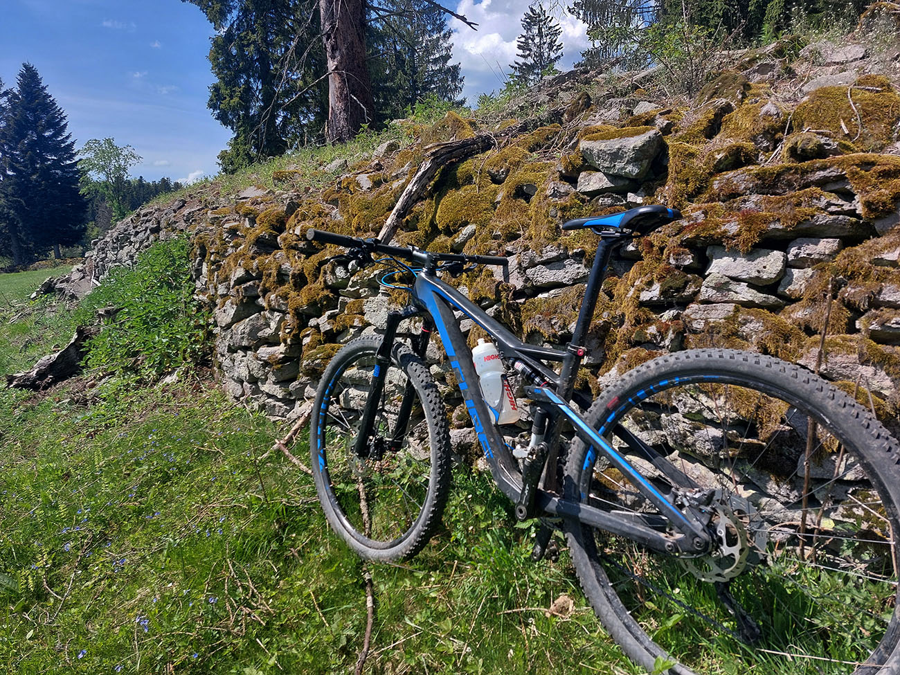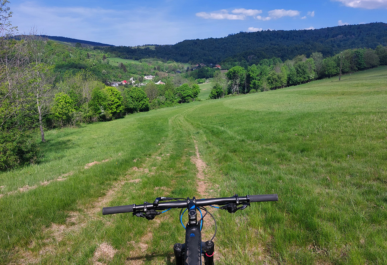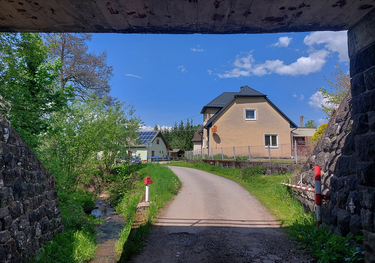 Aj tak som sa tam zamotal, pár jeleníc som vyplašil a pár ich prtí použil, kým som našiel cestu smerom na dno doliny traverzovať. No potom už to bolo jednoduché stúpanie, Kunešov neďaleko, nevysoko, cez dva mostíky, jeden z nich v rekonštrukcii. Akurát, že presne na tých lúkach ma muselo niečo pichnúť, v dedine už som musel meniť dušu. Tentokrát som plášť zvnútra poriadne prehmatal, či v ňom niečo neostalo zapichnuté ako minule. Dva razy meniť sa mi nechcelo. Zato začala štrajkovať moja historická pohotovostná pumpa, tak ďalšie zdržanie – doprosovanie, kto by požičal nejakú funkčnú. Vďaka patrí miestnym poľovníkom na chate za dedinou.