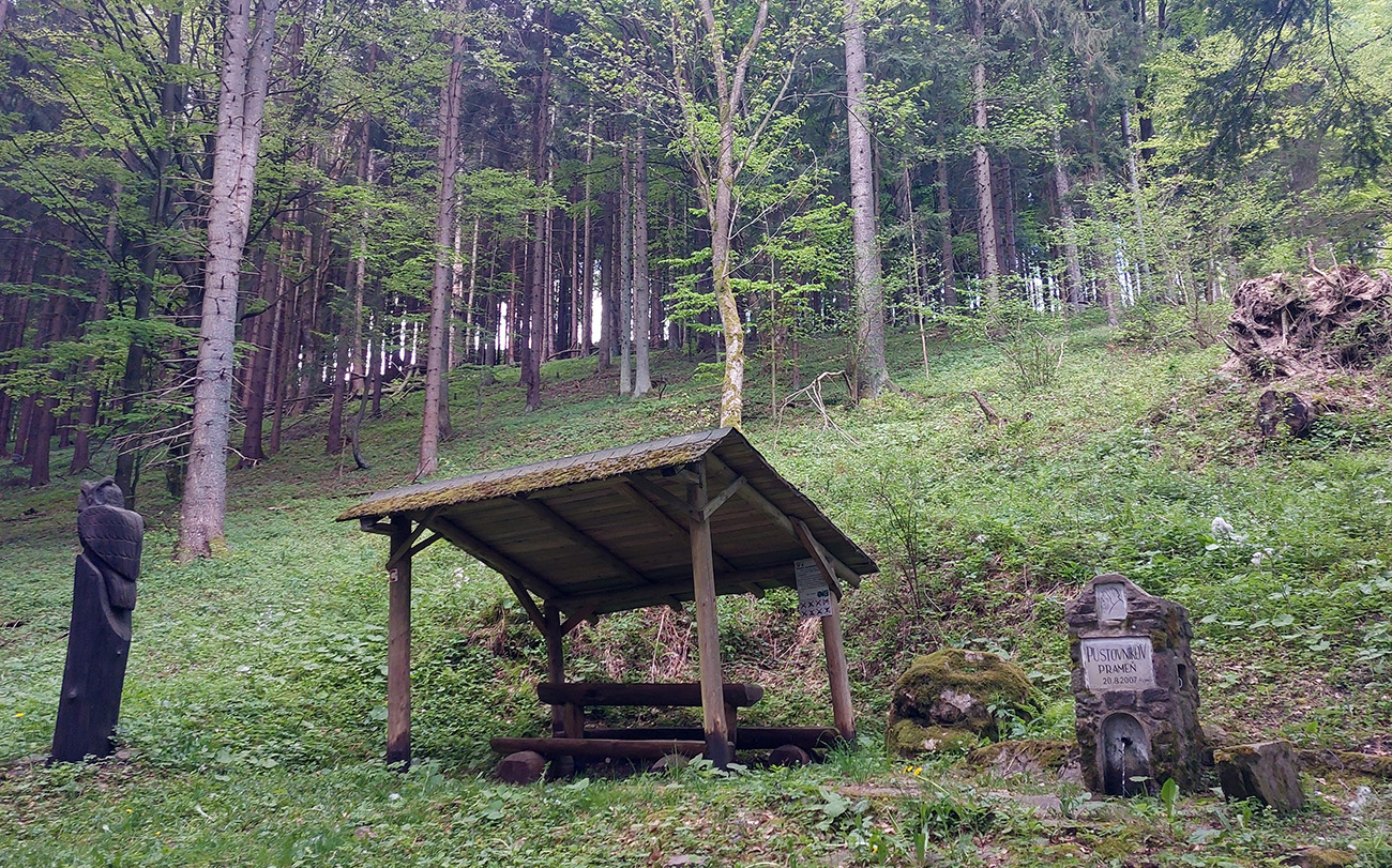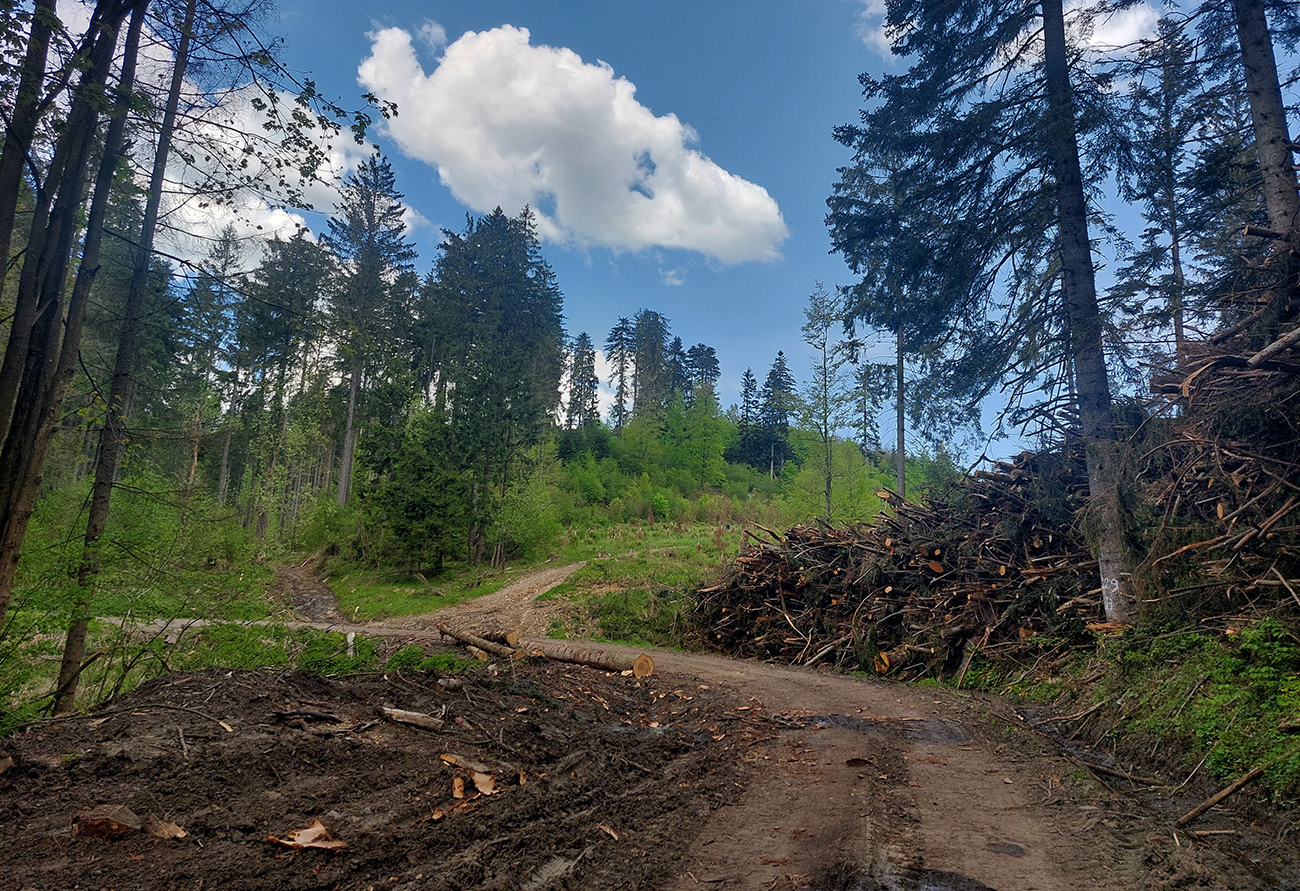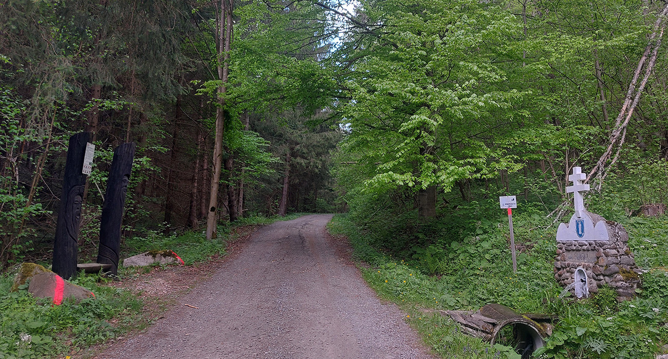 A to bol už posledný výšľap, pohodlný, rovný a dlhý. Najskôr po asfalte, potom po šotoline. Aj popri troch „filandovských“ upravených prameňoch, akurát sa mi hodili na dotankovanie. V doline sa podľa pohľadov na ťažkú techniku a kopy dreva dosť ťaží, no cesta v pohode.