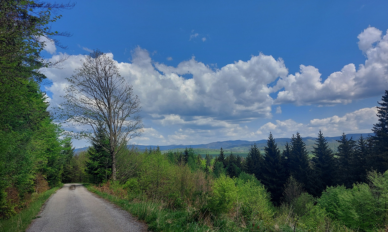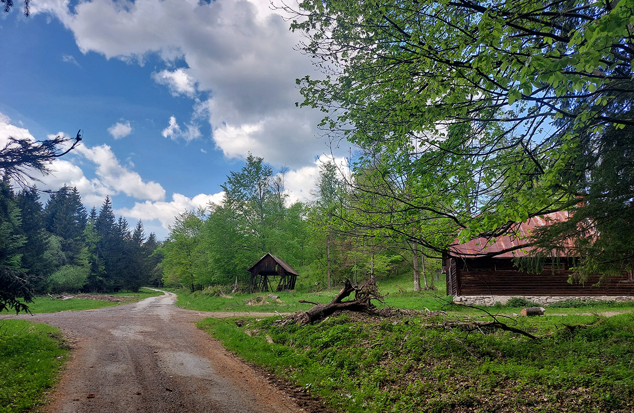 Za serpentínou v hornej časti doliny, pri lesáckej chate, pôvodný plán znel odbočiť doľava, smerom do zjazdu susednou Čiernou alebo Bielou dolinou a do Janovej Lehoty. Tam som aj vypol navigáciu, nech nefrfle, že som mimo trasy. Valil som ďalej rovno, už smer Sklené. Západným okrajom Kunešovskej planiny popod Vysokú a Guľatý vrch, po čoraz lepšej ceste, ponad muničné sklady už po žiletkársky hladkom asfalte.