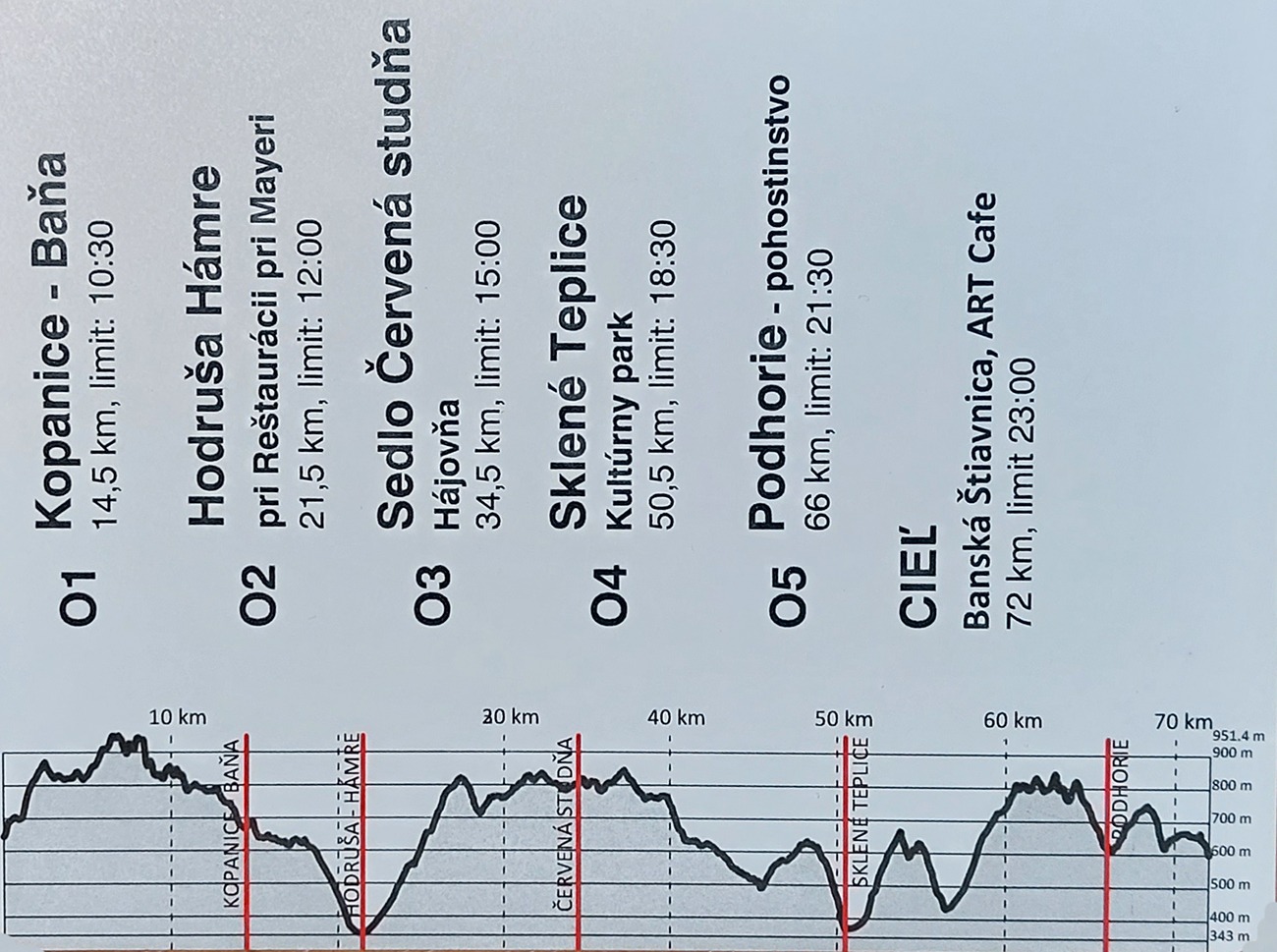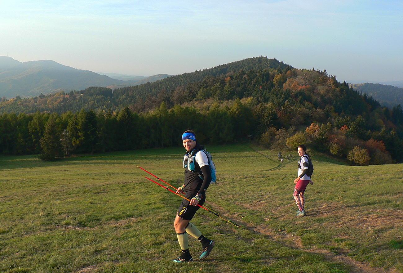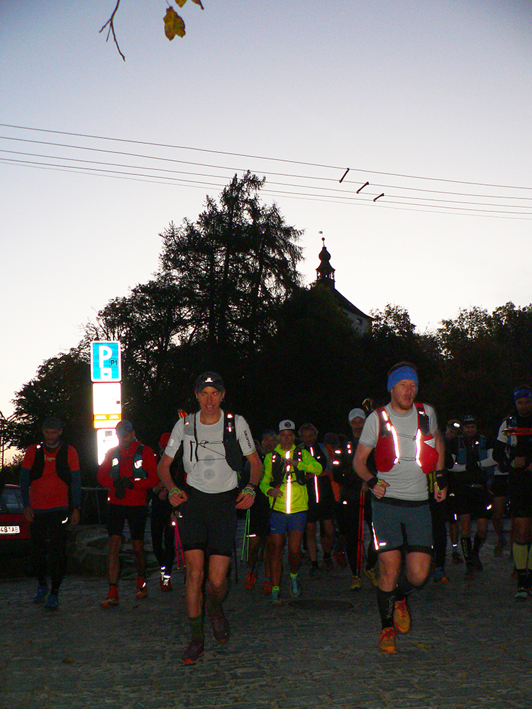 A tak sa koncom chladnej noci v sobotu 22.10. pozliezalo pod Novým zámkom nejakých 40 vybraných pozvaných a úderom siedmej sa popod štartovú (nie nafukovaciu, ale Piargsku) bránu vyrútilo v ústrety 72 kilometrom, 3200 vertikálnym metrom a piatim krmelcom. Trať sa podobala na takú pokrútenú osmičku – s prvým kolom menším a spočiatku viac zauzleným, potiahnutým na západ k Hodruši, s druhým väčším, natiahnutým na sever, za Sklené Teplice. Driek osmičky v sedle Červená studňa.