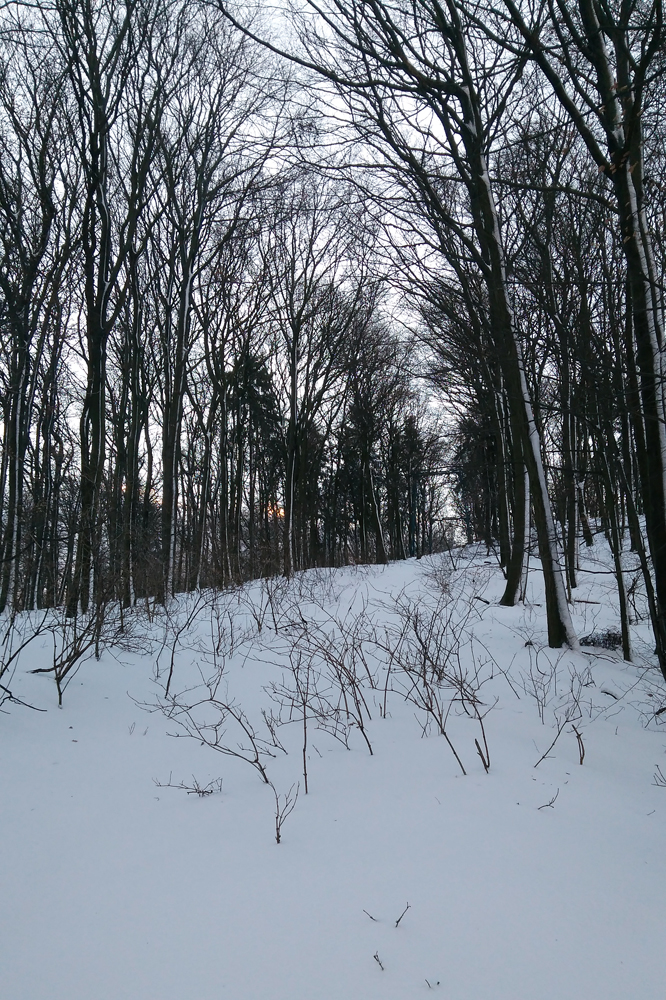 Sprobujeme teda vo väčšej aglomerácii, po návrate na Dunaj. Nakydalo tu das 25 cm mokrého, sľubne. V noci prituhlo a vietor sušil.... V nedeľu ráno sa chodí do kostola, ale nie každý do toho murovaného... Šaňo Luczy má taký obraz, aj Jano ho dobre poznal (autora aj dielo), kde sa vmontoval exteriér zasneženej prírody do interiéru kostola. Tak dáko to má byť, snažím sa do toho rámu vojsť aj s mojimi krátkymi nartami. Lenže v meste? Nástupy na túru sú tu iné, mechanizované... Takže autom na Kamzík, o pol ôsmej je tam prázdno, pár psíčkarov a zo šesť áut. Tento pokoj tu ešte tak hodinu a pol ostane, a potom to začne byť tá klasická masovka, ktorú hlásia aj v rádiu... Šak treba sprobovať nové sane a lopáre od Ježiška. Parkovacie miesto si najprv pekne odhrabem, aby sa mi dobre vchádzalo aj vychádzalo... Som ešte tá stará škola... Poriadna lopata musí v aute byť. Poslúži aj ako parkovací senzor, aby som až do lesa nehupol.