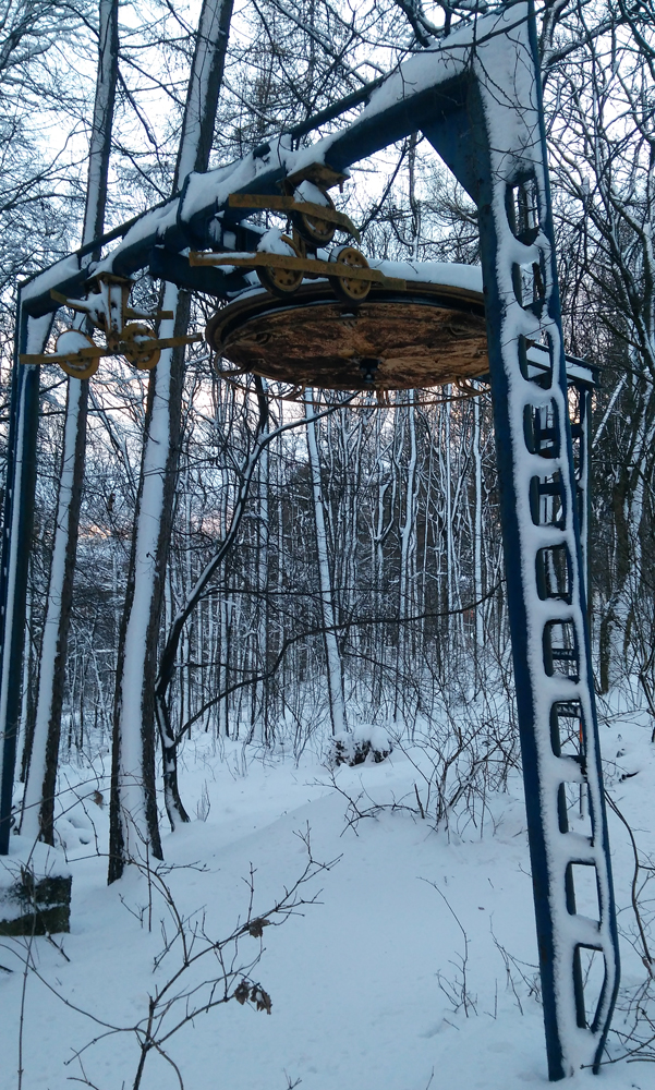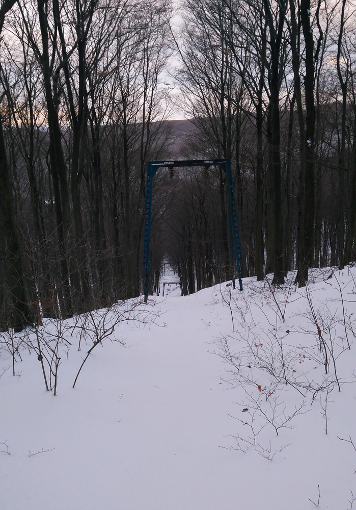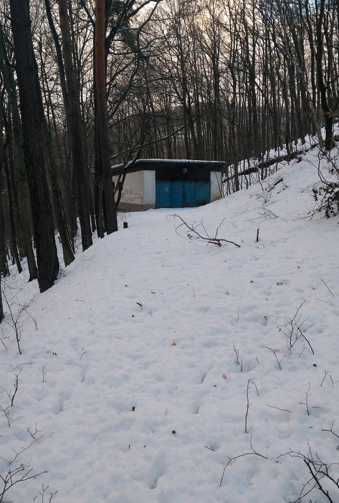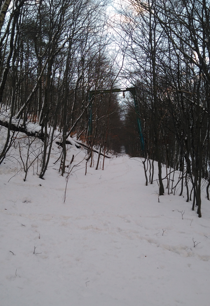 Idem lesom, borím sa ako ľadoborec Lenin cez kôru, dobrých 20 až 30 cm až ku tráve a bodliakom. A tu zrazu, už keď vidím ten cieľový svah, ledva že nie do stĺpa čelom dzignem... Boha, kde sa tu vzalo toto železo? V lete som si nič nevšimol... Ale to som zle pozeral, lebo práve križujem dráhu vleku. Fotky povedia samozrejme viac. Obzerám hornú vratnú stanicu s lanáčom, ale žiadny TUV ani DIN štítok s rokom výroby nenájdem. Tak musíte mi pomôcť a zaloviť v histórii, že odkedy je toto tu, Jano už žiaľ nenapíše priamo. Išlo určite o kotvový vlek s navíjacím lankom pre dve osoby. Zhora to vyzerá sľubne, 400 m lyžovačky. Realita je ale iná... Aj dole kopcom ledva idem, trojcentimetrová kôra vôbec nechce pustiť, stopa po mne vyzerá ako po Keňanovi, no utrpenie, taká jazda už dlho nebola... Po ceste obzerám, že na stĺpoch je aj osvetlenie na nočné lyžovanie! Dokonca aj žiarovka nerozbitá tam je, síce to už celé nefunguje a má silno muzeálny charakter, no ten genius loci tam ožíva stále. Dojazd k spodnej stanici vleku je lepší, betónkôra povolila, zo stromov popadala voda, namočila sneh, je to mäkké. Ani v stanici nič na datovanie...Na dva zámky zamknuté, sprejeri tu už boli tiež.