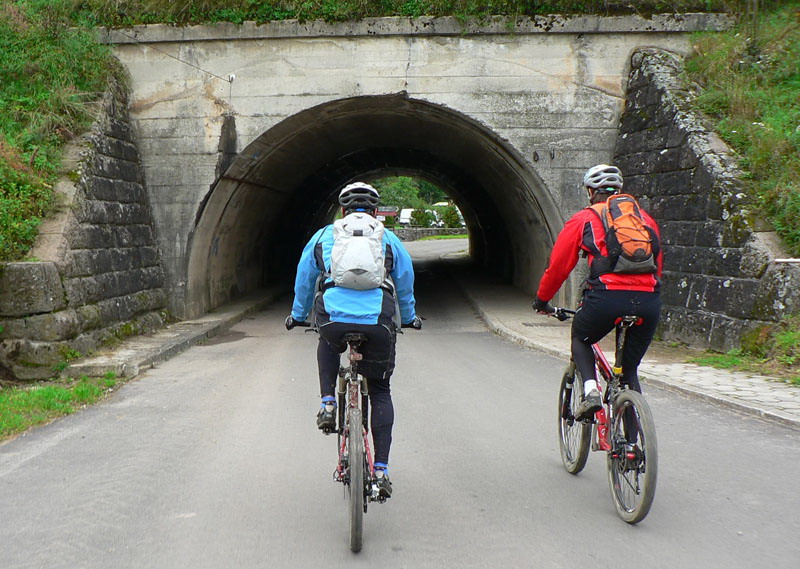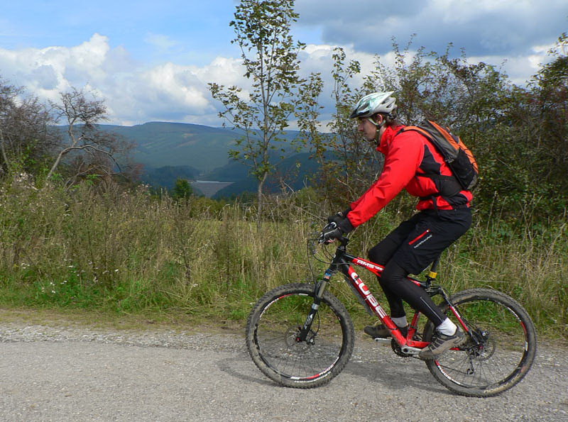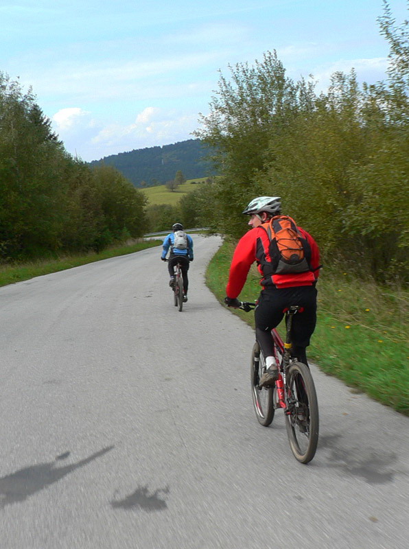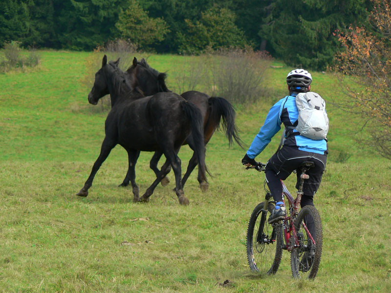 Celopéra ticho žehlia cestičku, ja na hardtaile drkocem reťazou aj kosťami a nestíham. Krahule - krížom cez zjazdovku, trochu asfaltu, stred Európy, znovu výhľad na nádrž a už po lúkach čvachtavých a od kráv rozoraných vydávame sa hľadať zvážnicu do Turčeka. Len tuším, v ktorom kúte lesa začína, a tentoraz tuším zle! Našťastie je to len krátka zachádzka a odmenou je jazda pomedzi kone a prehadzovanie cez elektrické ploty (Dejte pozor velebnosti!). Nakoniec sa cez tretí a posledný dnešný tunel rútime dolu do dediny, brzdy pištia, psiská zúria. Tunelom určite naschvál tečie potok parádnej, čistej vody, to aby si zaprasení bajkeri aspoň tie kravské lajná z kolies zmyli. Inak na tých zvážniciach fajne sucho bolo aj po nedávnych dažďoch, až sme sa divili. Pekný okruh to bol. Mapku vyrábať sa mi nechce, je tam ciest, že si každý vyberie.