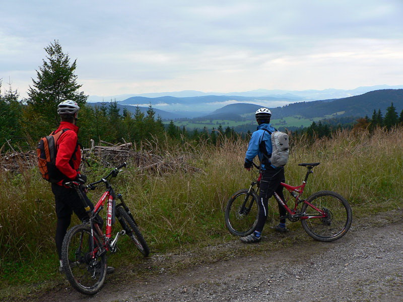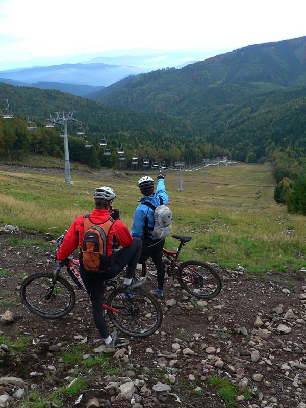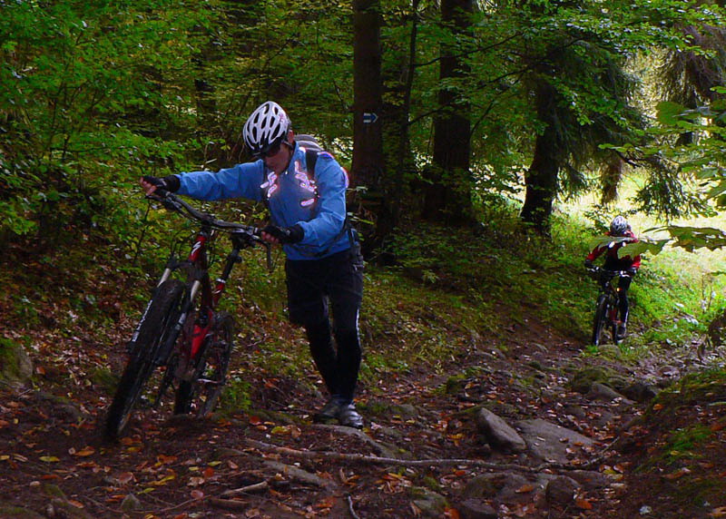 V Kremnických vrchoch je na mraky širokánskych lesných ciest s miernym stúpaním, ako stvorených na vykecávanie pri paralelnej jazde na bajku. Boli sme traja a niekde sme sa pohodlne vedľa seba vošli. Aj s pešiakmi sa dá pekne obísť, takže nenadávali, ešte sme aj s nimi hodili reč. Horšie je to pre tých, čo radšej singltraily a technické pasáže. Niečo sa isto nájde, ale treba poznať. Na jediný technickejší zjazdík na trase (od sedla Tunel) som chalanov nenahovoril, zdala sa im to dlhá zachádzka na Skalku.