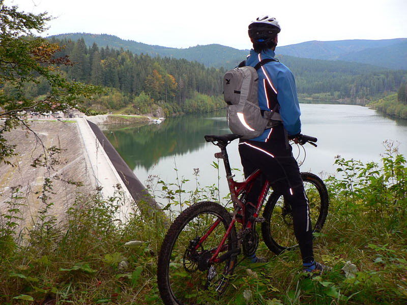 Začali sme klasicky v Turčeku pri krčme, a tak ako sme sa dohodli na tento výpad (neplánovane a náhodne), tak sme aj odštartovali – cez tunel, smer vodárenská nádrž. Veď intuícia povedie... Začiatok po modrej turistickej - trochu strmý, rozbitý a po šmykľavých kameňoch a koreňoch, techniku jazdy preverí (naša nič moc). Napájame sa na lesnú cestu po južnom okraji nádrže (modrá cyklotrasa aj turistická značka), pohodlne naberáme výšku, kúsok ideme aj po žltej, sem – tam z výšky trochu síce stratíme, ale inak sa plynule štveráme pod hrebeň. Od križovatky pri chate Obrázok začíname obchádzať Vlčí vrch, z jeho svahov sa vďaka rúbaniskám otvárajú výhľady nazad do Turca na lúky nad nádržou, o kúsok ďalej na Skalku. Krátky zjazd do doliny a križovatka bez značiek. Teraz kam?