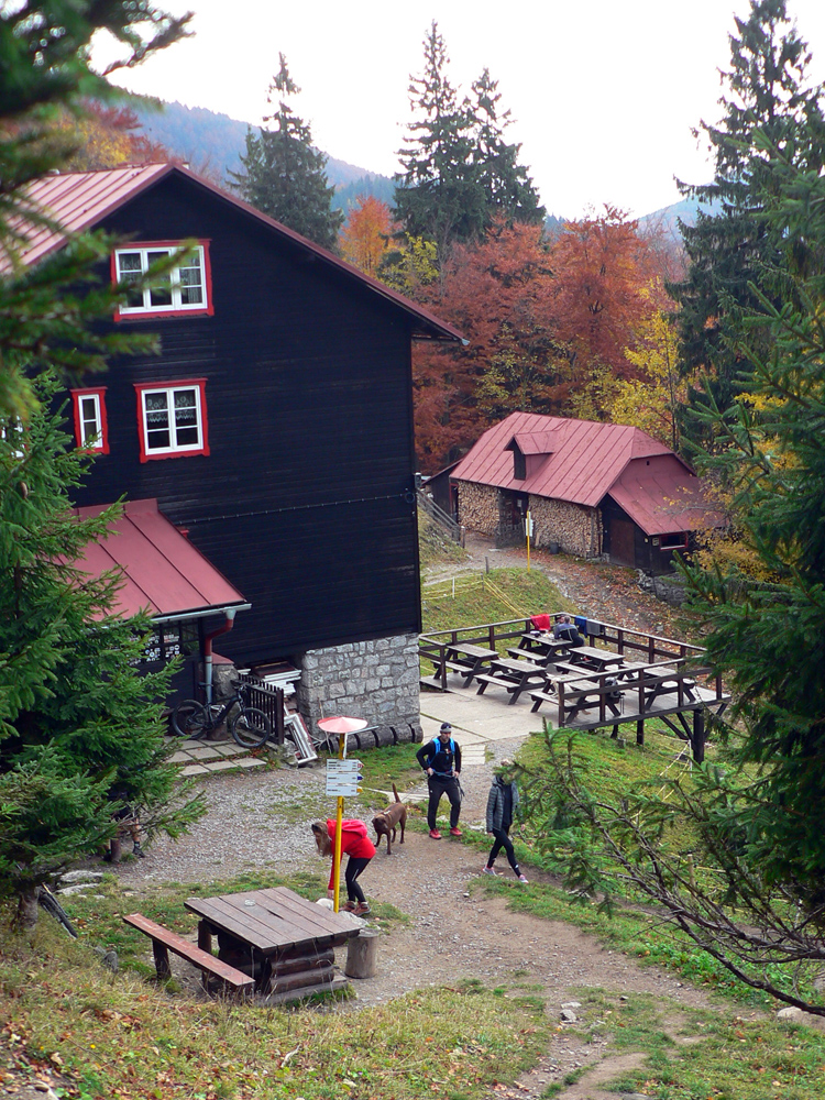 Podstatný je ešte prístup k chate, že? Najlepší, najkratší zo Strečna / Nezbudskej Lúčky po červenej cez Starhrad, podľa smerovníka za 2:45. K tomu 700 výškových ako bonus :-) Až po odbočku k hradu ide takmer stále s červenou pešiackou značkou aj zelená cyklotrasa. Potom je to na bajku (a v zime na lyžoch) cesta stále strmšou a hrboľatejšou dolinou, ktorou chatu zároveň aj „motorovo“ zásobujú. Na bajku je to poriadny brutus. Pohodlnejšia cyklotrasa vedie z Varína popod Jedľovinu. Z turčianskej strany je to od chaty pod Kľačianskou Magurou asi dve a pol hodiny. Priamo z hrebeňa, z vrcholu Suchého, je to dole necelá hodinka (opačne, strmo hore asi hoďka a pol).