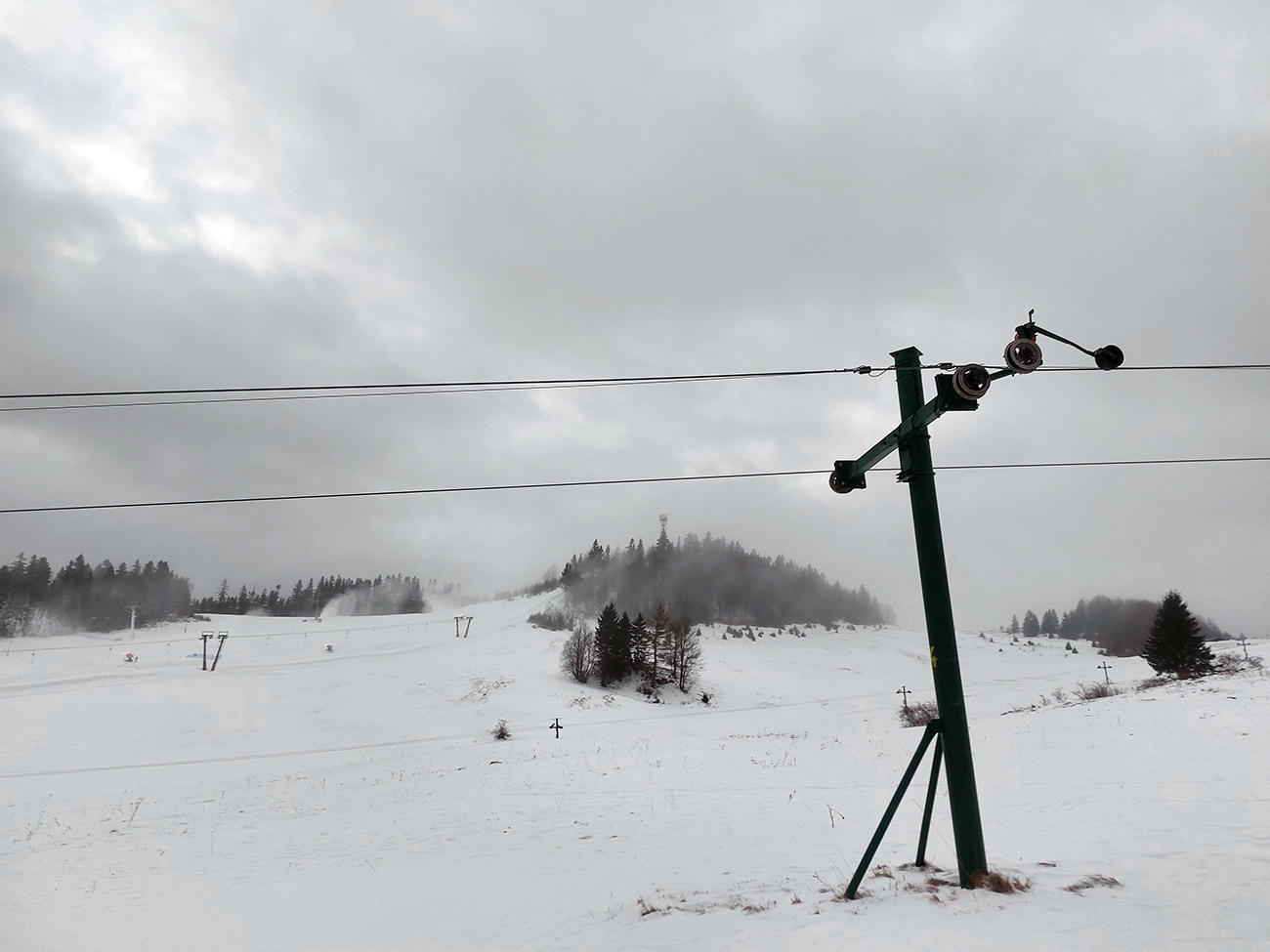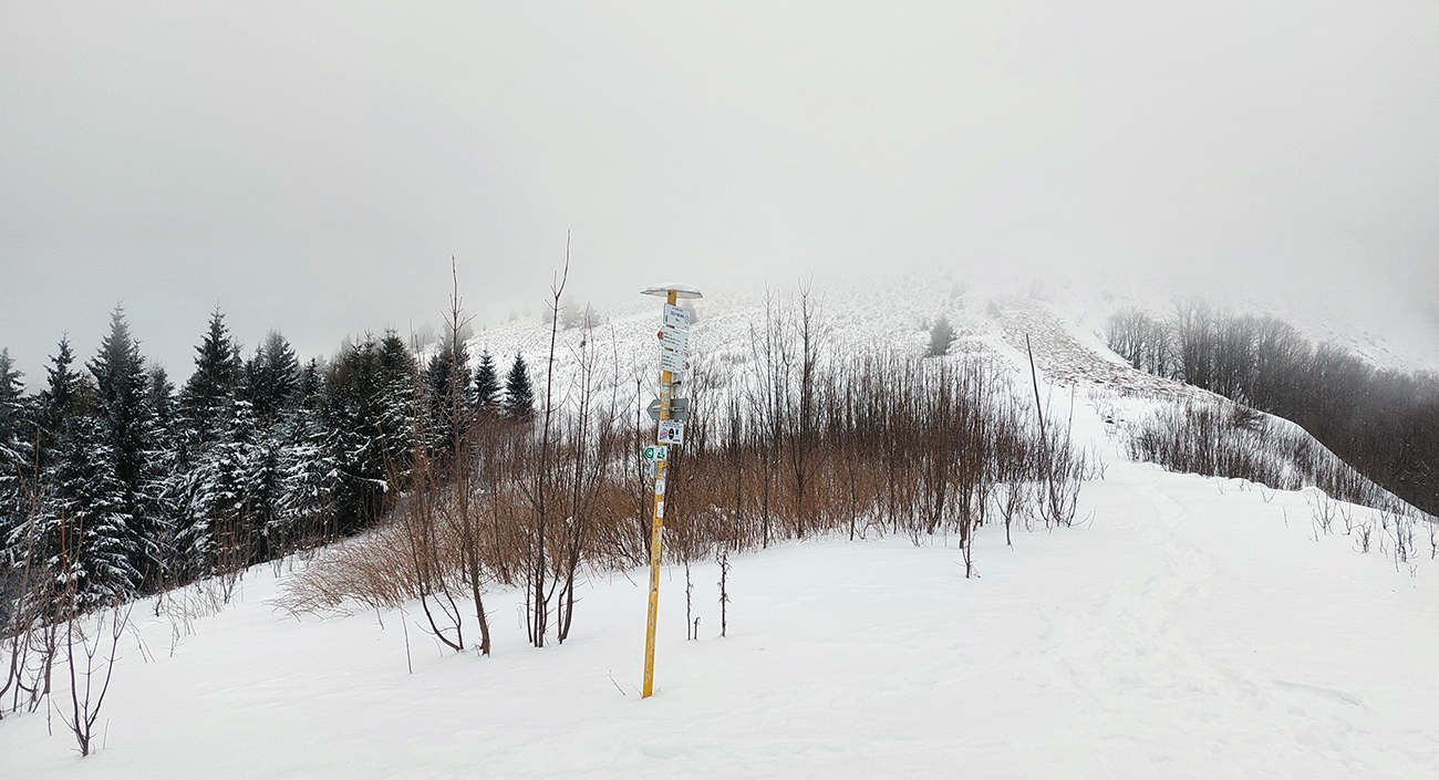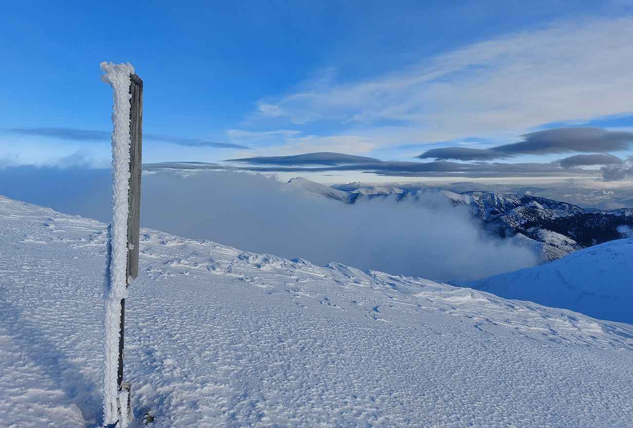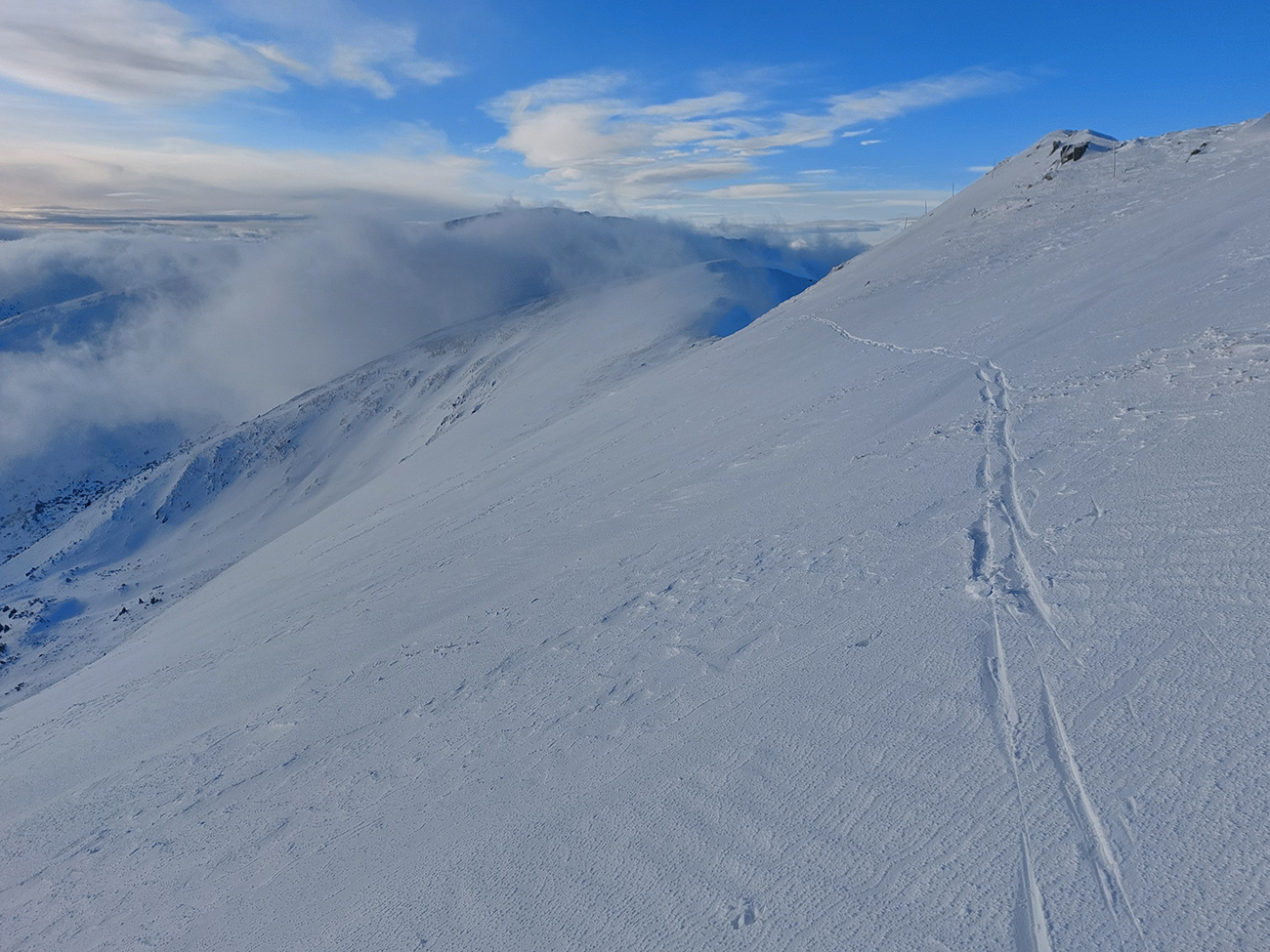 Stúpanie na Prašivú ma na pásoch bavilo len v spodnej časti, aj tam však bolo kameňov hojne. Potom lyže na batoh, inak by to ani nešlo. Aj nad lesom stopa len pre pešiakov, od pešiakov. Vďaka „predchodcom“ za komfortné schodíky a počasiu za posledné rozhľady. Do lyží som naskočil až hore v kosovke, kde sa sklon zmierňuje. Zároveň som ale vliezol do mlieka a jedovatého severáku. Pritom o kus nižšie to vyzeralo, že oblaky sú neškodne vysoko: