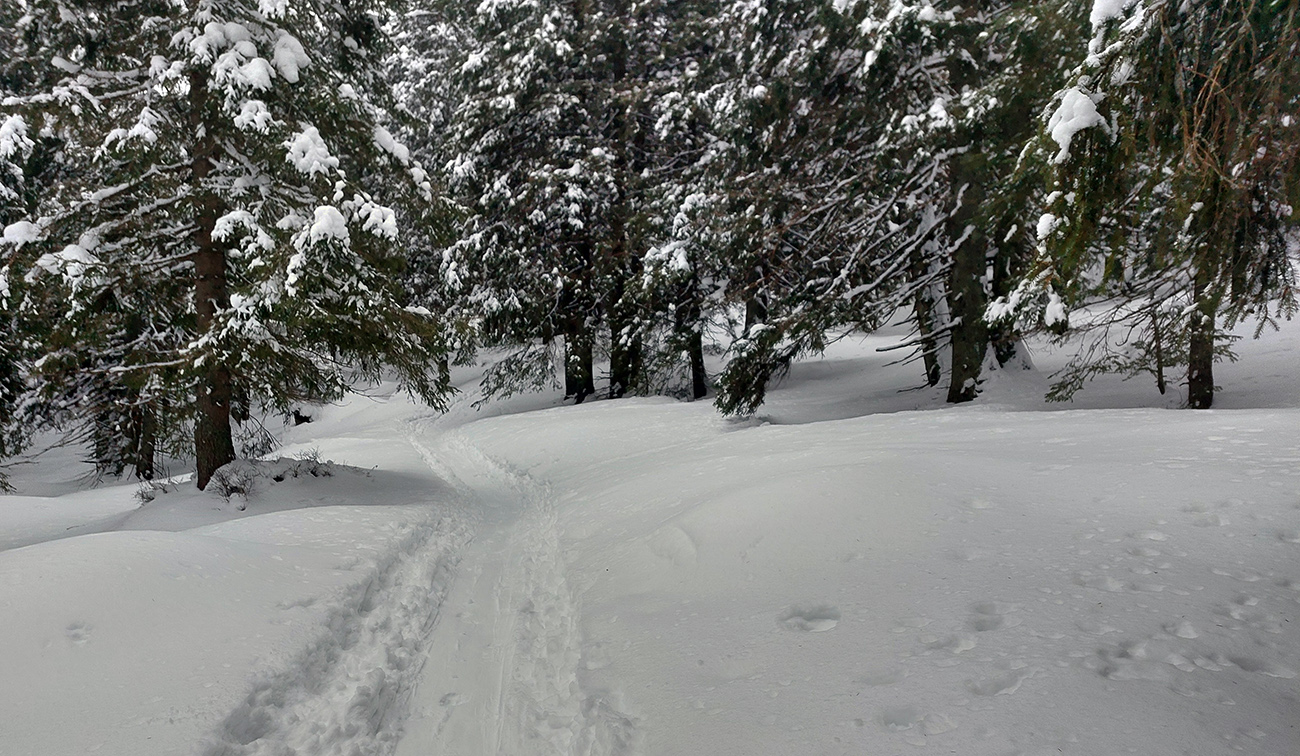 Hej bolo, lepší vietor fúkal. Aj pekné záveje naukladal. A dobre sa to prepadalo, poriadne hlboko. Našťastie aspoň čerstvé stopy po (asi) troch pároch snežníc sa dali občas využiť. Ale aj to len na kúsku medzi stromami.