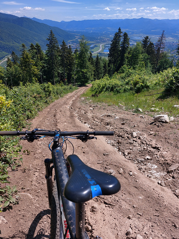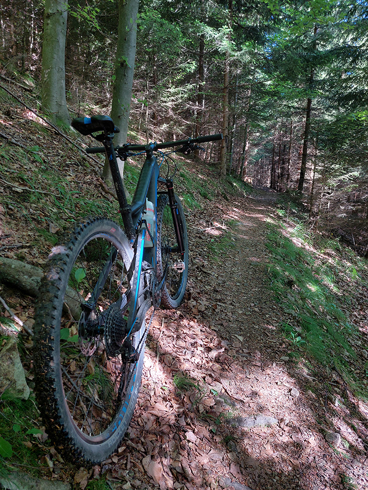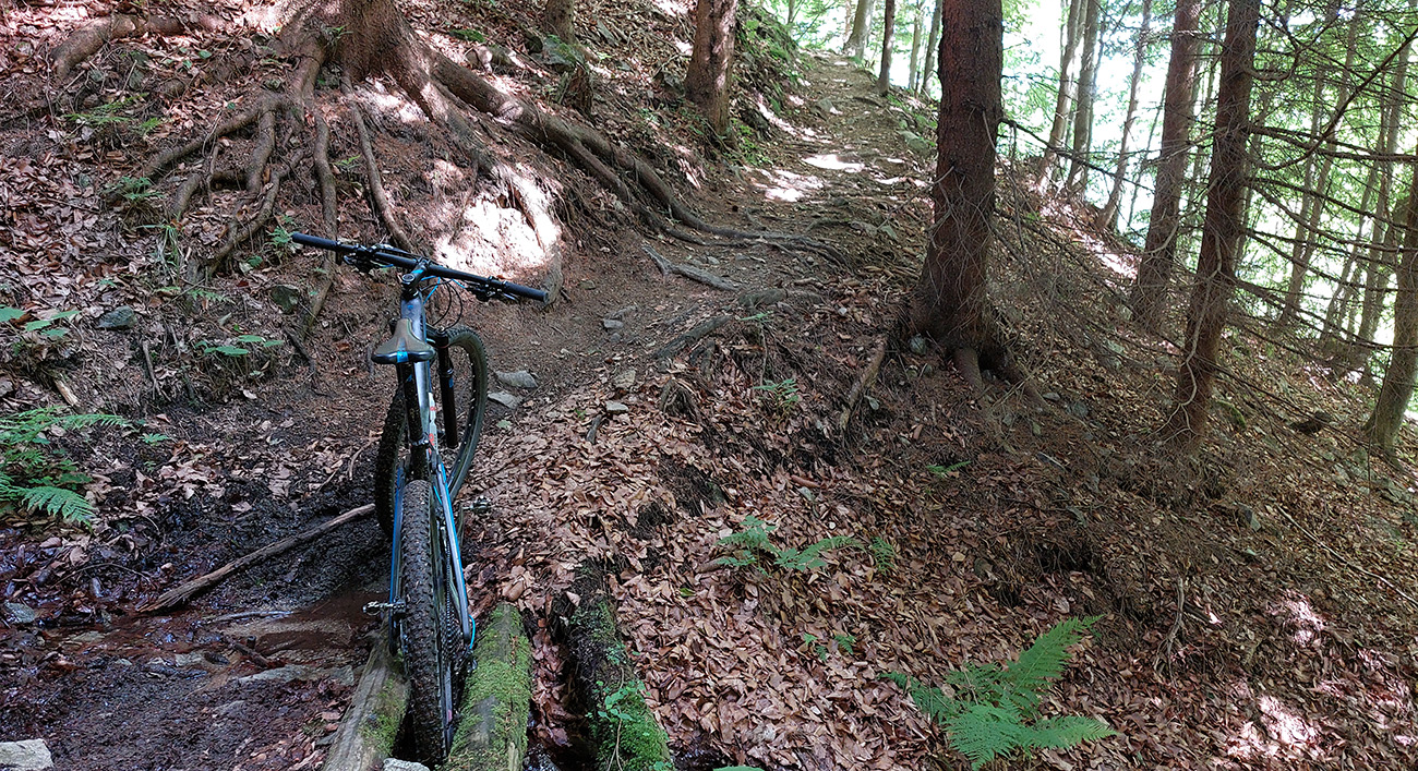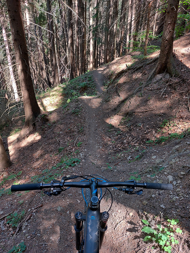 Potom v lese naopak krásny chodníček, aj na rúbaniskách s menším sklonom, kde je širší. Aj keď samozrejme oči v pozore držať treba, korene a kamene a schodíky rôznej výšky striehnu. Záver je momentálne síce trochu poznačený vývratmi a eróziou svahu, ale to len tesne pred výjazdom z trailu do sedielka pod Hoblíkom. Odtiaľ je na mape Vretenica značená priamo do doliny po zvážnici, ale bol by som blbý spustiť sa tade, keď paralelne vedie krásny singlík, navyše spestrený niekoľkými serpentínkami. Na ich spodku sa pripája Anakonda, tak som sa tešil, že si to dám dvakrát, lebo ten záver je fakt pekný úsek: