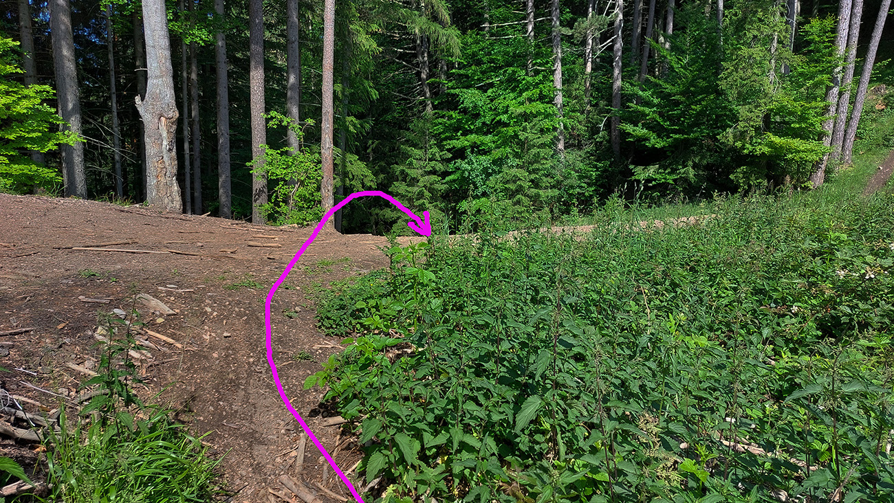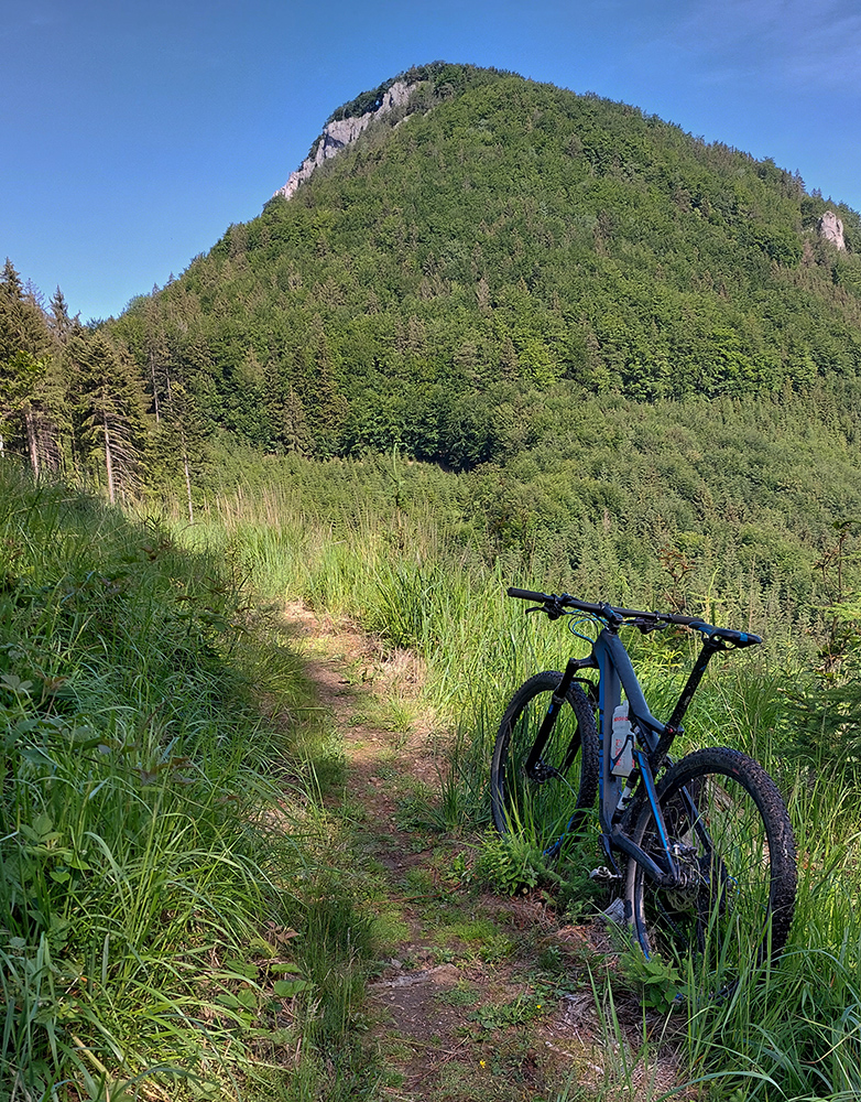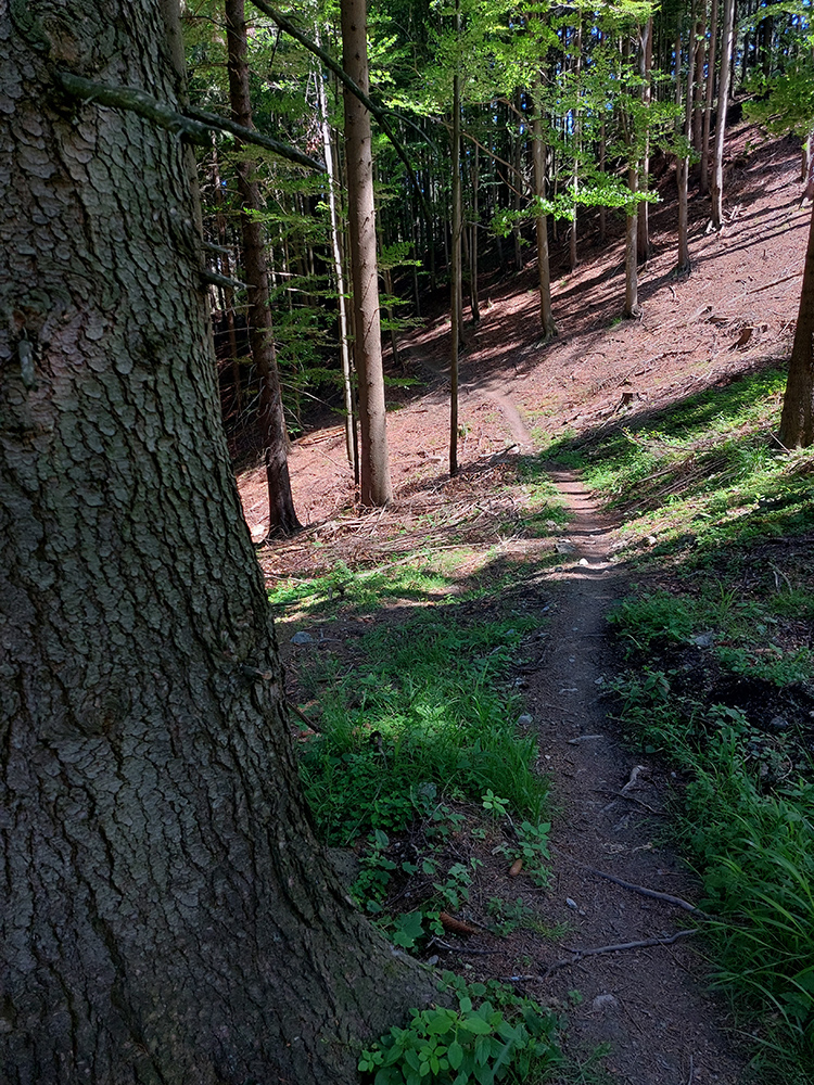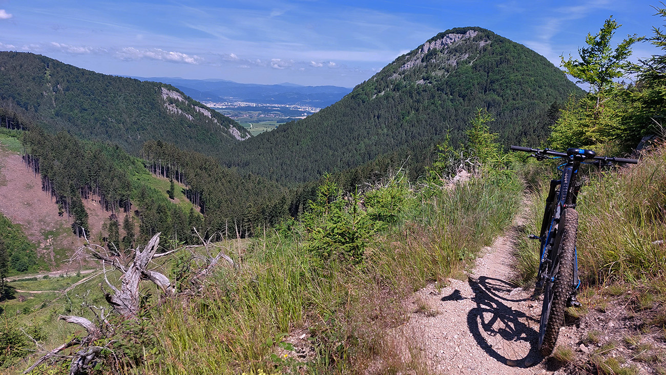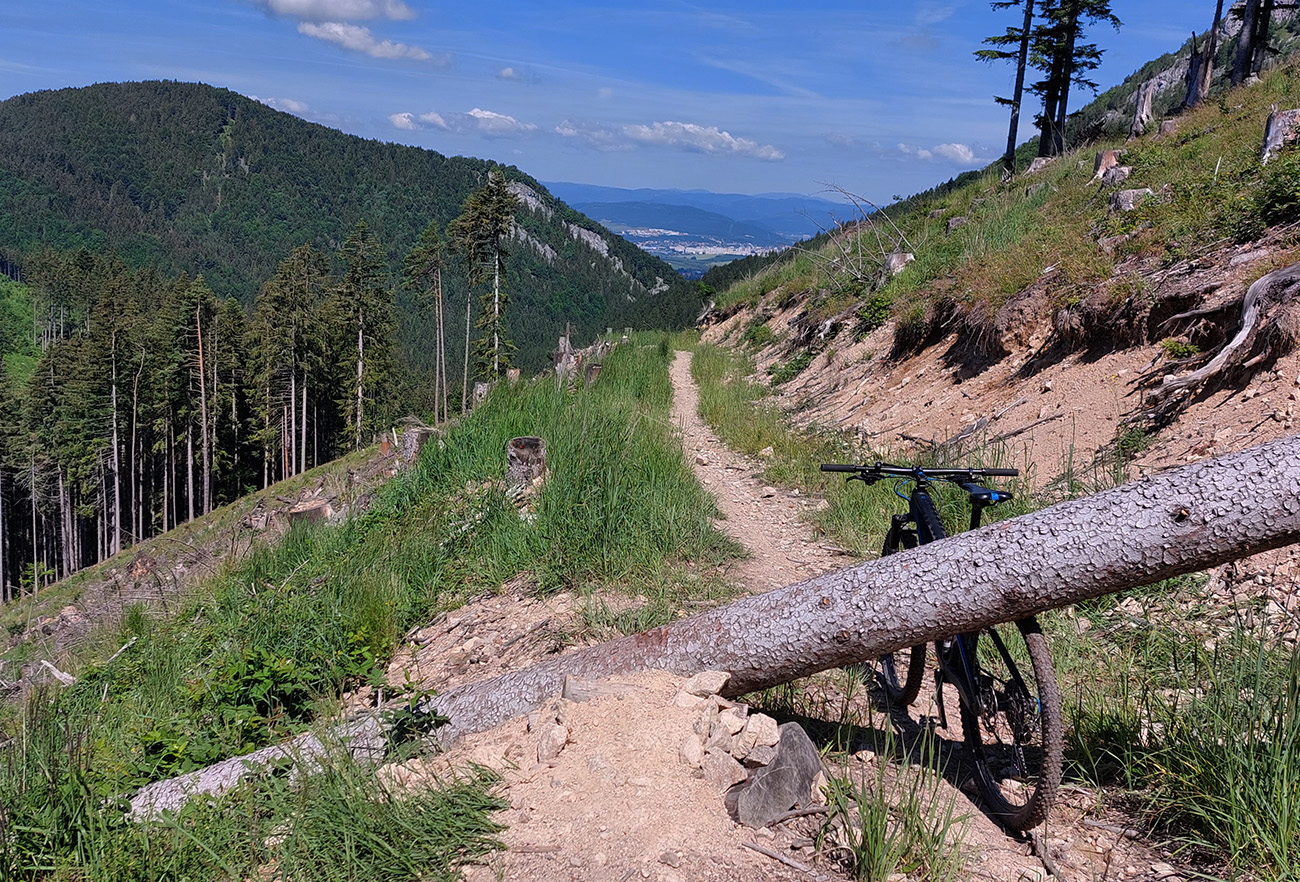 Vretenica prišla teda prvá na rad. Vjazd do nej môže (a možno aj má) odradiť. Ani nie tak to prehadzovanie bajku cez potok, skôr tá lezecká vložka za ním – ako schody do neba. Sú aj poriadne hrboľaté, nedalo sa nepotlačiť. Ani pokračovanie príliš neosloví: strmý svah na obrovskej rúbani, vďaka tráve niekedy až neviditeľný chodník, pritom „chudý“ ako vretenica po diéte. K tomu mierne jedovaté zákernosti, ktoré v tráve veľmi nevidno, a miestami aj šibačka konárikmi zľava – sprava. To tam, kde už stromky podrástli. Výhľady dopredu pomedzi Hoblík a Polom až za Žilinu si človek neužije, ale o tie tu nejde, že?