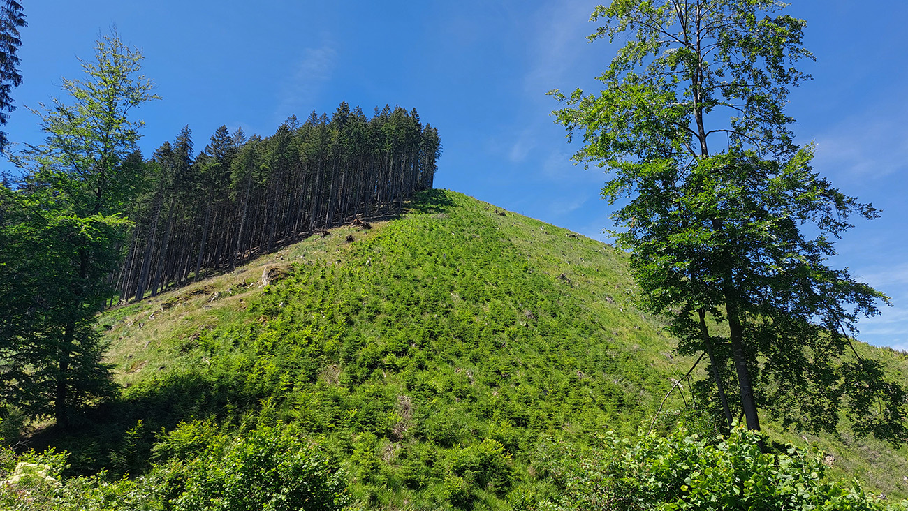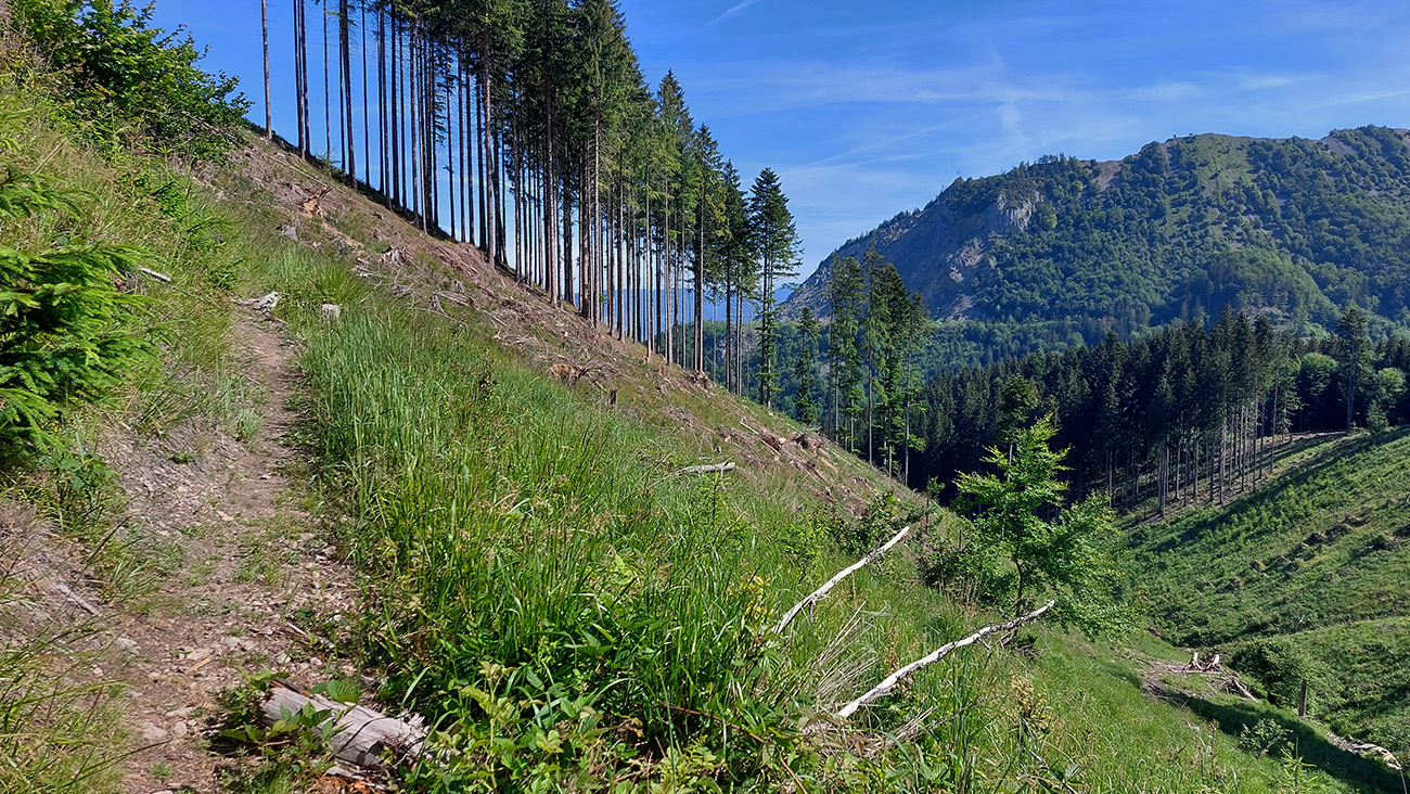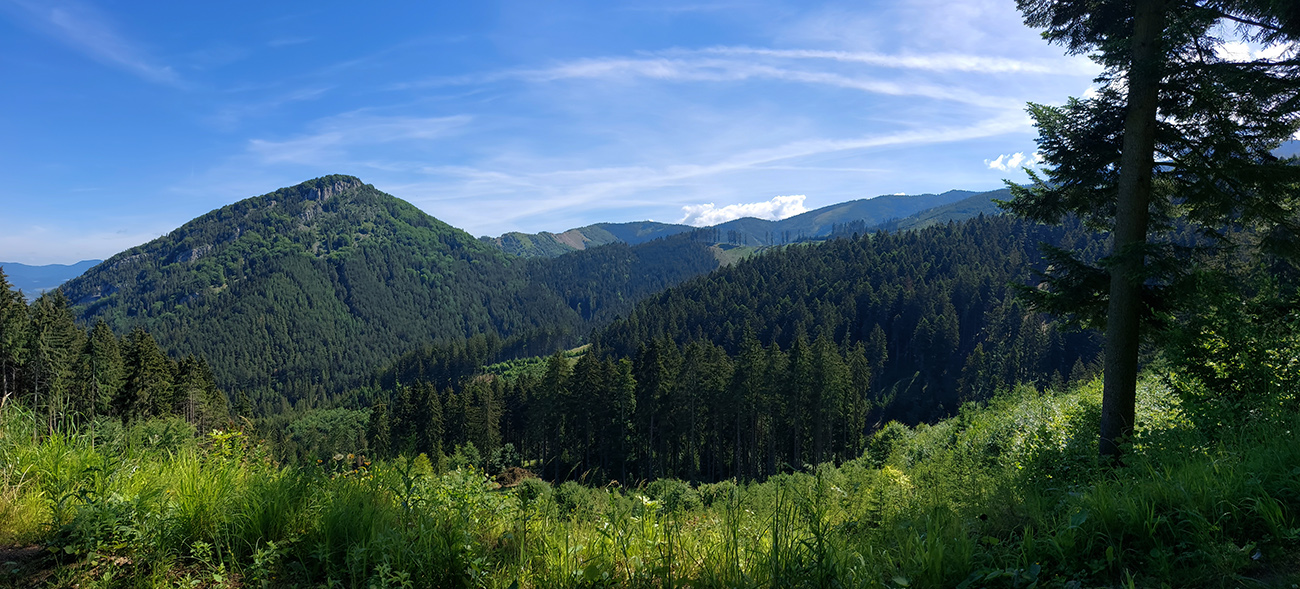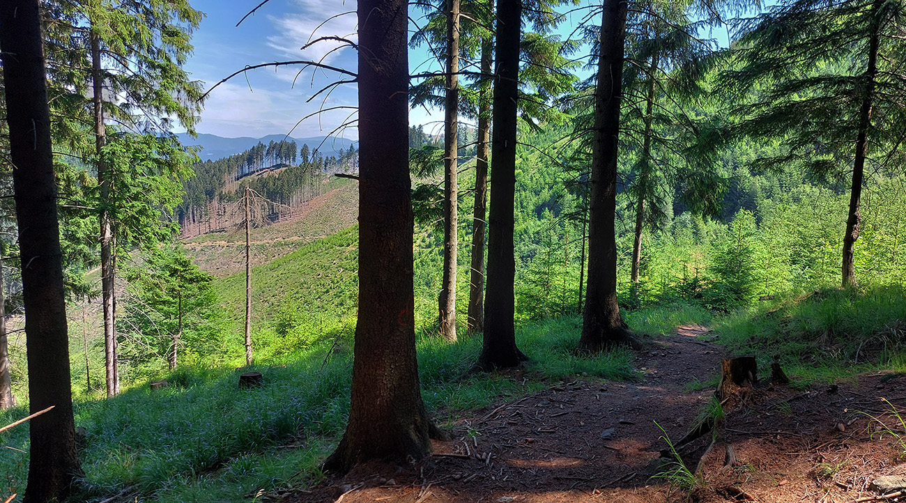 Vretenica prišla teda prvá na rad. Vjazd do nej môže (a možno aj má) odradiť. Ani nie tak to prehadzovanie bajku cez potok, skôr tá lezecká vložka za ním – ako schody do neba. Sú aj poriadne hrboľaté, nedalo sa nepotlačiť. Ani pokračovanie príliš neosloví: strmý svah na obrovskej rúbani, vďaka tráve niekedy až neviditeľný chodník, pritom „chudý“ ako vretenica po diéte. K tomu mierne jedovaté zákernosti, ktoré v tráve veľmi nevidno, a miestami aj šibačka konárikmi zľava – sprava. To tam, kde už stromky podrástli. Výhľady dopredu pomedzi Hoblík a Polom až za Žilinu si človek neužije, ale o tie tu nejde, že?