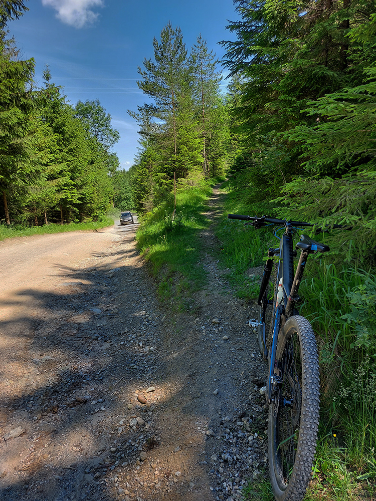 V sedle Javorina, ako vieme, stúpanie nekončí - to najstrmšie na záver, našťastie krátke, pri troche chcenia sa dá dať, len treba nohy mať. Nie môj prípad :-) Za Saračníkmi naopak najstrmší zjazd, aby som si to skrátil po zelenej turistickej – len smola, že po takej rozjazdenej spádnicovej zvážnici, že ani nie hlina, skôr púder tam bol – nebola šanca brzdiť, vrchná časť pešovačka popri bajku. Ale potom už lepšie ako po vyššie položenej cyklotrase – rovnejšia a suchšia cesta, nedošiel som dole čerstvo bodkovaný. Ale aj celkovo sa mi to napriek varovaniu z úvodu celkom vyplatilo. Inak lepší prehľad možností a postrehov z „hadích trailov“ (lebo od odborníkov na takéto jazdenie) je na stránkach Mountain Lovers TU a na MTBikeri TU .