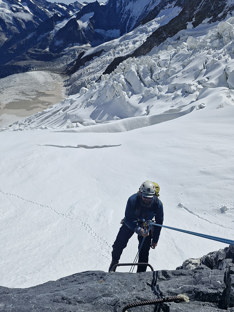 Rampa: Keď sa blížime pod druhý serak, stopy sa rozdelia. Prirodzene vyberáme tú menej ohrozenú. Ukáže sa to ako chyba, a chvíľu nám preto trvá, kým nakoniec nástup do lezeckej dĺžky nájdeme. Je to nitmi dobre odistená platňa za IV, a pre ašpirantov na hrebeň Mittellegi vraj slúži ako kanárik. Ak vylezieš toto, na hrebeni by už mali byť len ľahšie problémy. Ok, trochu ma v nej síce poklepe, ale je suchá, nitov je v nej dosť, spoďáky berú a i na nohy vo vibramkách sa vždy nakoniec nájde niečo rozumné. Mám dobrý pocit. Rýchlo dolezieme i druhú, už triviálnejšiu dĺžku, zbalíme lano a terénom za I-II sa vydáme nie celkom viditeľnou rampou po úzkych chodníčkoch krížom stenou, ponad ktorú sa tiahne hrebeň Mittellegi. Chata je teraz dlhšie schovaná za horizontom, občas poblúdime, a pri pohľade dolu stenou nevznikajú žiadne pochyby o tom, ako by prípadný pád skončil. S si ale cestu pochvaľuje a moje obavy preto pripisujem hlavne spánkovému deficitu. A tomu pravidelnému hukotu od padajúcich serakov, ktoré ma vždy vystrašia. Sústreď sa kámo, je to choďák, stačí nezakopnúť.