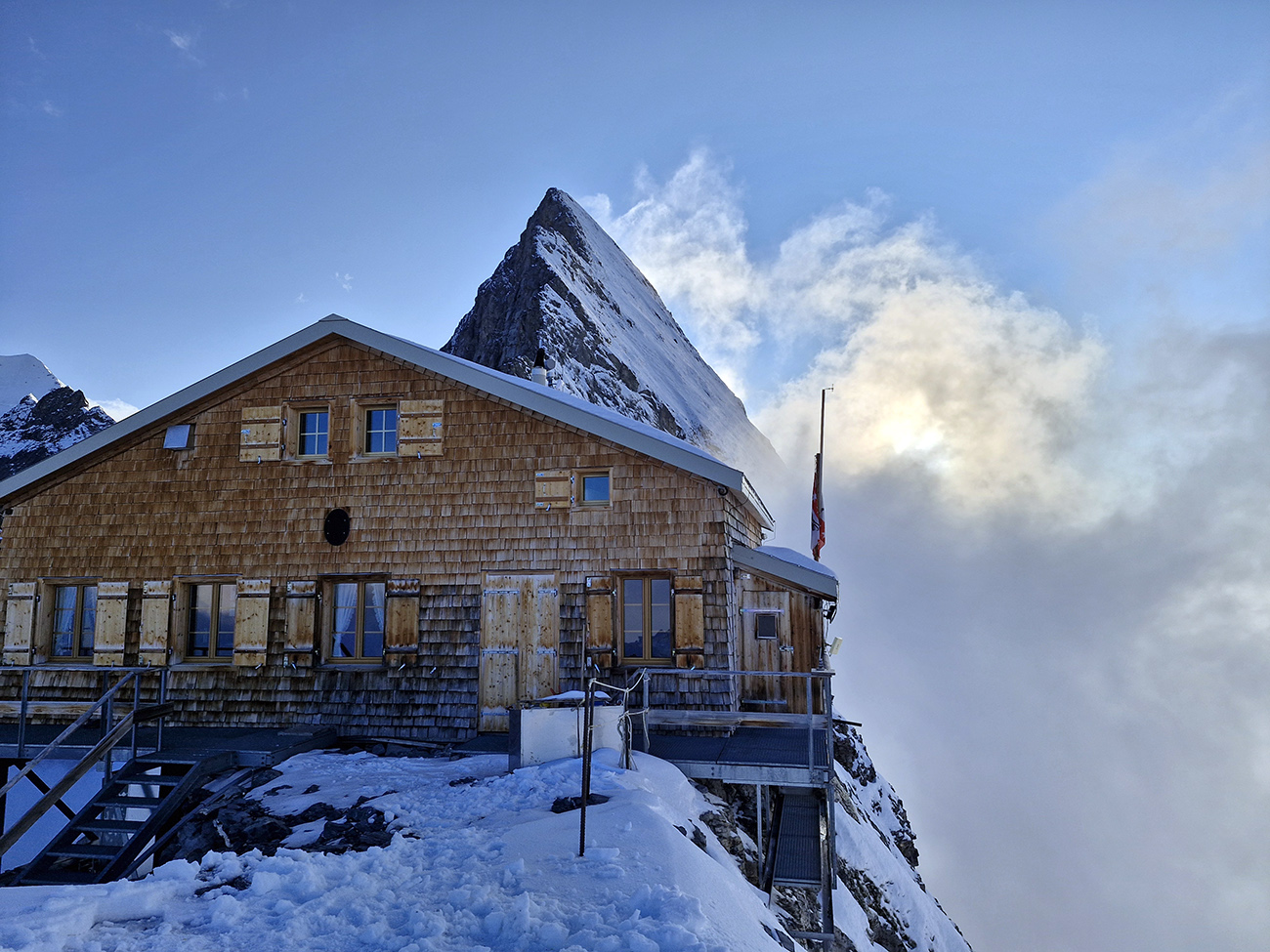 Večer som si predstavoval trochu ináč. Výstupový hrebeň Mittellegi na Eiger vyzerá na veľa miestach zasnežene, zostupový južný je pod snehom komplet, a namiesto vysedávania v teple a ťahania rozumov od chatárky preberáme zajtrajší deň popri topení snehu len s rovnako (ne)skúseným párom. Mobil radšej vypínam, aby som ušetril zbytok baterky, a internetové múdra sú tým pádom už nedostupné. Som skeptický, ale možno som len hladný a unavený. A skutočne, po tých biednych cestovinách s pestom ma skepsa prejde, a namiesto toho nasajem optimizmus mladého páriku. Koniec koncov, nikomu z nás sa nechce vracať sa naspäť tou rampou, a najmä tým nebezpečným rebríkom, nie?