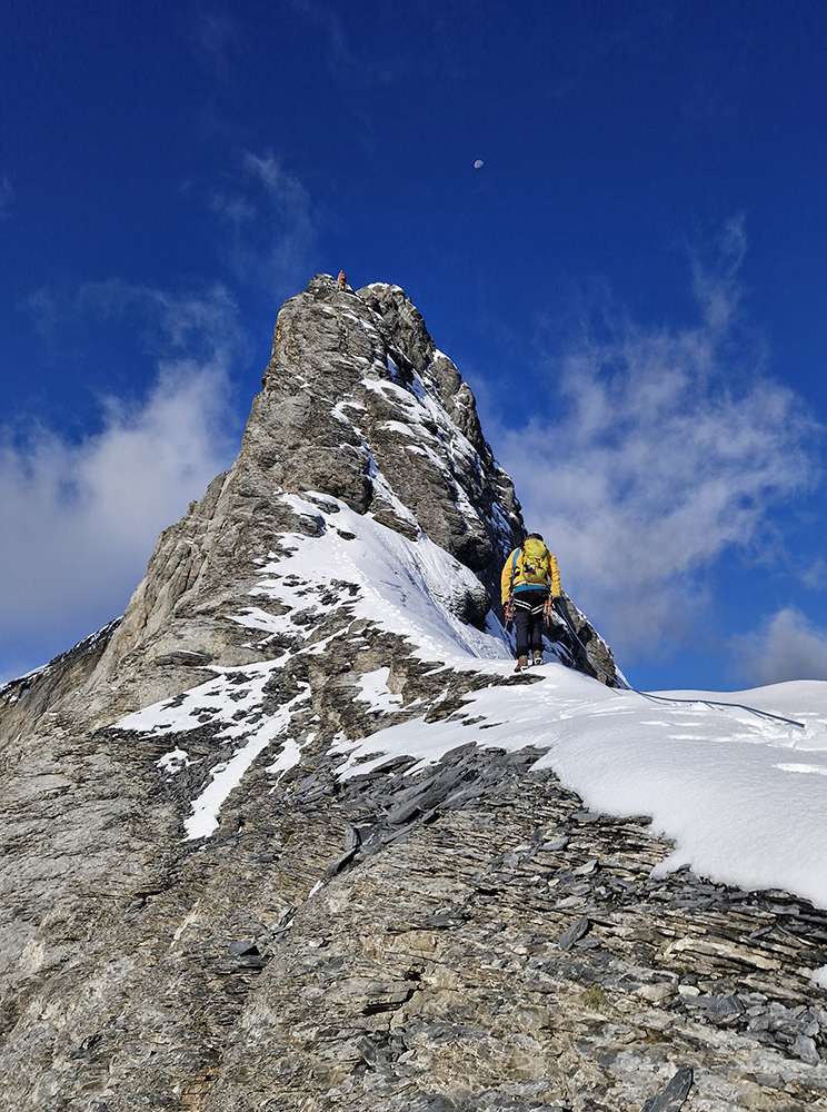 Dopoludnie: Vychádza slnko, vypíname čelovky a pokračujeme hrebeňom. Horizontálne úzke úseky sa striedajú s lezeckými pasážami. Snehu pribúda v oboch, ale väčšinu stále lezieme simultánne. Keď sa objavia prvé fixy, mladí nám trochu odlezú na jednu - dve dĺžky. Vzájomná komunikácia trochu ustane, zato však postupne tvrdne terén. Viac a viac si netrúfame liezť simultánne, a i hľadanie vhodných miest a budovanie vlastných štandov zaberá čas. I cesta naspäť na chatu je každým ďalším výlezom uzavretejšia. Prestávam trochu vnímať, ako rýchlo sa slnko presúva po oblohe, sústredím sa na lezenie. Väčšina ma baví, občas je náročnejšie. Každú chvíľu vyhliadam, kedy nám prvý párik zmizne zlaňákom z Grosser Turm, ktorý má veštiť záverečný výšvih na Eiger.