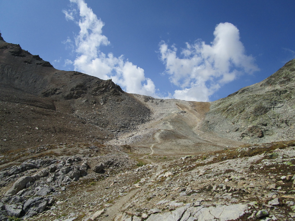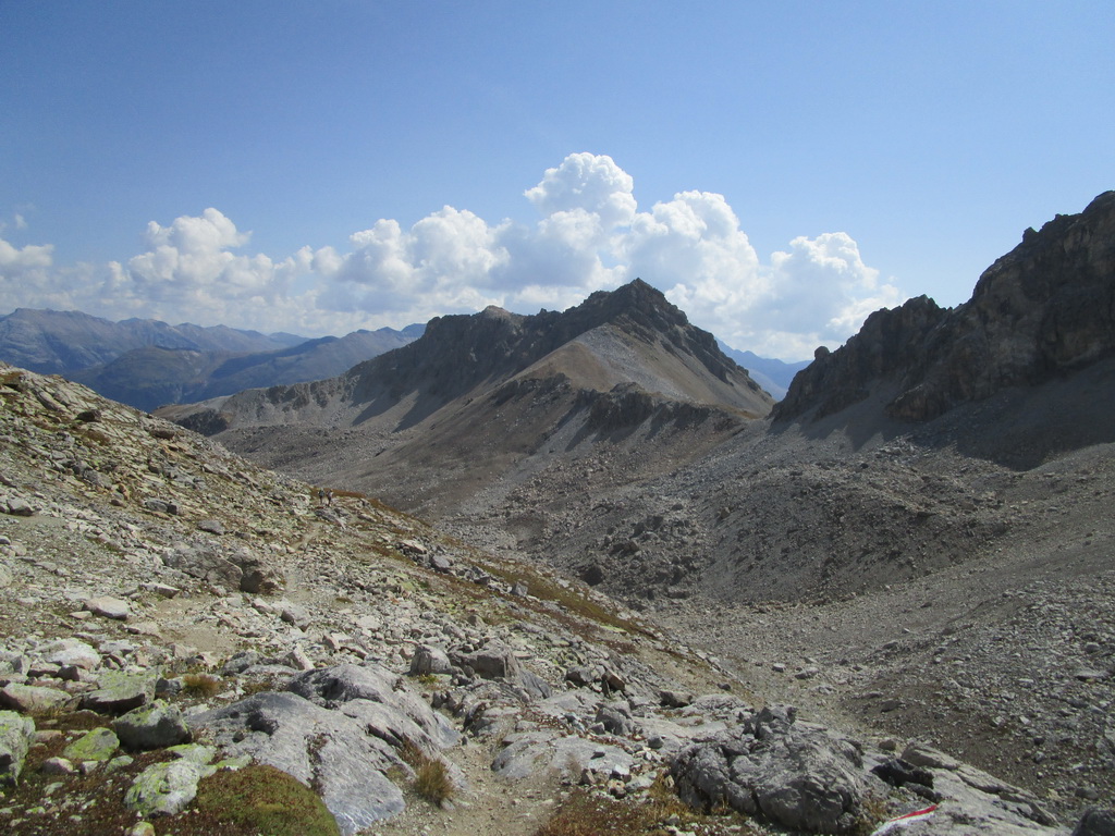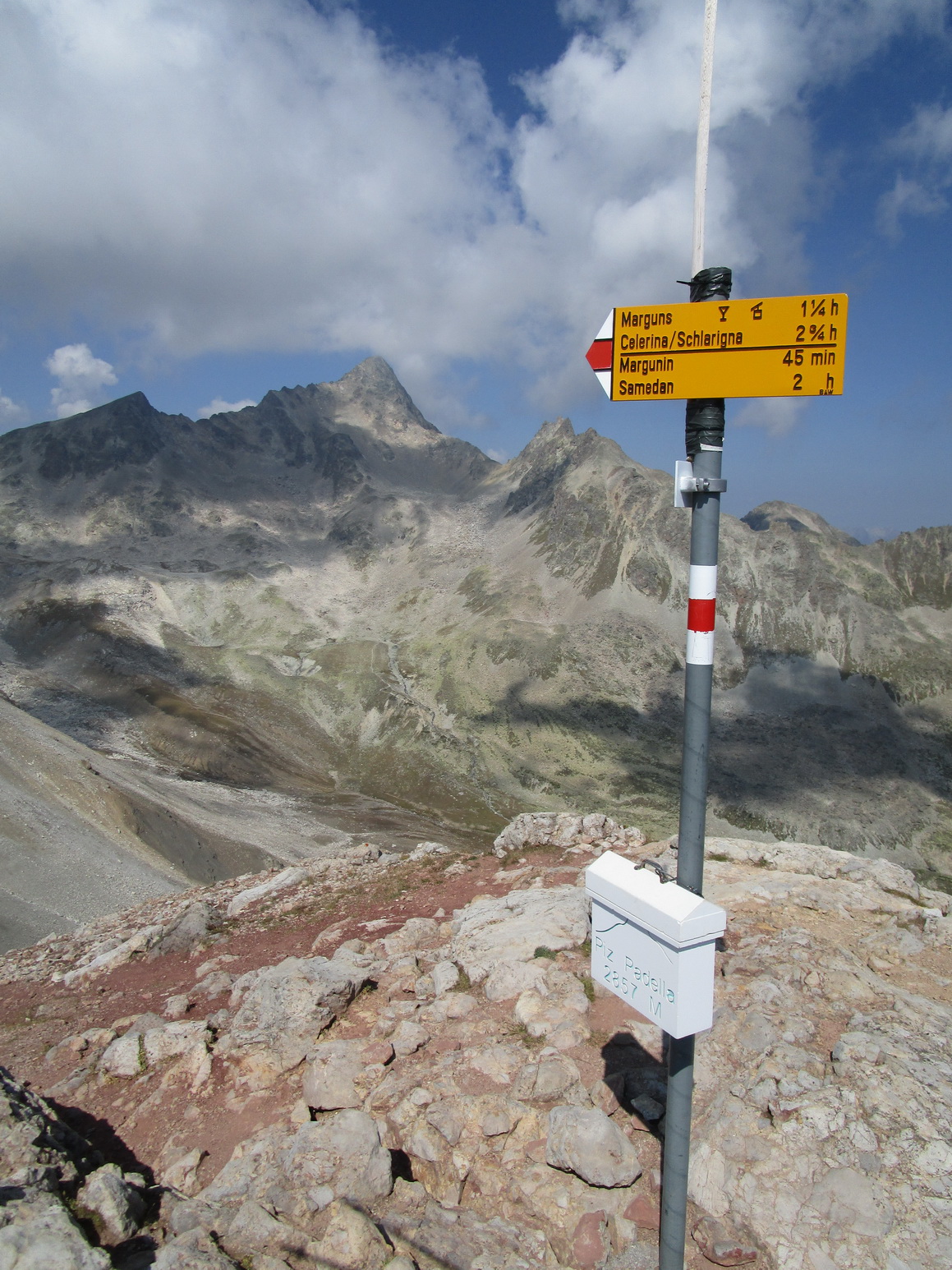 Po vyše 1000 výškových metroch neustáleho stúpania som sa dostal na vrchol Padella (panvica). Pofotím si parádne výhľady a plánujem čo ďalej. Keďže nemám problém, tak zbieham z Padelly dole do ústia doliny Valletta da Bever po značkovanom chodníčku. V závere klesania sa z chodníka odpájam a intuitívne nachádzam skaratku v suti. Dolinkou sa už opäť napojím na značku. Tadiaľto sa jazdí aj na bajkoch zo sedla Fuorcla Valletta.