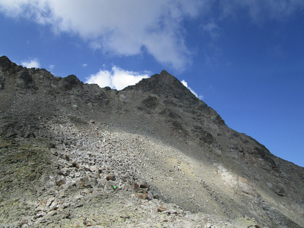 Pod sedlom ale už nasleduje odbočka smer Piz Ot. Modrou značený chodník bez nejakých väčších obtiaží vedie až na vrchol. Stretávam dokonca zopár ľudí, ako som neskôr pochopil, tí ľudia sem prišli v smere od lyžiarskeho strediska Corviglia. Sedačka Les trais Fluors premáva aj v lete a ňou sa dostanú až takmer pod sedlo Fuorcla Valetta.
