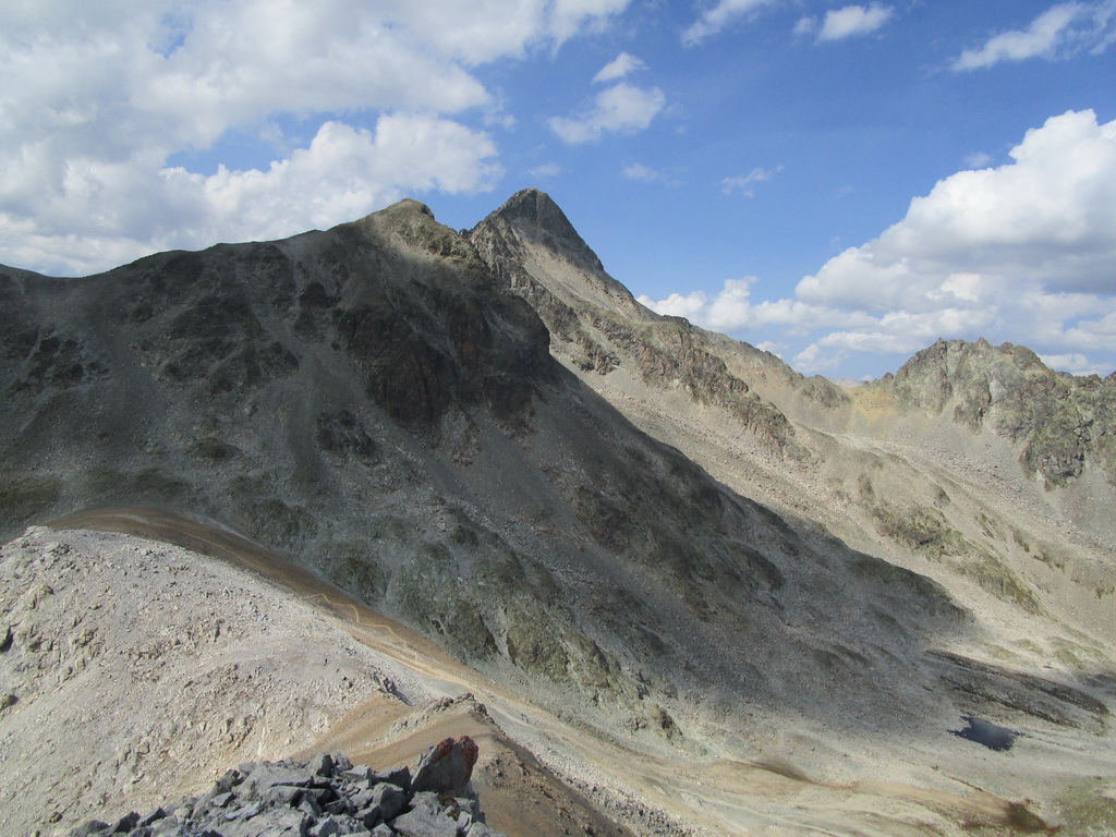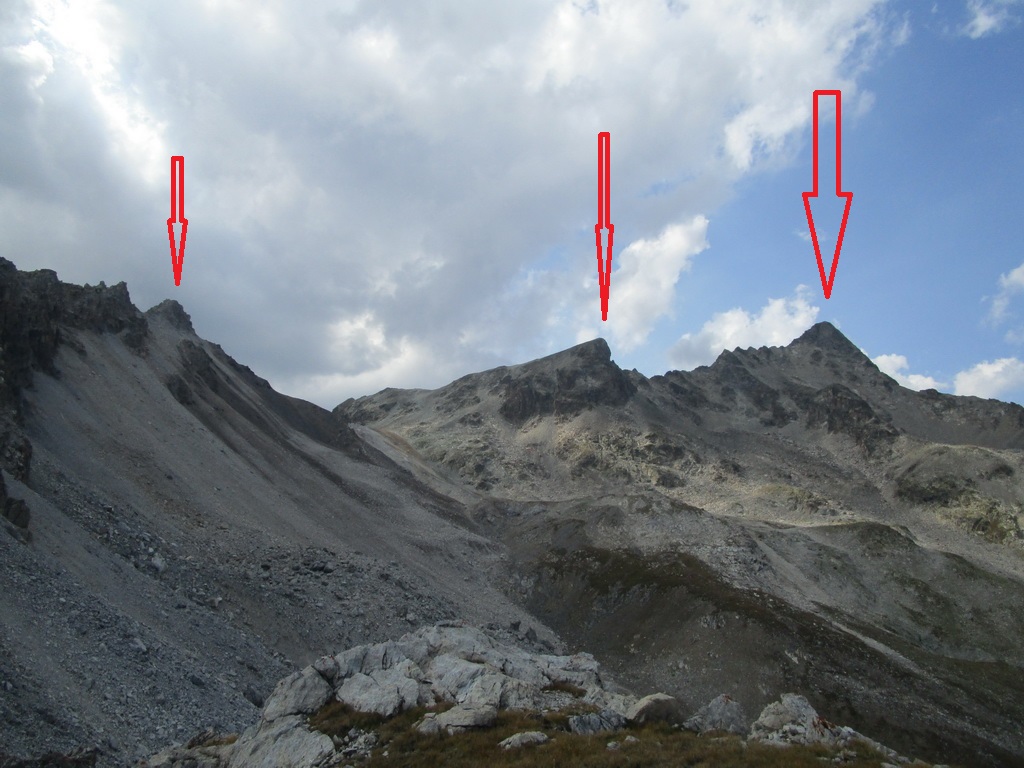 Potom, čo som sa nabažil výhľadov na okolia z vrcholu, zostupujem dole a rozmýšľam, čo s načatým dňom. Zo sedla Valletta vystúpim znovu pomerne ľahko, ale teraz už neznačkovaným terénom, na vrchol Piz da la Funtauna 3092 m. Odtiaľto mám vrcholovú pyramídu Piz Ot ako na dlani. Po ďalšej pauze a zostupe naspäť do sedla Valletta sa rozhodujem traverznúť zaujímavý skalný hrebienok so skalnými vežičkami - Les Trais Fluors - zrejme niečo ako tri kvety.