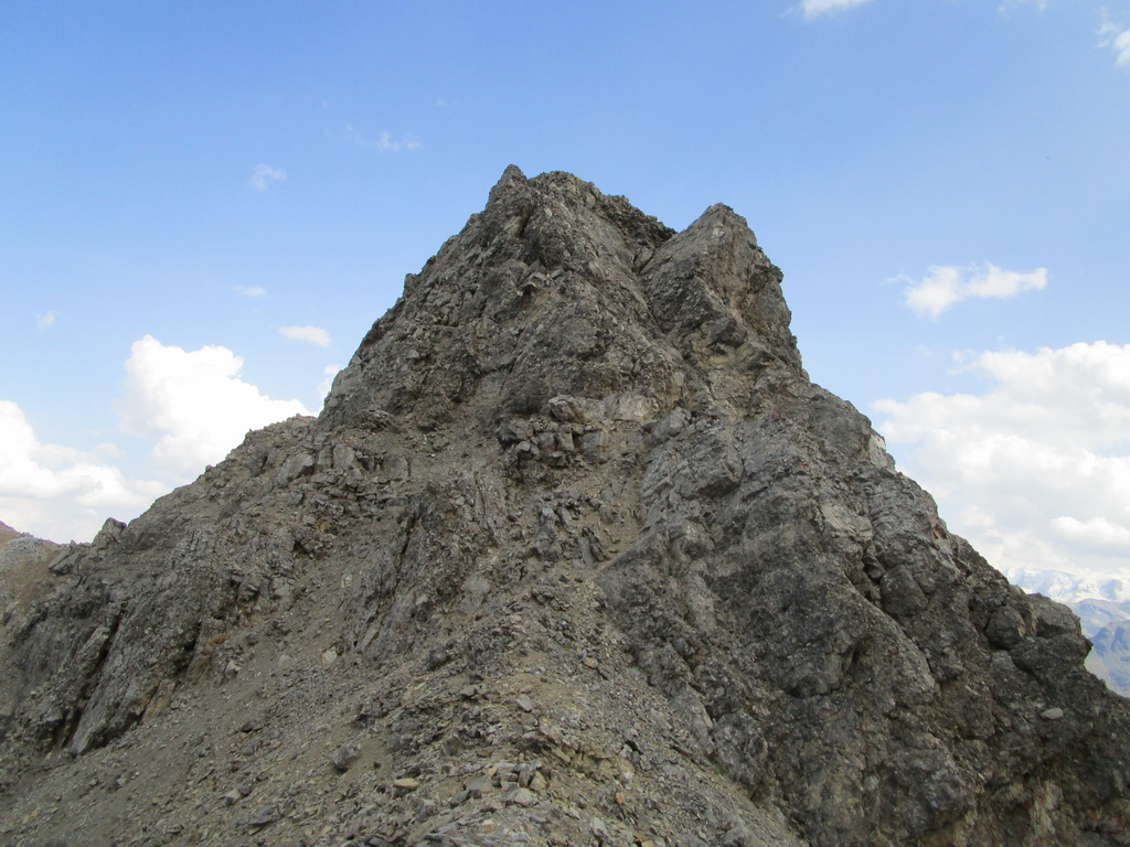 Hneď nad sedlom sa ale vypína prvý vrchol hrebeňa s názvom Piz dal Buz 2953 m. Netuším čo ma čaká hore, či sa to bude dať zliezť na opačnú stranu, ale štverám sa strašne rozbitým terénom s voľnými skalami hore. Nebolo by dobré tadiaľ zostupovať, ale hore ma okrem pekných výhľadov čaká ľahký zostup na druhú stranu. Na fotogenickej vežičke sa ešte hrám so statívom a trošku kamerujem, a potom už pokračujem v traverzovaní "Kvetov"