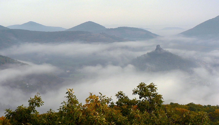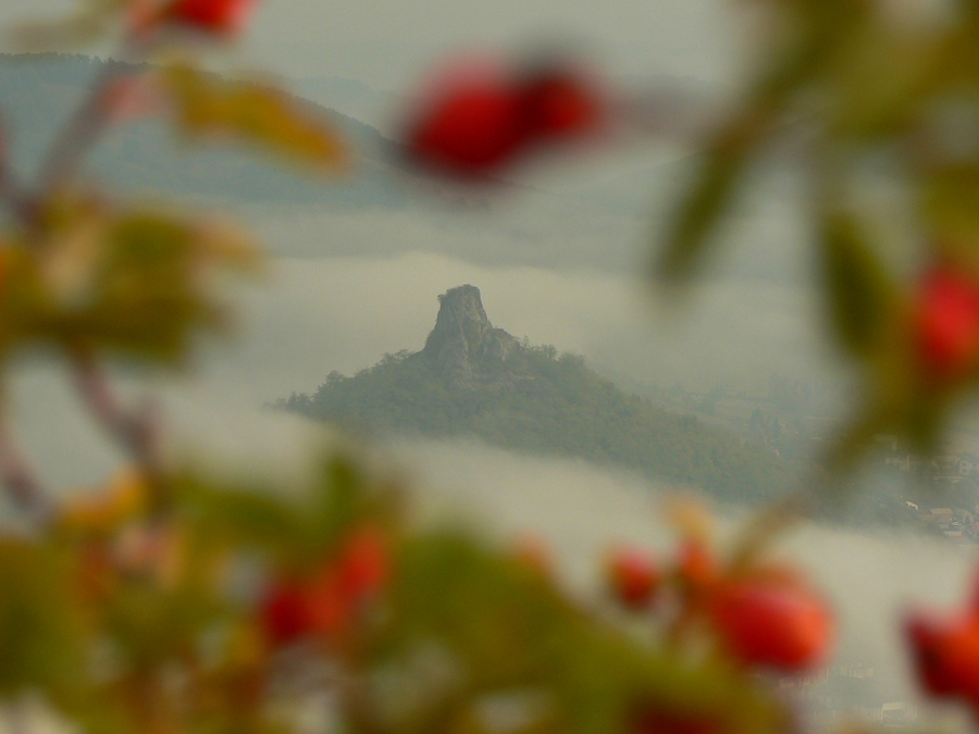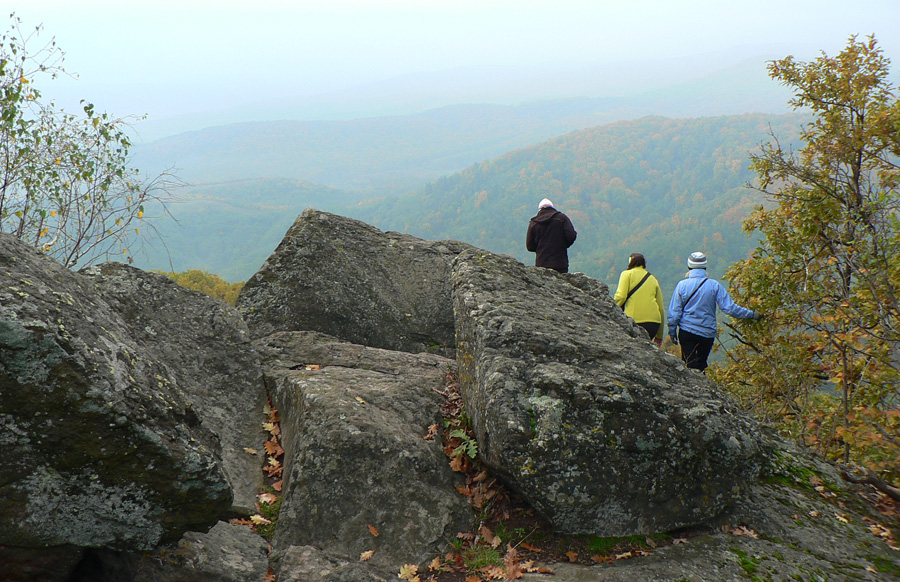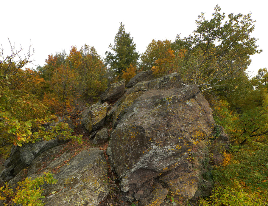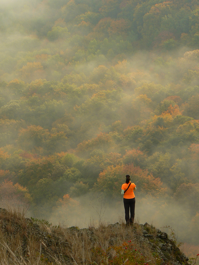 Lebo sa ešte raz vraciame kus nazad, k vyhliadke na okraji tejto lávovej plošiny, loviť ešte dáke zábery. Útržky hmiel sa dvíhajú z farebného lesa, pod skalným zrázom skalné mesto obrastené machom, no rozprávka - aj v tej sivote.