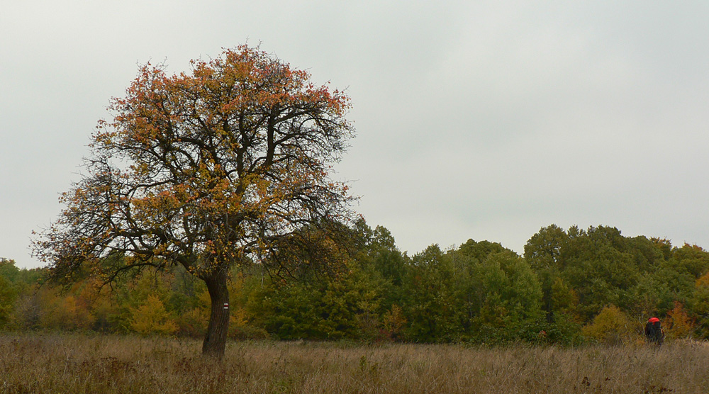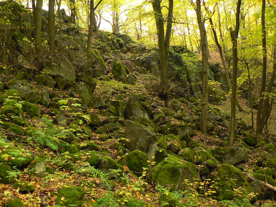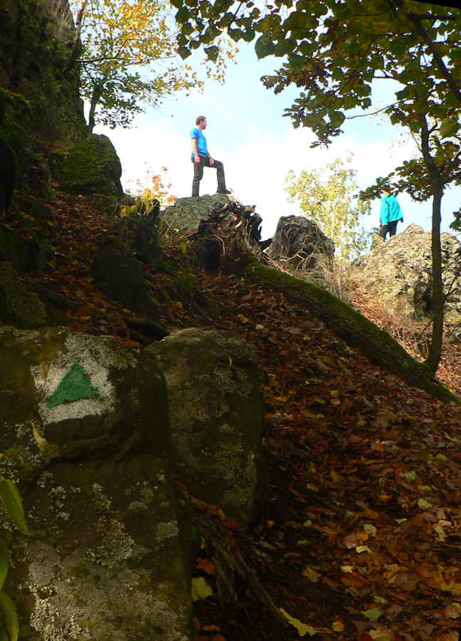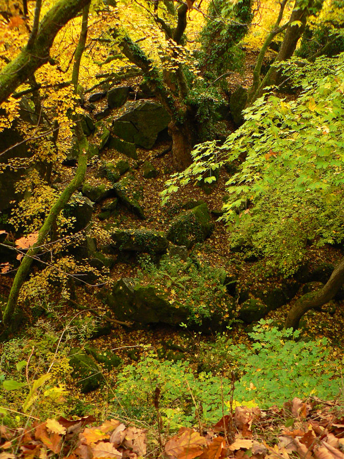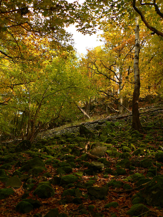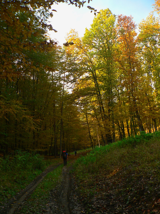 Začíname rátať hodiny do odchodu vlaku z Hodejova, tam sa musíme prepracovať popod Zabodu a cez Steblovú skalu. Obe vidno na severe. Zatiaľ máme tak hodinu rezervu, pome radšej... Strmóóó dole, riedkym lesom, celým do žlta. Akonáhle sa sklon zmierni, už sú tu zvážnice a blato a koľaje traktorové. Ešte že tie farby...