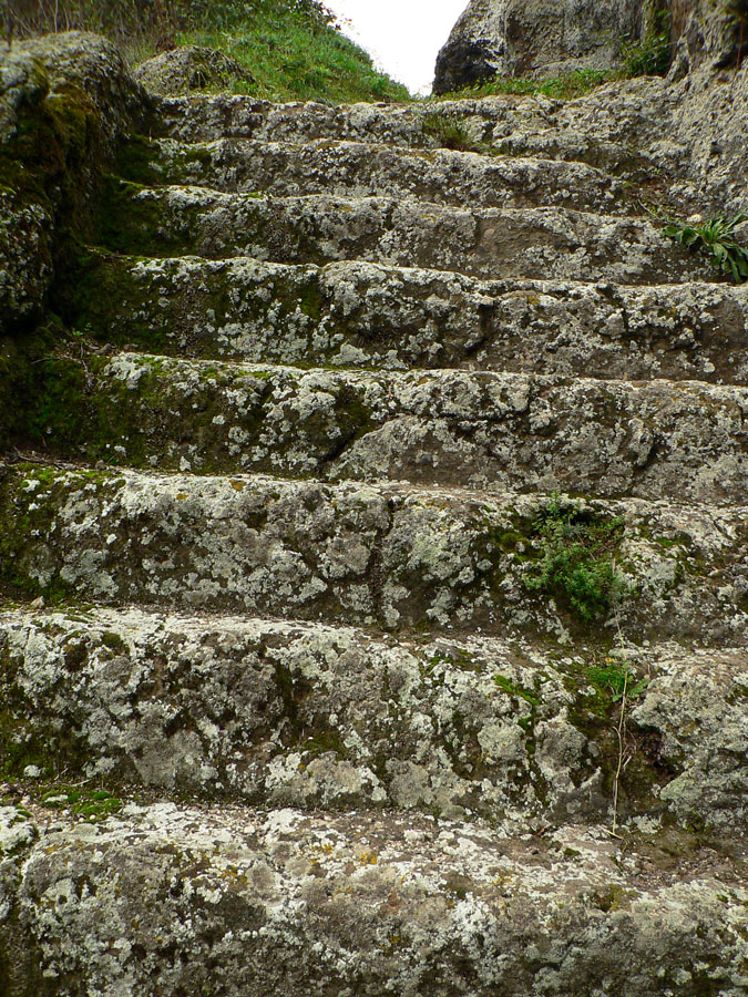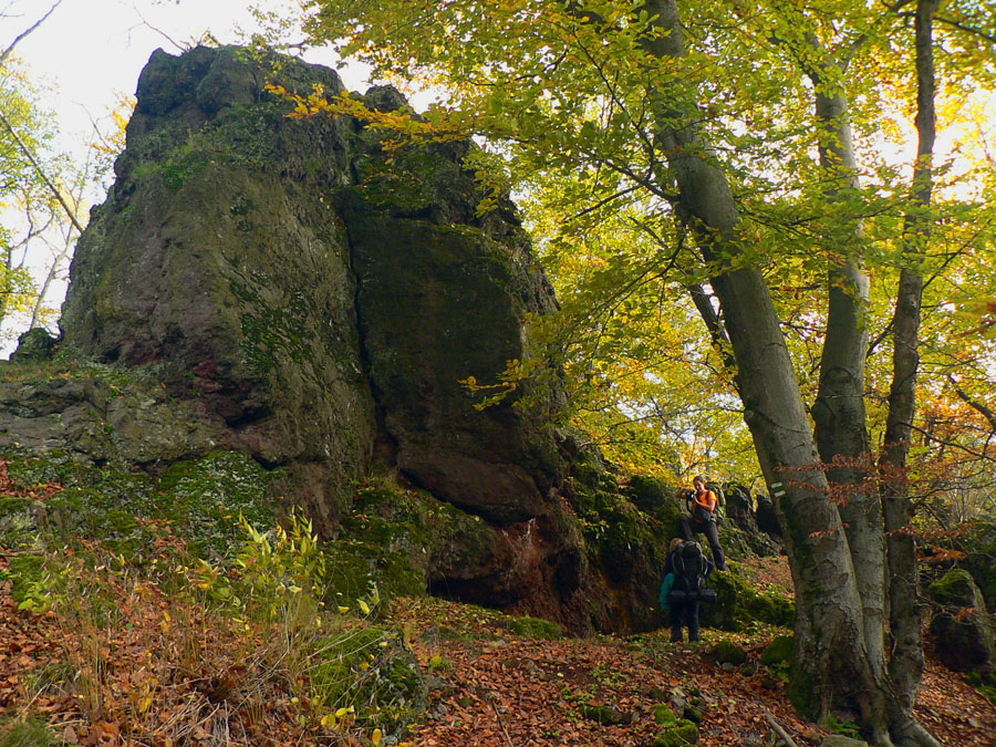 A zas hľadáme značku, lietame zo zvážnice na zvážnicu a nikde nič. Rezerva sa stenčuje, aj keď ešte stále žije. Nakoniec dáko intuitívne tú Steblovú skalu (486m) triafame. Keď už zas lezieme takmer po štyroch, vieme, že ideme správne. Hlava hore: nádherné čadičové stĺpy stoja v rade ako píšťaly organu. Nad nimi na plošinke smerovník a výhľad do doliny Gortvy, kade sa (dúfam) budeme o dve hoďky viezť vlakom.