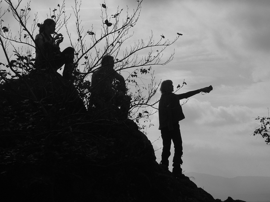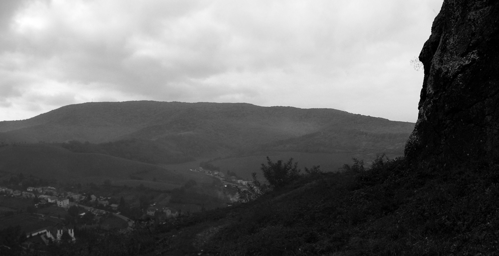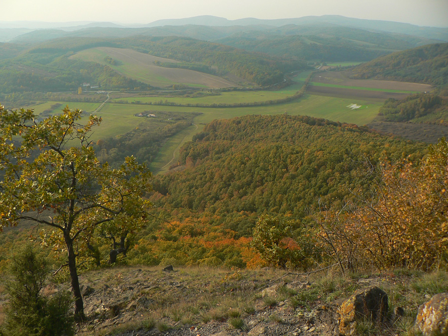 Potom už husací pochod dole zo „stolovej hory“. Les je bez slnka zatiaľ trochu všedný, ale to sa isto spraví. Našťastie nad stromy trčí plešatý Tilič (475m) s majestátnym výhľadom od juhu cez východ k severu. Presne tam, kam máme namierené. Najbližšie je Hajnáčka. Zas skúšame, čo sme schopní odfotiť pomedzi hmly a mraky, konkurujeme miestnemu fotoamatérovi, ktorý si musel ráno isto dobre privstať, aby sem dotiahol svoju strojovňu až z Fiľakova, na bajku. A vrtí sa po kopci hore-dolu, usilujem sa odkukať aspoň to, kam mieri objektívom.