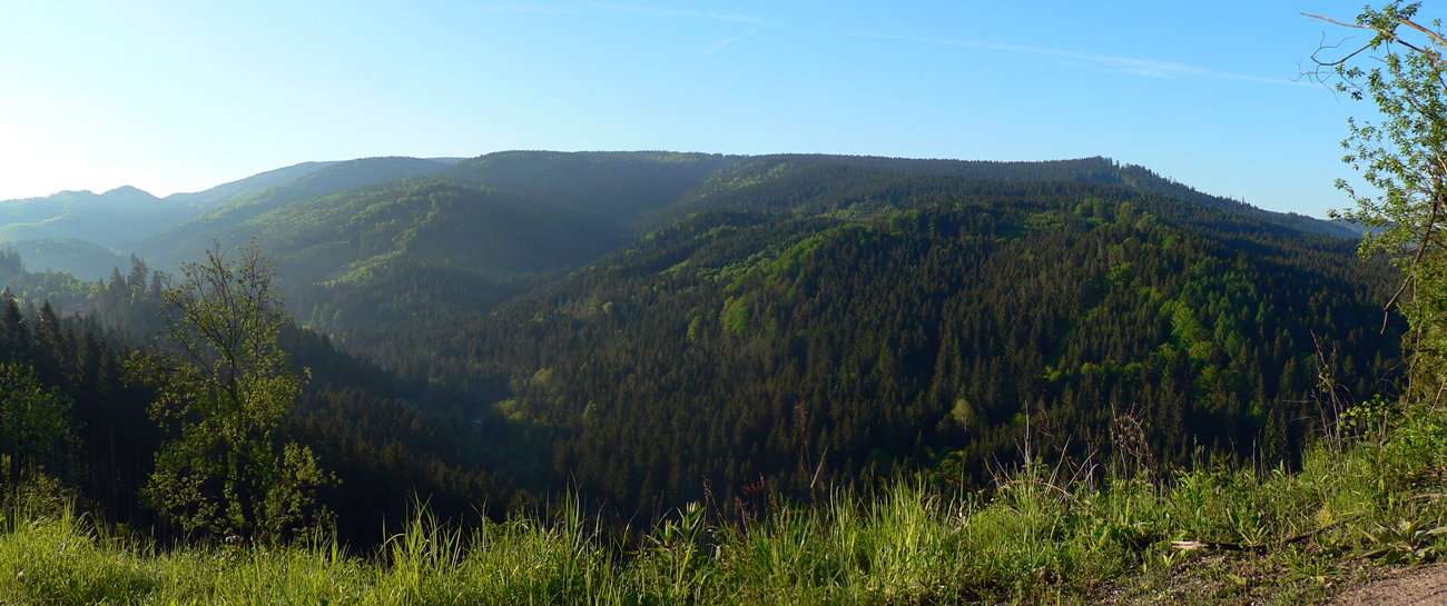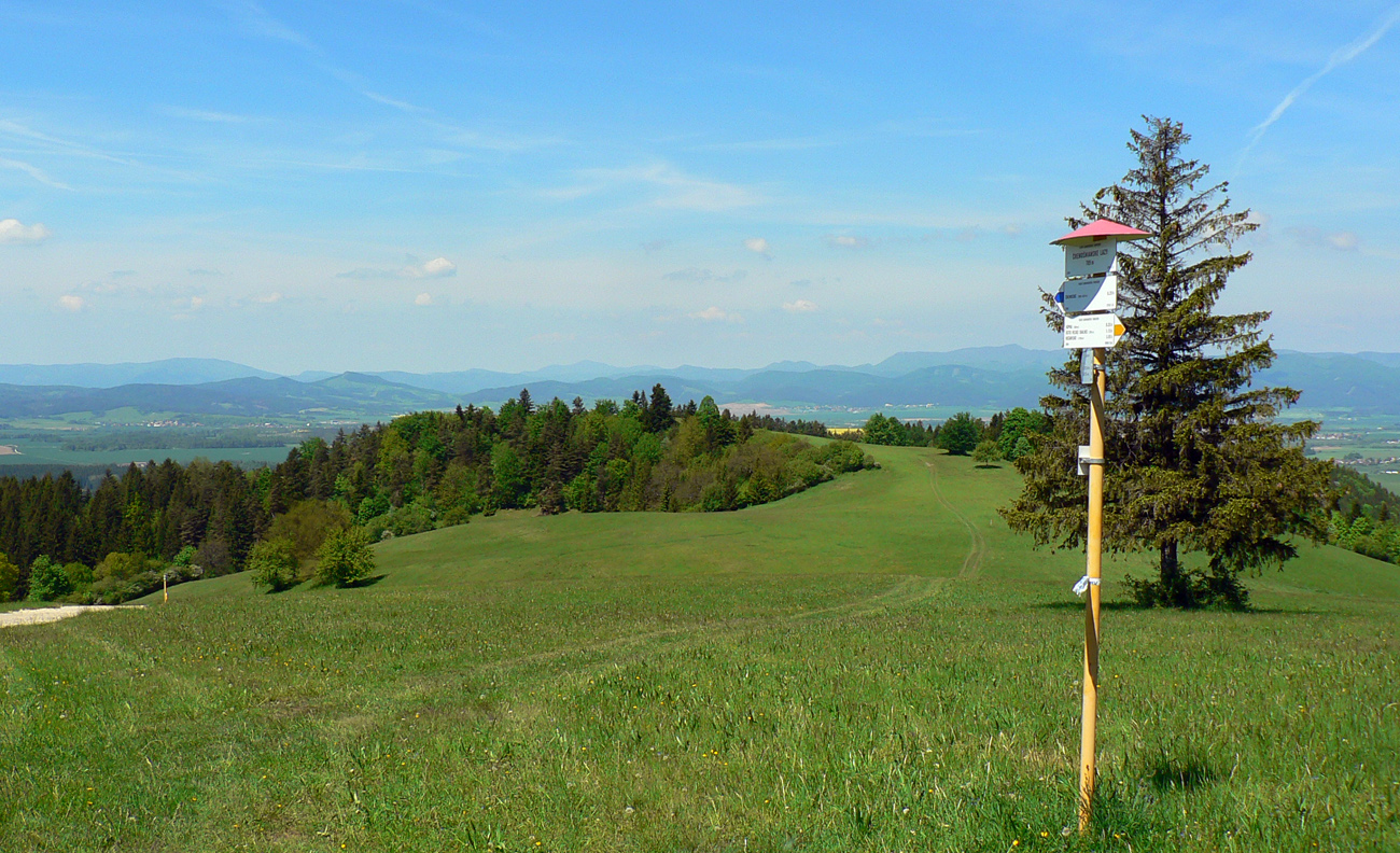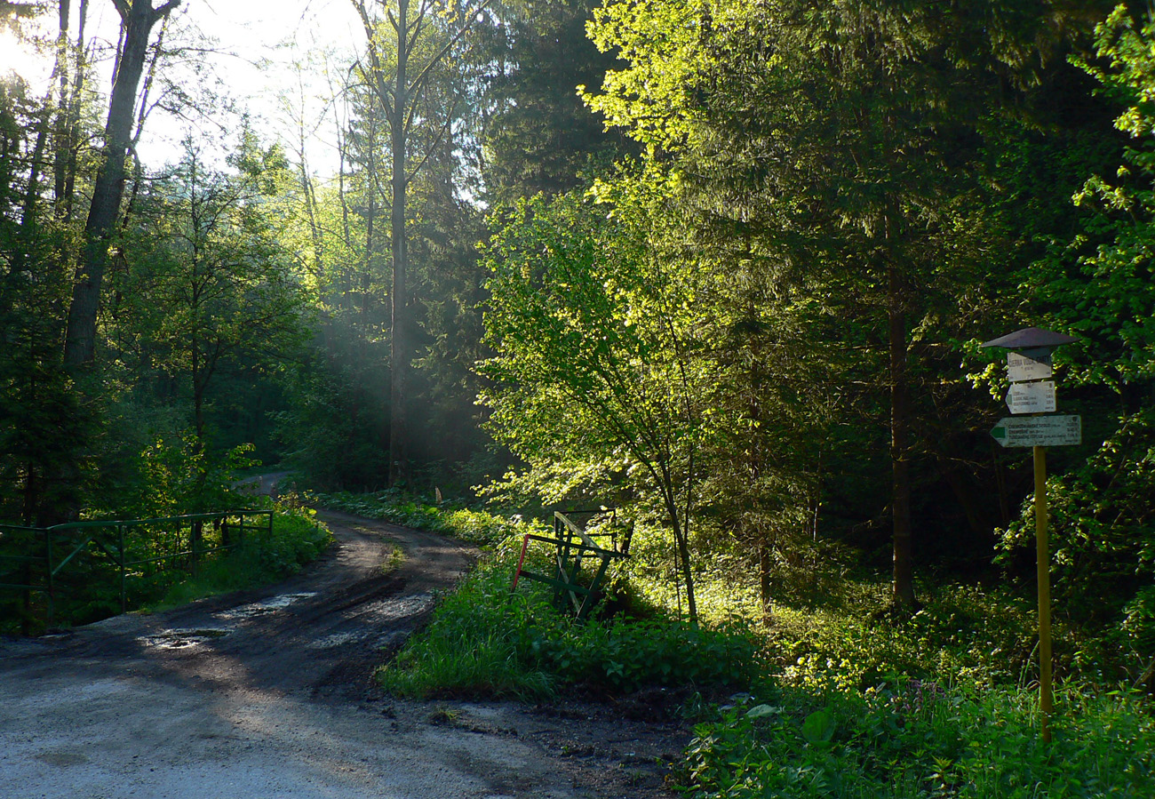 Na začiatok som sa teda potreboval dostať do ústia Čiernej doliny. Z Teplíc tam síce vedie zelená, ale tú poznám, tak som išiel preskúmať alternatívu – Multifunkčnú Greenway Trasu. Podľa názvu to musí byť bomba a nad ústím sa napojím na tú zelenú, som si hovoril... Hej, bomba zvážnica je to, navyše po dažďoch májových, mňam. Ak bolo sucho, tak vďaka makadamu. Výhľady asi dva, cez čerstvé rúbane. Ale účel splnený, pri chatách som sa napojil na zelenú, spadol spolu s ňou na hlavnú cestu a oproti už svietil smerovník v ústí Čiernej doliny.