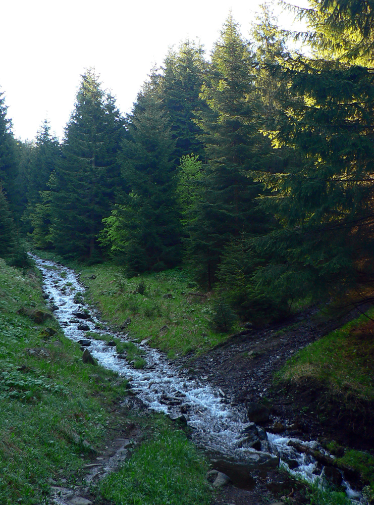 15 minút kľučkovania k rázcestníku, mením zelenú za modrú a začína zostup na Bartošku, krajinársky podobný výstupu. Čiže na úvod kľučkovanie strminou. Dookola stále viac machom obrastených balvanov, spod ktorých sa čoraz hlasnejšie ozýva zárodok potoka. Krátky úsek priamo cez žblnkotajúce pramenisko, no po prekrižovaní zvážnice je tu zrazu, akoby z ničoho, hučiaca riava.