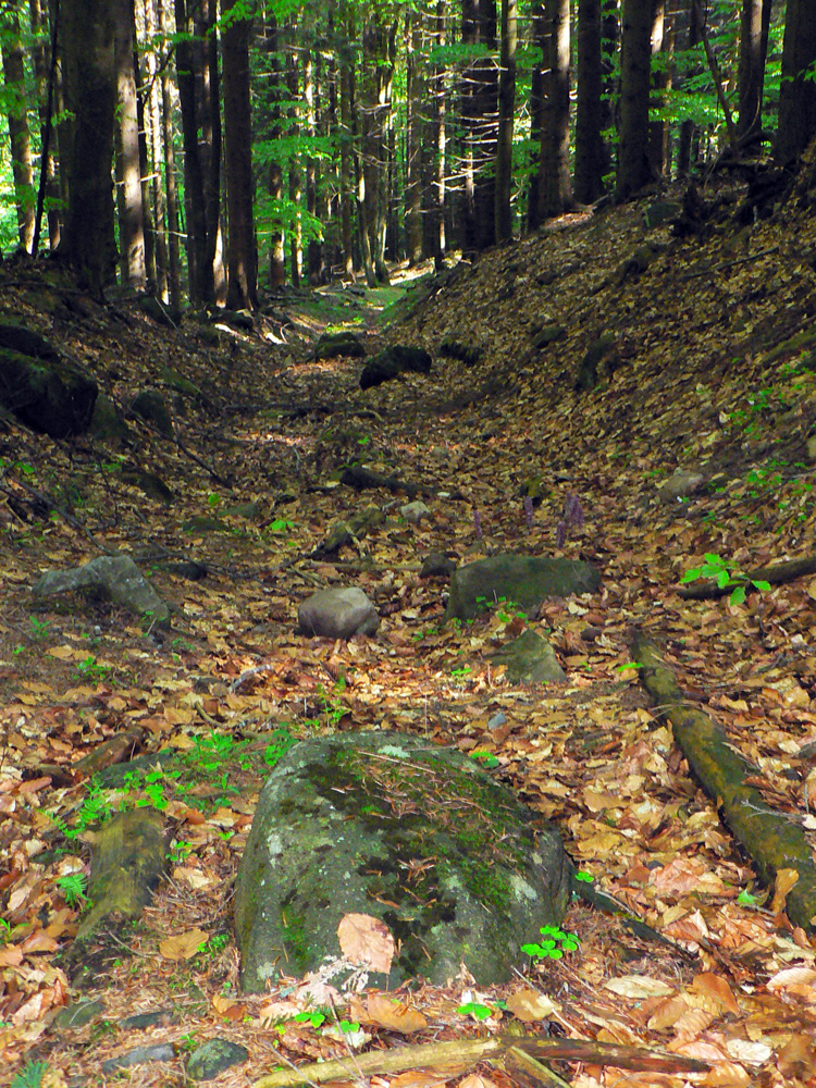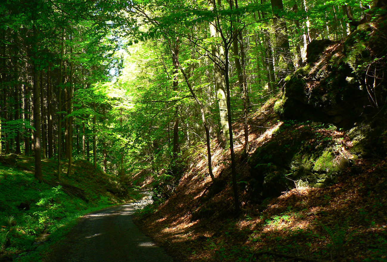 Okrem sklonu, charakteru lesa a šírky cesty sa ďalej zmení ešte voľačo: balvany naokolo. Akoby uťal, sopečný andezit je zrazu vystriedaný dolomitom. Z Kremnických vrchov sme sa zrazu (geologicky a teoreticky) prehupli do Veľkej Fatry. Nie cesta cez Šturec je tou hranicou, ako si veľa ľudí myslí.