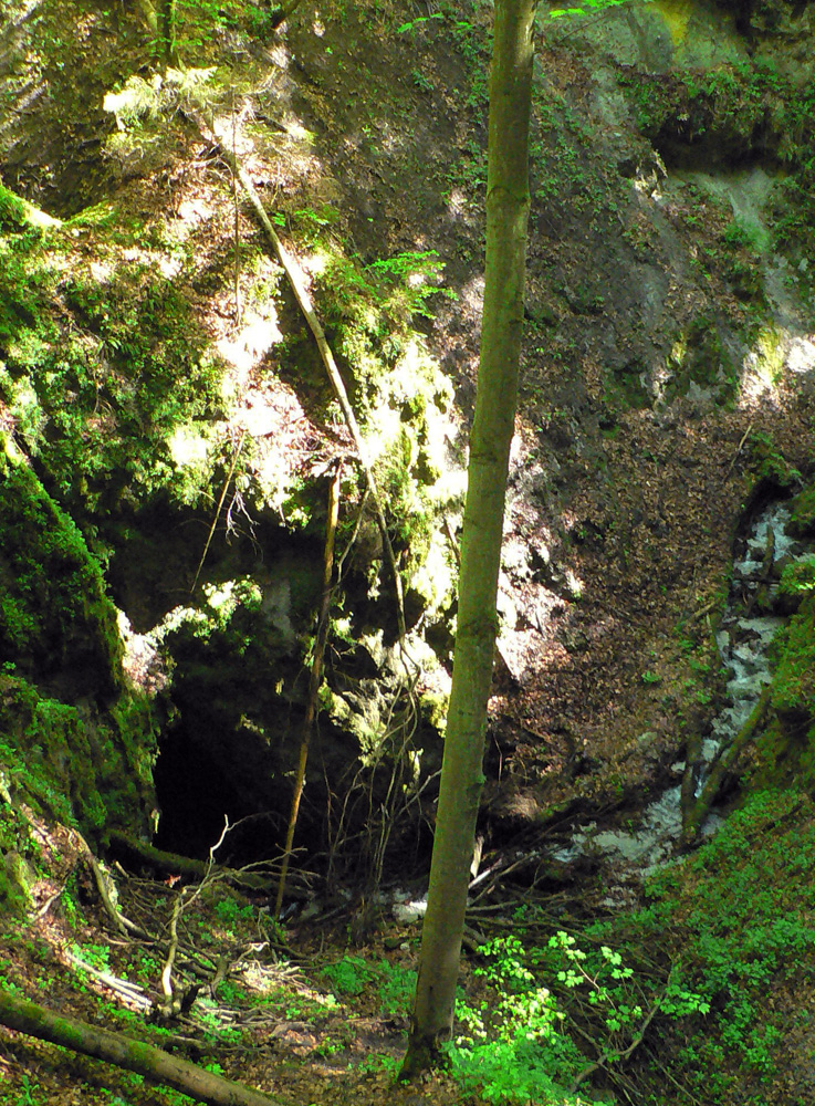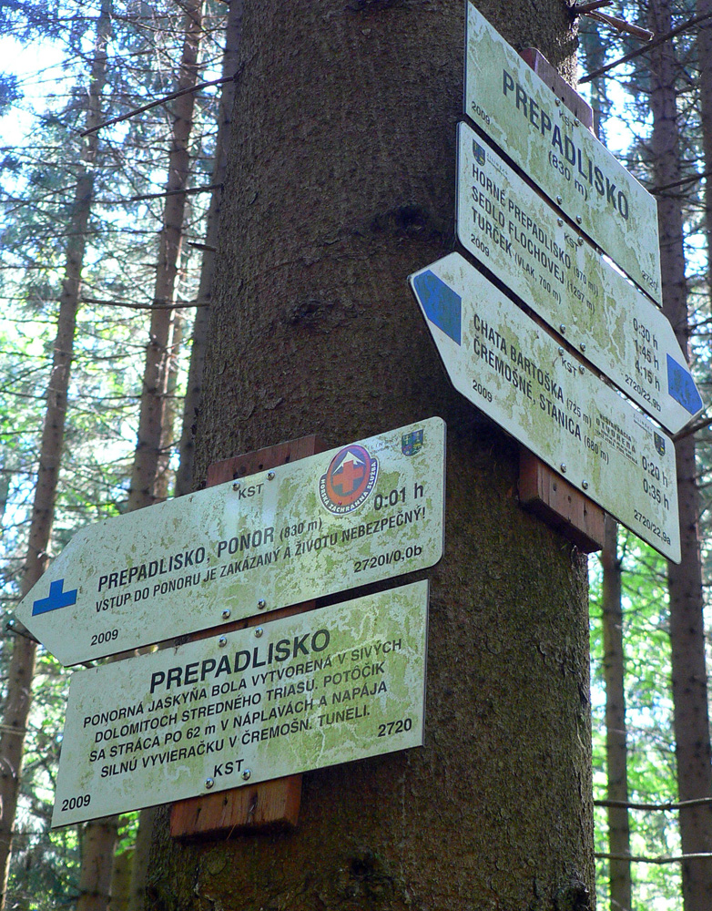 Mäkká lesná cesta sa mení na asfaltku, ale nenudí. Aj tu je dolina pekná a je tu ešte jedno prepadlisko. Dramatickejšie ako horné, lebo nevyplnené vodou. Potok malým kaňonom vteká do jaskyne vo svahu. Kto chce vedieť, kam tá voda ide, musí až k východnému portálu čremošnianskeho tunela. Ľuďom od BB po ZH tečie aj doma z vodovodu.