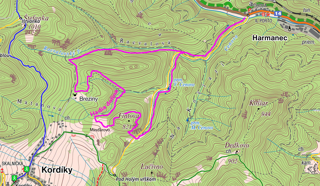 Z Harmanca na Kordíky vedie žltá značka príjemnou, ale nie nejakou bombasticky nádhernou dolinou Cenovo. Dobrá alternatíva pre cyklistov – v podstate až na pár desiatok metrov šotoliny (just v tom najstrmšom mieste) kvalitný asfalt. Kto aj nevie kde je, v Harmanci sa nepomýli, v ústí dominuje zrekonštruovaná vodná elektráreň – jej veľké „mlynské“ koleso je neprehliadnuteľné. Tam sa dá pri hlavnej aj pohodlne parkovať, aj „emhádé“ tam stojí. Dolina poslúži ako základ, z nej sa odrazíme na západ a do nej sa aj vrátime. Tak, ako je to naznačené na mape, zaberie výlet odhadom päť až sedem hodín, podľa tempa. Ale ponáhľať sa neoplatí a niekde ani nedá.