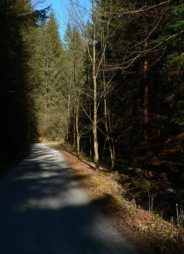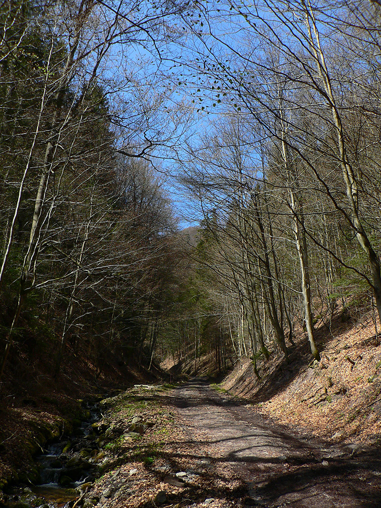 Pri horárni lúka, na lúke nový nevkusný kanadský zrub, popod horáreň výrazná cesta dole lesom. Po chvíli sa vnorí do hlbokej doliny a vysoko ponad jej potok schádza poriadne hustou bukovou mladinou, schudnutá už len na ledva zreteľný chodník. Končí na sútoku potokov, priamo pod parádnou skalnou slavobránou do Hadej doliny.