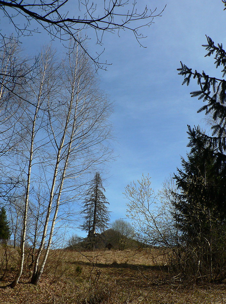 Za posledným, poriadne deravým „dvojbralom“ sa sklon mierni a vľavo pomedzi stromy už presvitá veľká lúka Minďárovo, po ktorej hornom okraji ide (v úvode spomínaná) asfaltka. Nad dolným okrajom sa vypína Fintova (821 m) – na pohľad bežný, zalesnený kopček. Ale kto si nájde nenápadný chodníček do lesa priamo zo stredu lúky, o chvíľu ostane prekvapený.