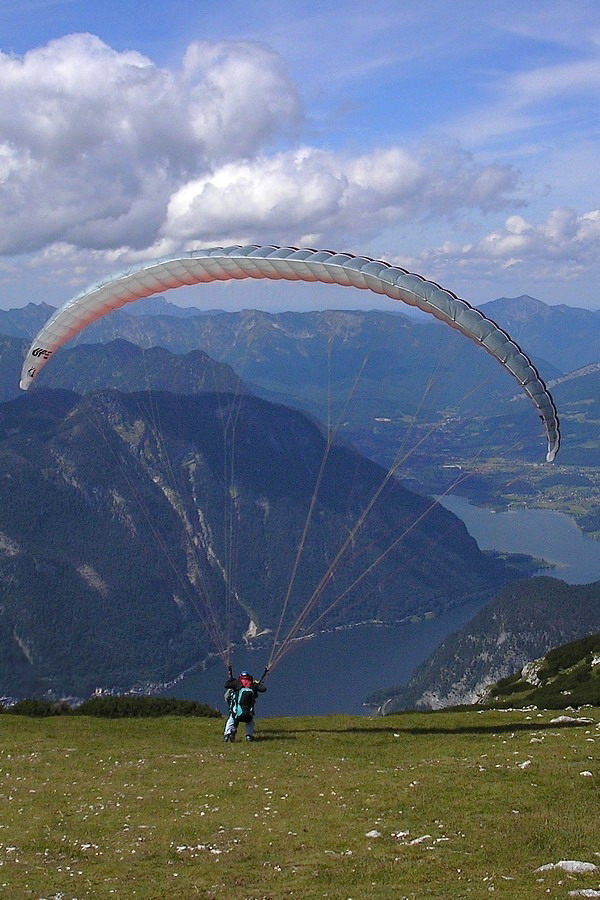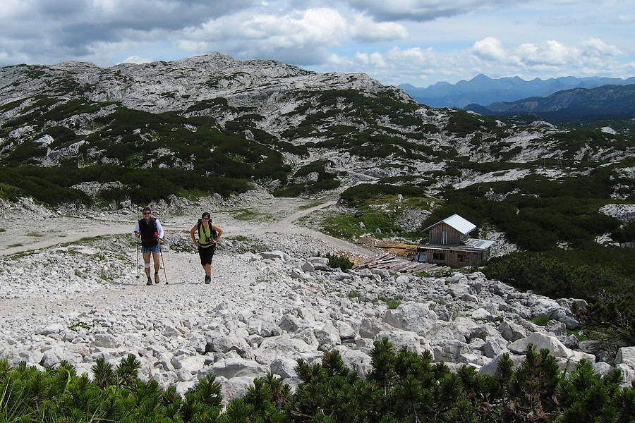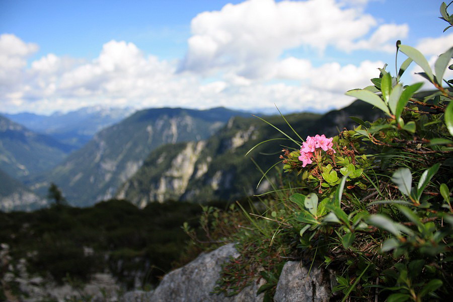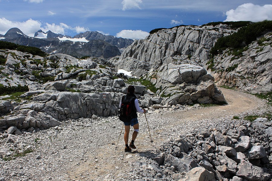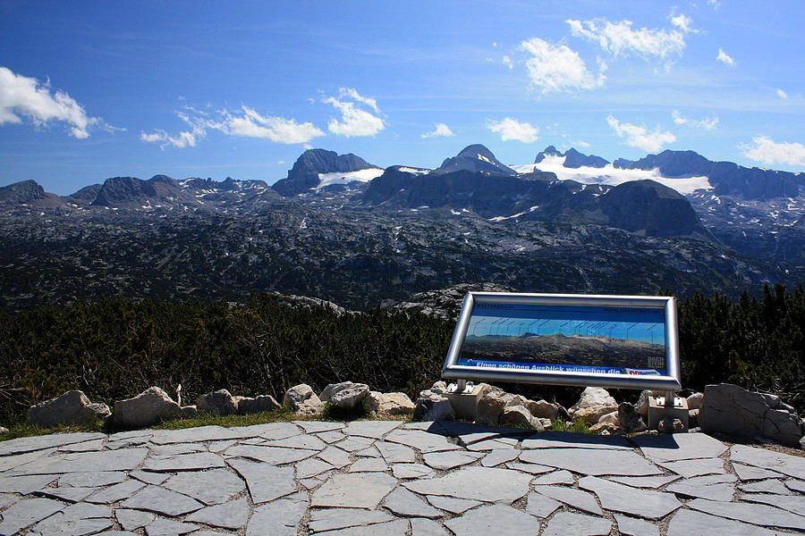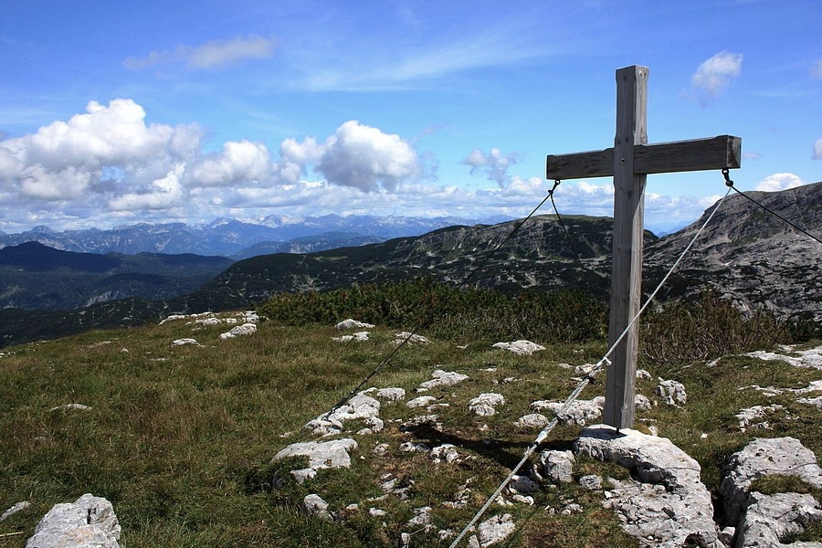 Aj odtiaľto ďalej sa dá vyviezť lanovkou, my však viac dôverujeme vlastným nohám. Terén už nie je taký strmý, aj výhľadov stále pribúda. Najviac pohľadov na seba priťahuje súmerný vŕšok po ľavej strane. Na jeho vrchole vidieť kríž. Podľa mapy je to Däumelkogel a hoci je neznačený a mimo našej trasy, rozhodneme sa ho pokoriť. Výškou len o kúsok prevyšuje hranicu 2000 m, ale kruhový výhľad je odtiaľ božský. Rozoznávame Dachstein, Krippenstein, Plassen aj Hallstattské jazero. Ostatné kopce nepoznáme, takú kapacitu naša mozgová kôra nemá.