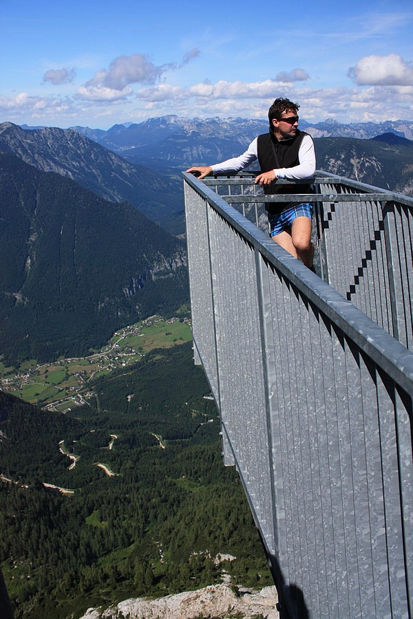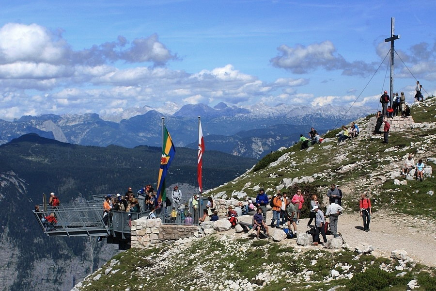 Zbiehame opäť na pôvodnú trasu a po niekoľkých výškových metroch sa pripájame na trasu č. 661. To už je iná káva. Je to hotová diaľnica vedúca až na vrchol Krippensteinu. Prevýšenia len minimálne, cesta široká, upravená, ľudí na mraky. V letnej horúčave nám padne vhod asi 10-minútová zachádzka k malej jaskyni Krippensteinhöhle. Je to len diera v skale plná chladivého ľadu. Od jaskyne k vrcholovej stanici lanovky Bergstation je to na skok. Hustota človečiny tu vysoko prevyšuje celodenný priemer. Lákadlom pre turistov je vyhliadka „Five Fingers“, ktorá sa nachádza asi 15 minút pohodlnej chôdze od lanovky. Majú tu vybudovaný bezbariérový prístup a osadené množstvo infotabúľ a náučných panelov. Vyhliadku tvorí 5 lavíc, vybiehajúcich zo skaly do priestoru a ponúkajúcich okrem výhľadov okolo aj výhľad pod seba.