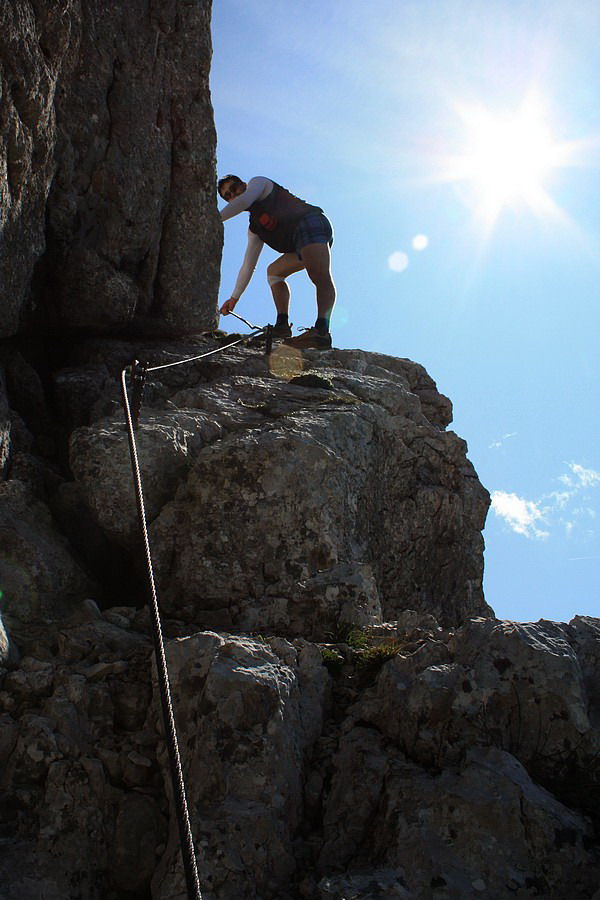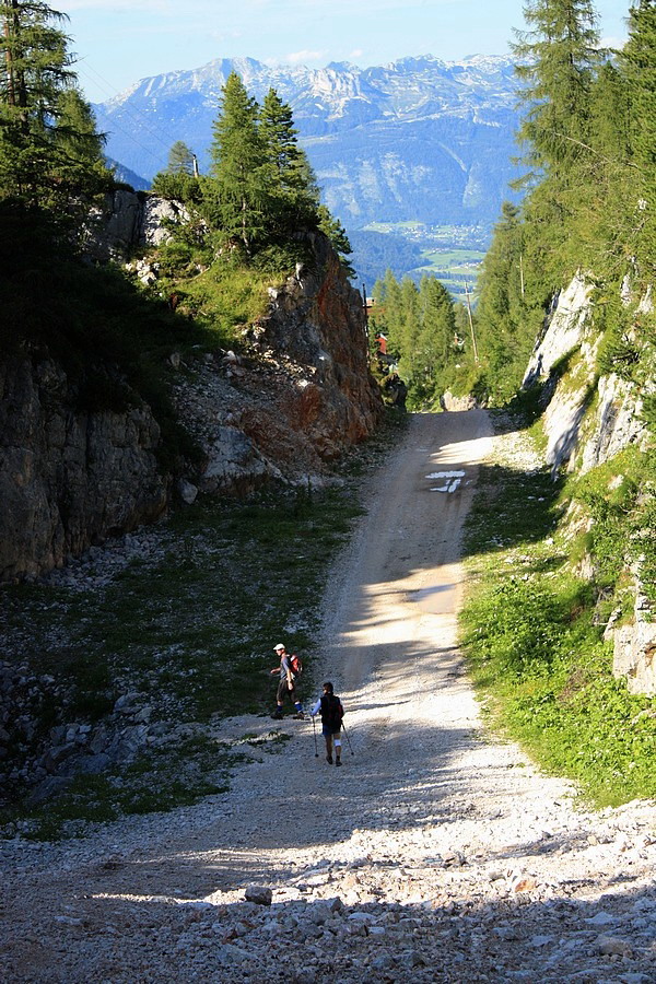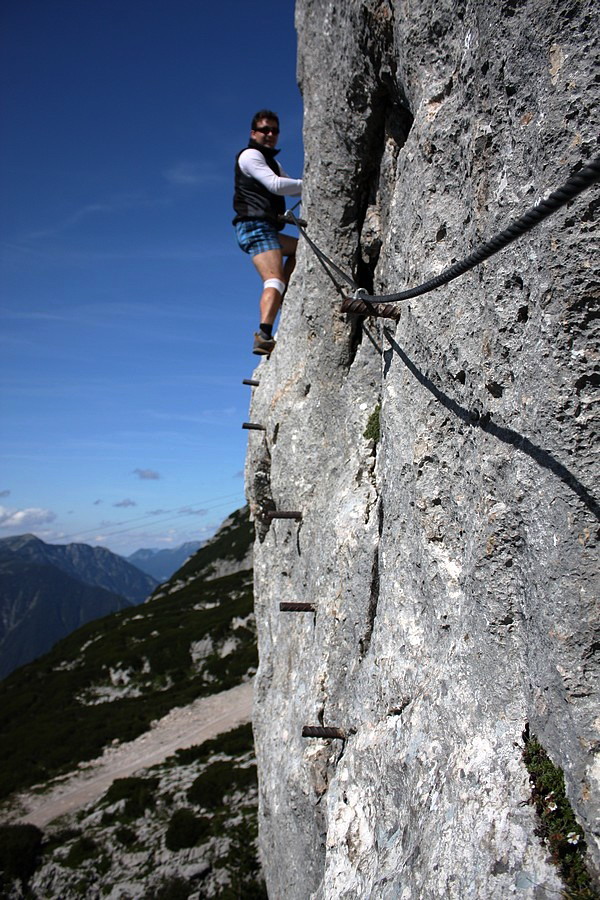 Nasýtení výhľadmi a davmi ľudí sa dávame na ústup. Obchádzame opäť stanicu Bergstation a trasou č. 660 klesáme do doliny na opačnej strane, ako sme prišli. Míňame skalné steny Nd. Krippensteinu, keď nám udrie do očí lesklý kúsok kovu v stene. Veď tam predsa vedie ferrata. Letmý pohľad jeden na druhého a je nám jasné, že toto nesmieme vynechať. Len naľahko a bez istenia vybiehame na laná. Ani nie 100-metrová ferratka v nás rozdúcha adrenalín a je tým pravým spestrením celého dňa. Okľukou zbiehame späť na cestu. Už nás čaká ozaj len prudký zostup (trasou č. 615) prevažne zjazdovkou cez horskú osadu Krippenbrunn do Obertraunu. Kolená dostávajú nadmerne zabrať vďaka suťovému podkladu a miestami prudkému sklonu zjazdovky. Teda na lyžiach by ma na toto nikto nenahovoril!