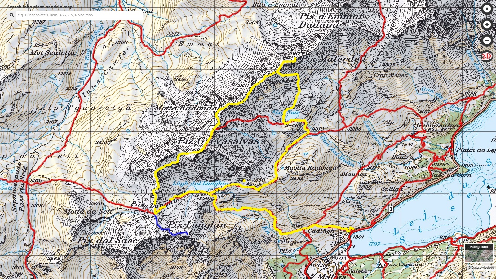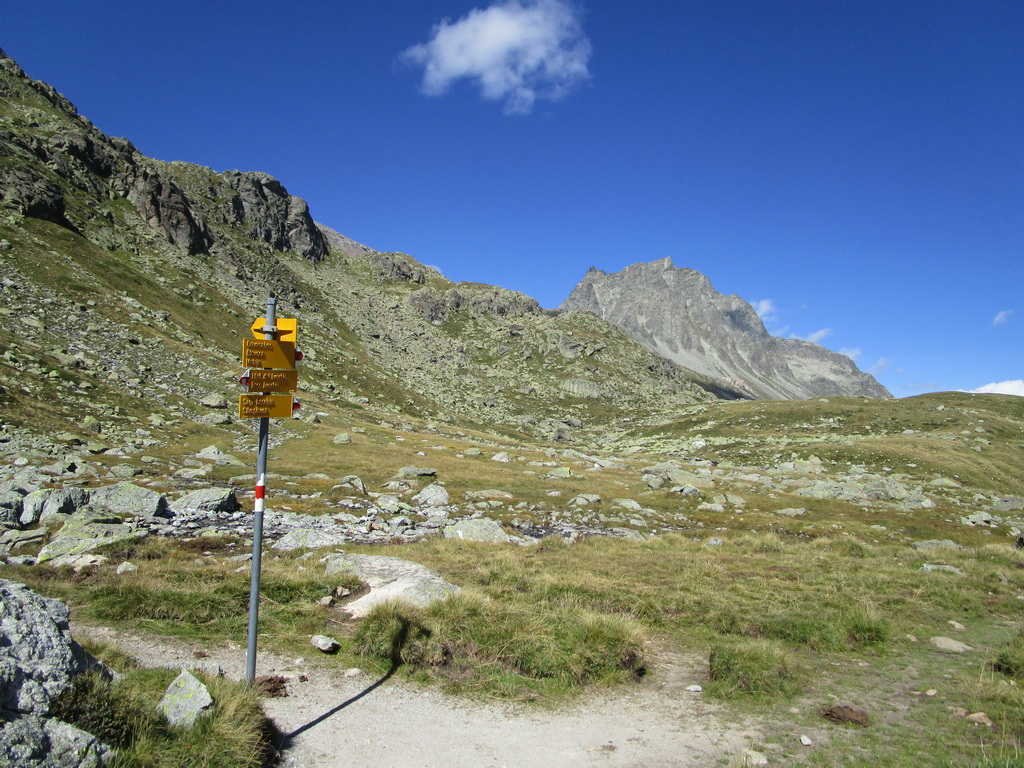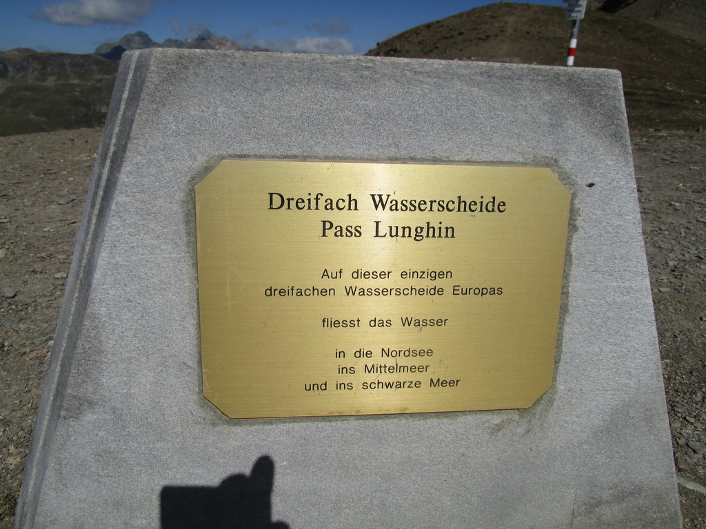 Parkujem na už známom parkovisku pred Malojou v smere od Moritzu vpravo hneď pri ceste, pod kopcom. Odtiaľto štartuje červená značka až na Pass Lunghin. Toto sedlo je vraj jediné miesto v Európe z ktorého odteká voda na všetky tri strany, teda do troch morí: Severného, Stredozemného a Čierneho.