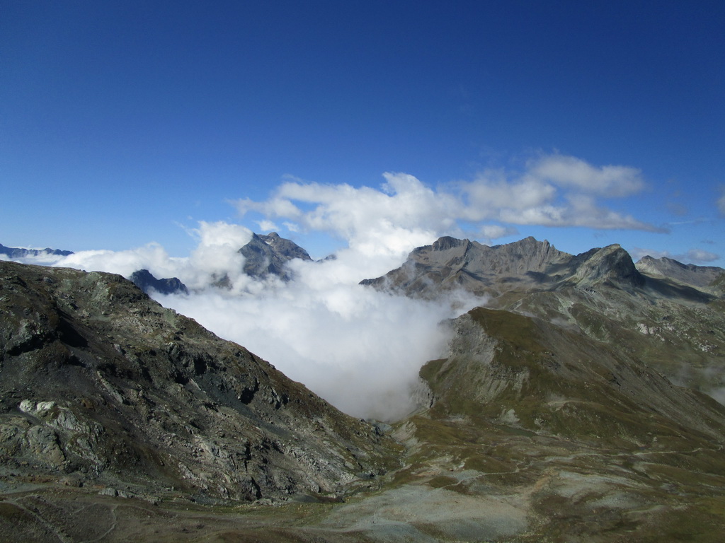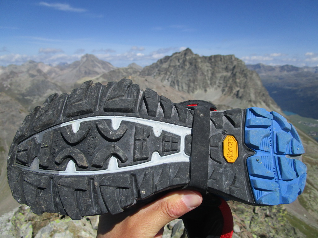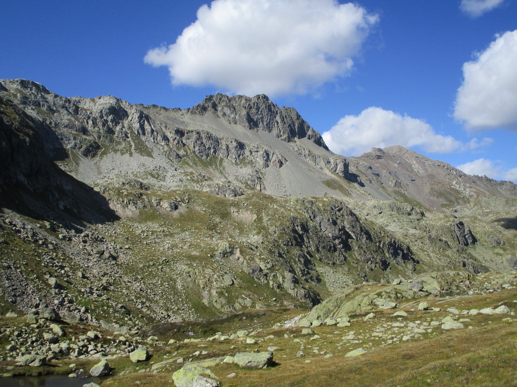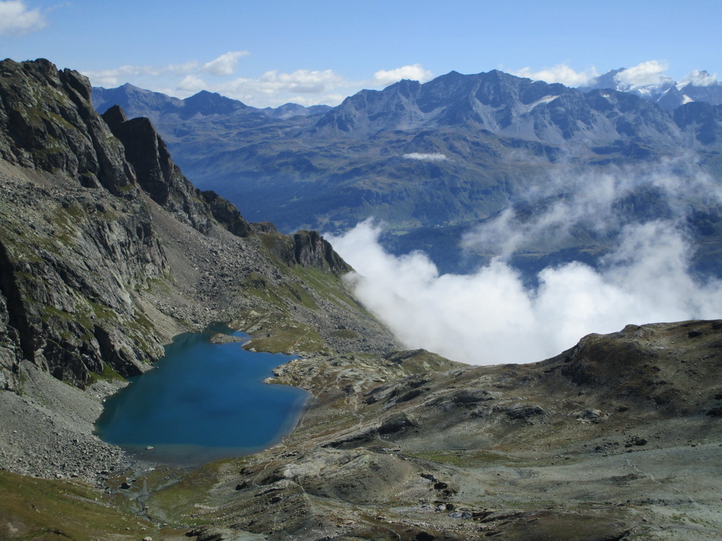 Návrat tou istou trasou pod vrchol. Odtiaľ zbieham dole po suti, napojím sa na turistický chodníček a po ňom sa dostanem opäť ku jazeru Lunghin. Tu uzatváram okruh. K autu dole rovnako po červenej smer Maloja...
