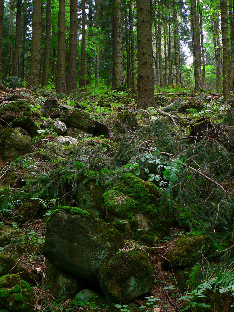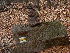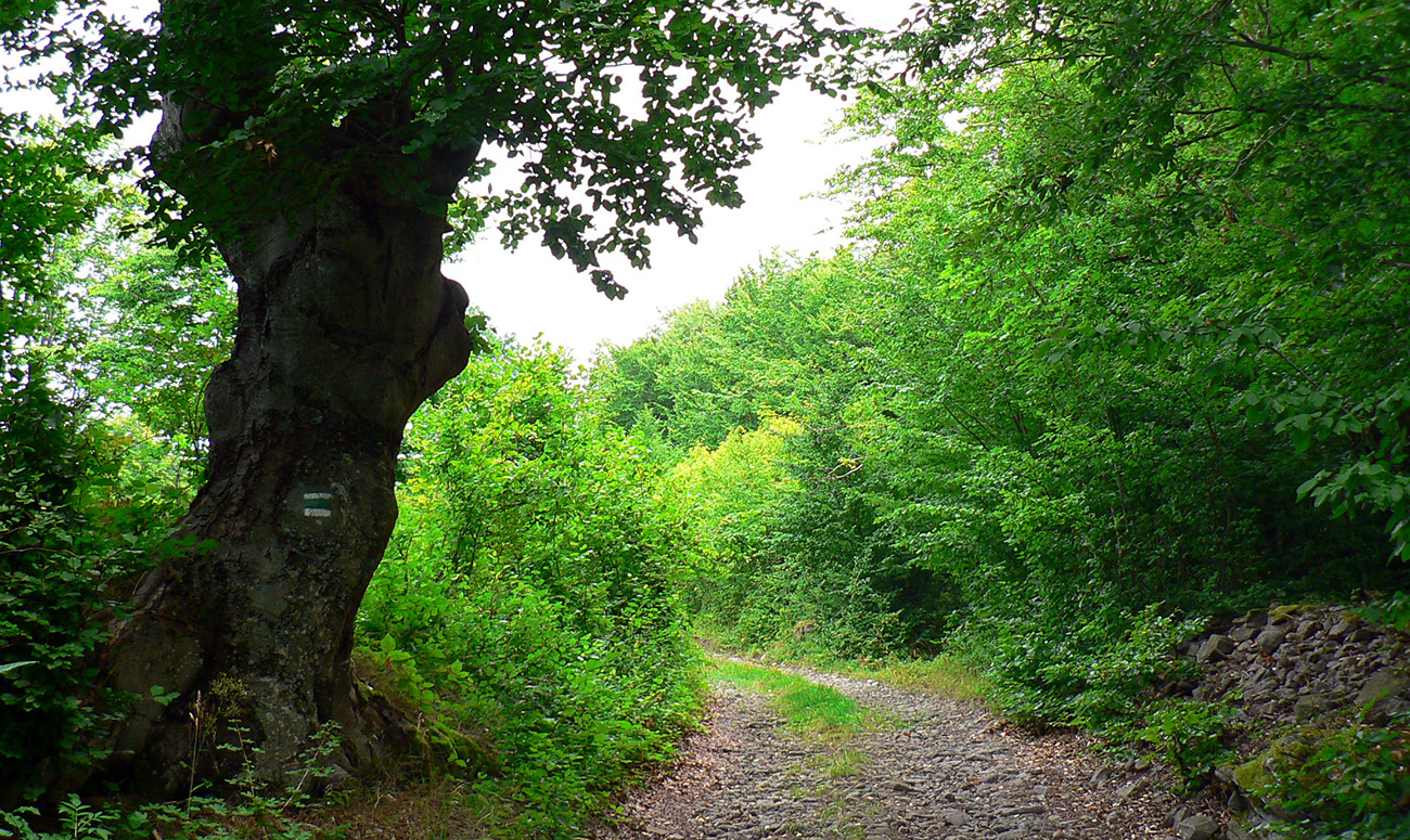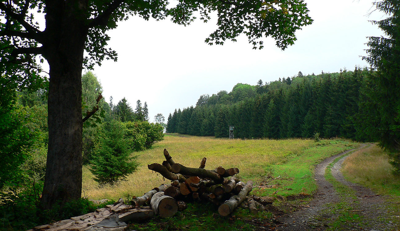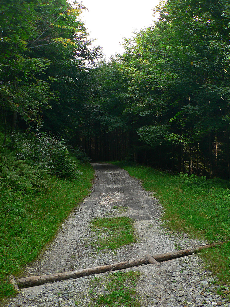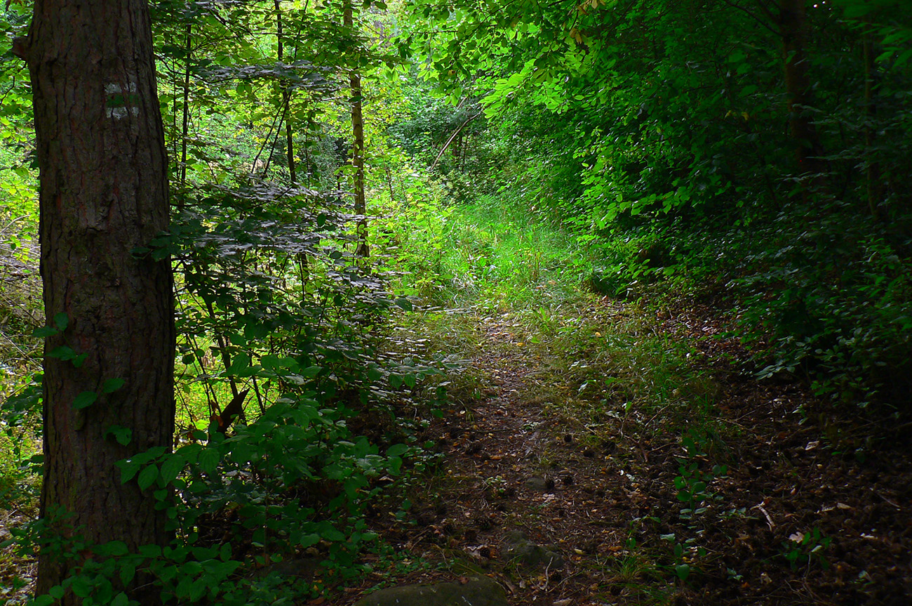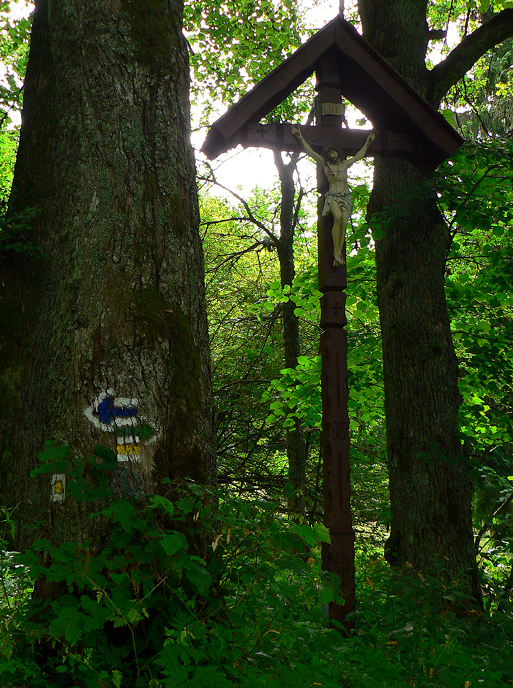 Tak som len z toho krovia vyliezol na lúku ku krížu pod lipou (stále akože po tých zelených bodkách). Ale zelenú som našiel až vyššie v lese, aj keď už bez pochýb. Potom už skoro bez problémov až na Hostinec, aj keď na dve výnimky upozorniť treba. Prechádzka je to inak pekná, striedajú sa najskôr lúky a lesy, pod nohami dobrá, kamenistá cesta. Stará poriadne, o čom svedčia hromady kameňov popri nej a hrubizné stromy:
