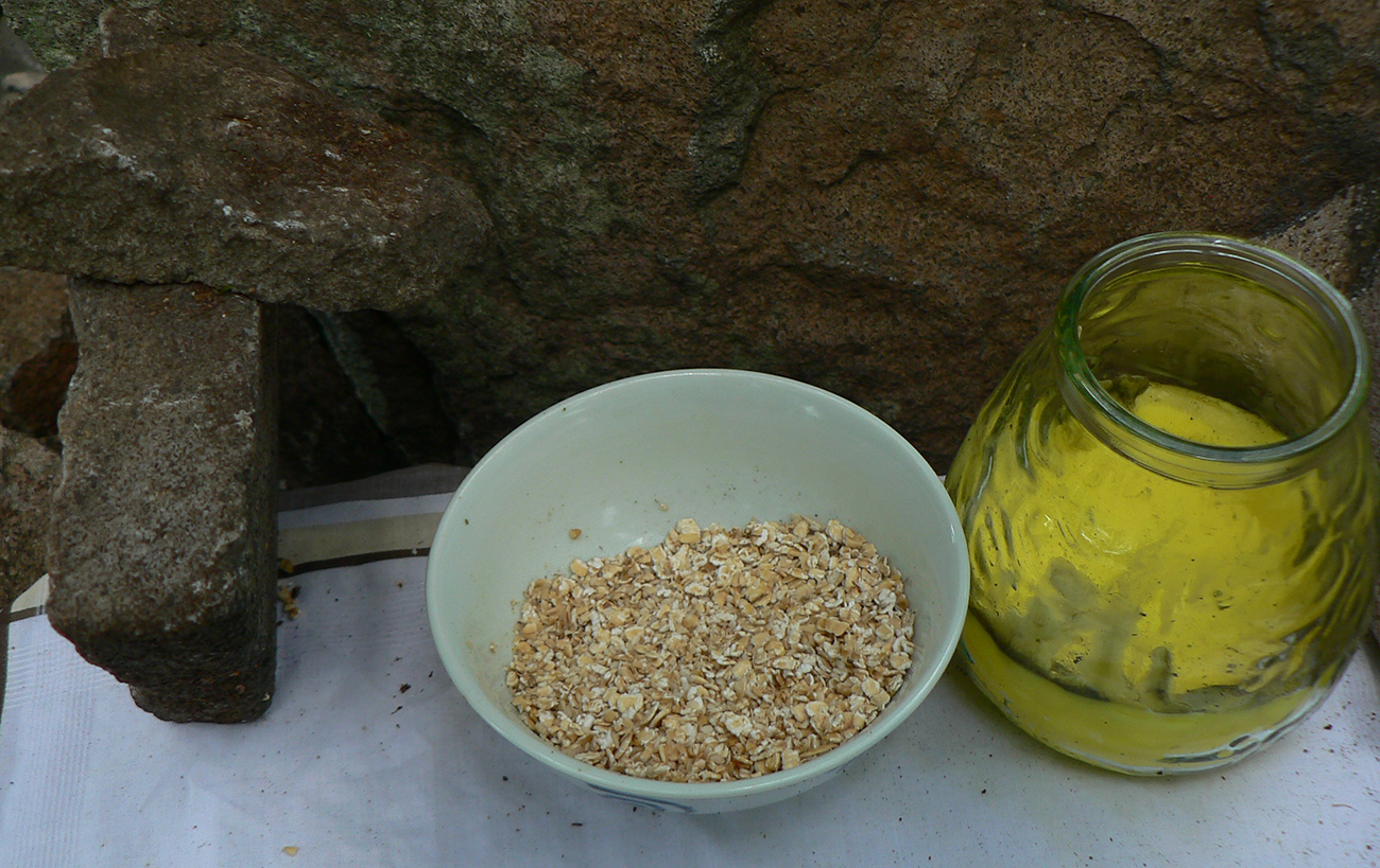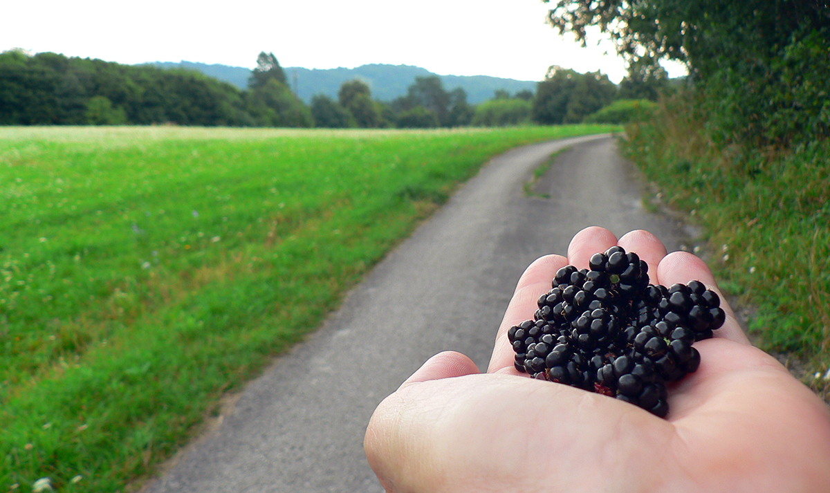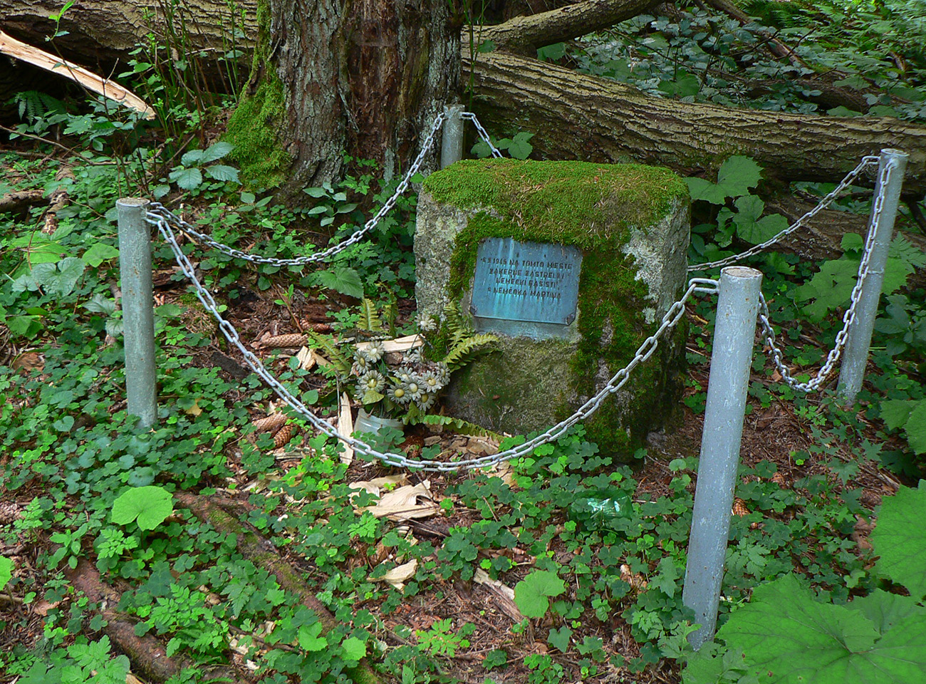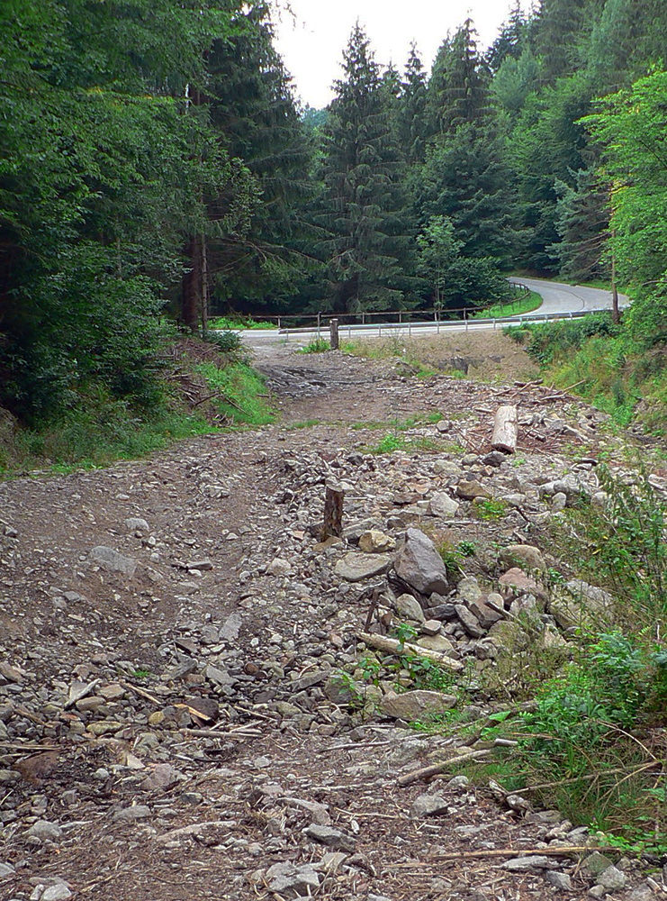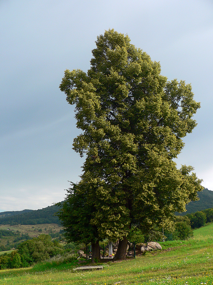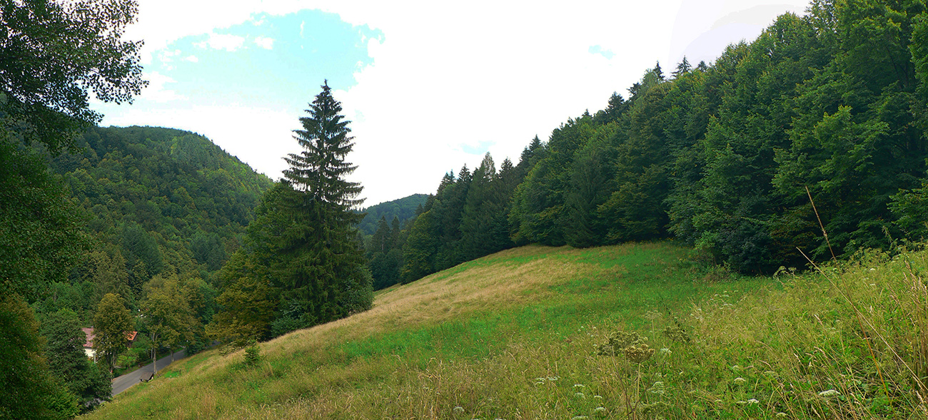 Tak som len z toho krovia vyliezol na lúku ku krížu pod lipou (stále akože po tých zelených bodkách). Ale zelenú som našiel až vyššie v lese, aj keď už bez pochýb. Potom už skoro bez problémov až na Hostinec, aj keď na dve výnimky upozorniť treba. Prechádzka je to inak pekná, striedajú sa najskôr lúky a lesy, pod nohami dobrá, kamenistá cesta. Stará poriadne, o čom svedčia hromady kameňov popri nej a hrubizné stromy:
