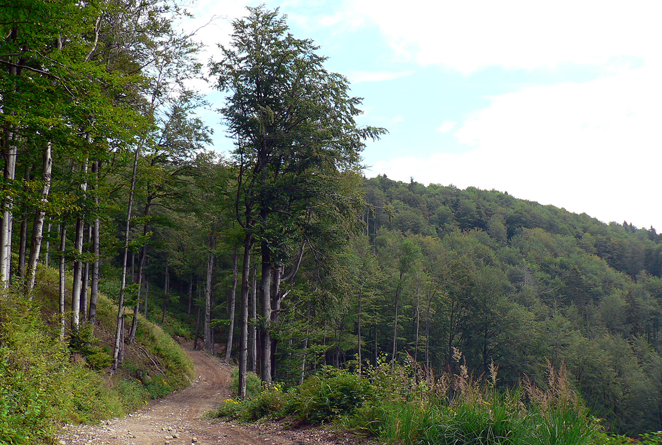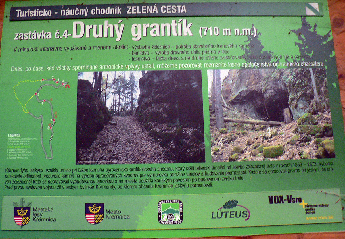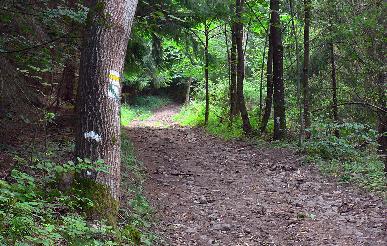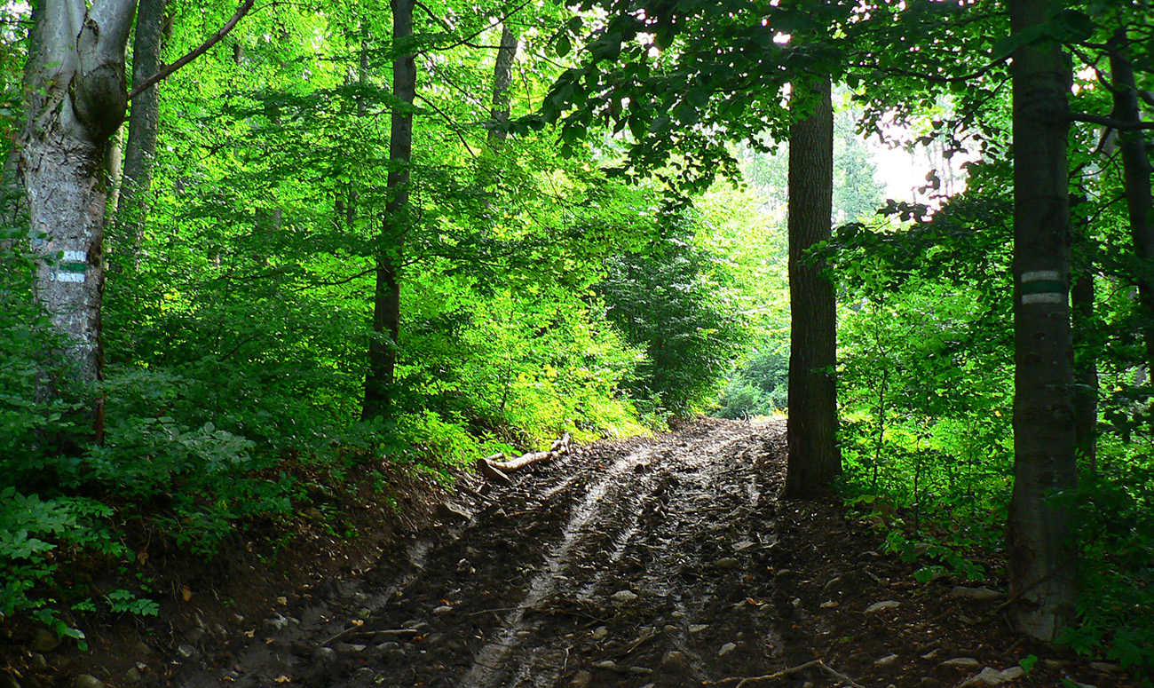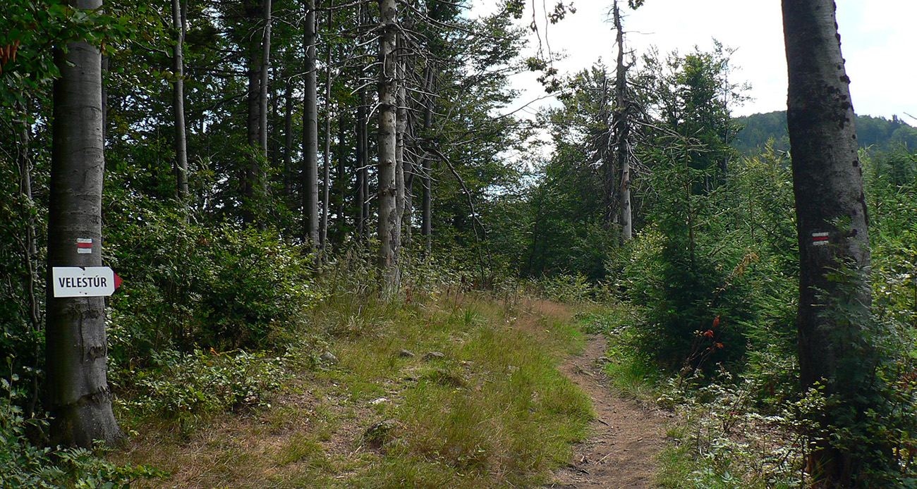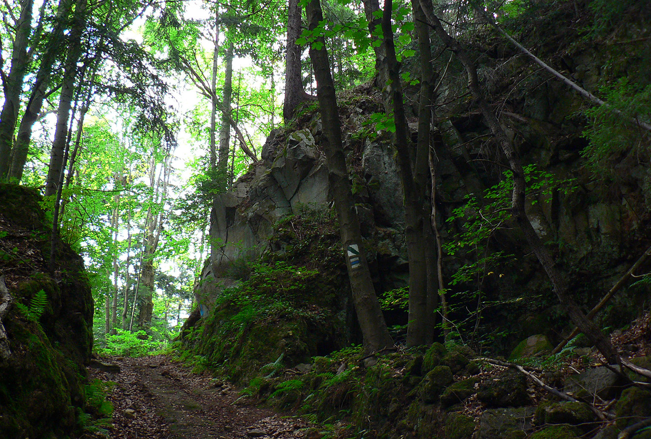 Vyššie v lese pod nohami je viac hliny, aj stôp po ťažbe dreva. Po výraznej odbočke doprava do kopca je to najviac rozryté a až hore na hrebienok je chodník nezreteľný – odbočuje nenápadne z tej zvážnice doľava, treba sa dobre po značkách na stromoch pozerať (to je tá prvá výnimka). Potom sa ale Kremnické vrchy odmenia po svojom – typicky peknou, lesnou hrebeňovkou a krásnymi bralkami okolo chodníka.