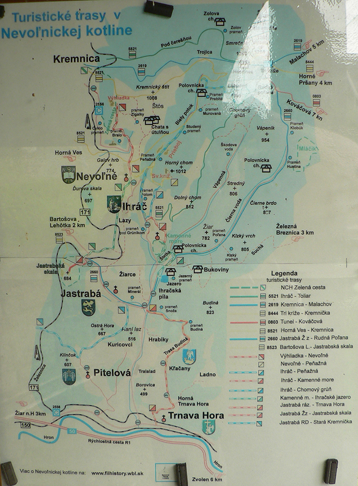 Na začiatok strmo po žltej, priamo z koľají. A zároveň po náučnom chodníku Zelená cesta, po ktorom sa (dúfam) z druhej strany aj vrátim. Značené je to tu konečne dobre, pred pár rokmi tu bol trochu aj problém. Vajanka, Alžbetina skala, výhľad na Kremnicu, všetko na svojom mieste, ide sa dole do Nevoľného. Už po miestnej značke. Tie viem aké sú, niekde dobré, niekde zlé, treba zbystriť pozornosť, mapu som si vytlačil. A fakt – kým som na asfaltku zišiel, musel som ju vytiahnuť asi 3x. Keď raz budem veľký, budem vyťahovať smartfón s offline mapami a navigáciou :-)