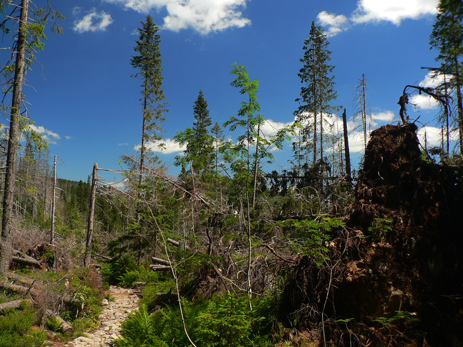 Od grandhotela vedie príjemný chodník krížom cez „postkalamitný“ les po žltej a modrej značke do doliny Kežmarskej Bielej vody, kde sa napojím na klasickú prístupovú cestu k Brnčalke. Za tých vyše 10 rokov „po“ sa už mladý les pekne dvihol. Pomedzi koruny briez a jarabín sa často ukazujú Lomničák, Kežmarák, Svišťovka... Len za mokra to môže byť na niektorých miestach menej pohodlné – tráva je vysoká :-)