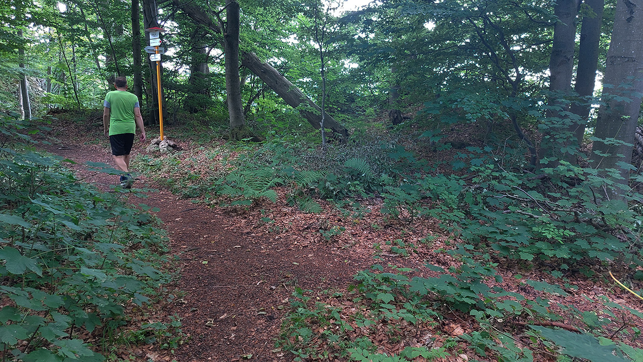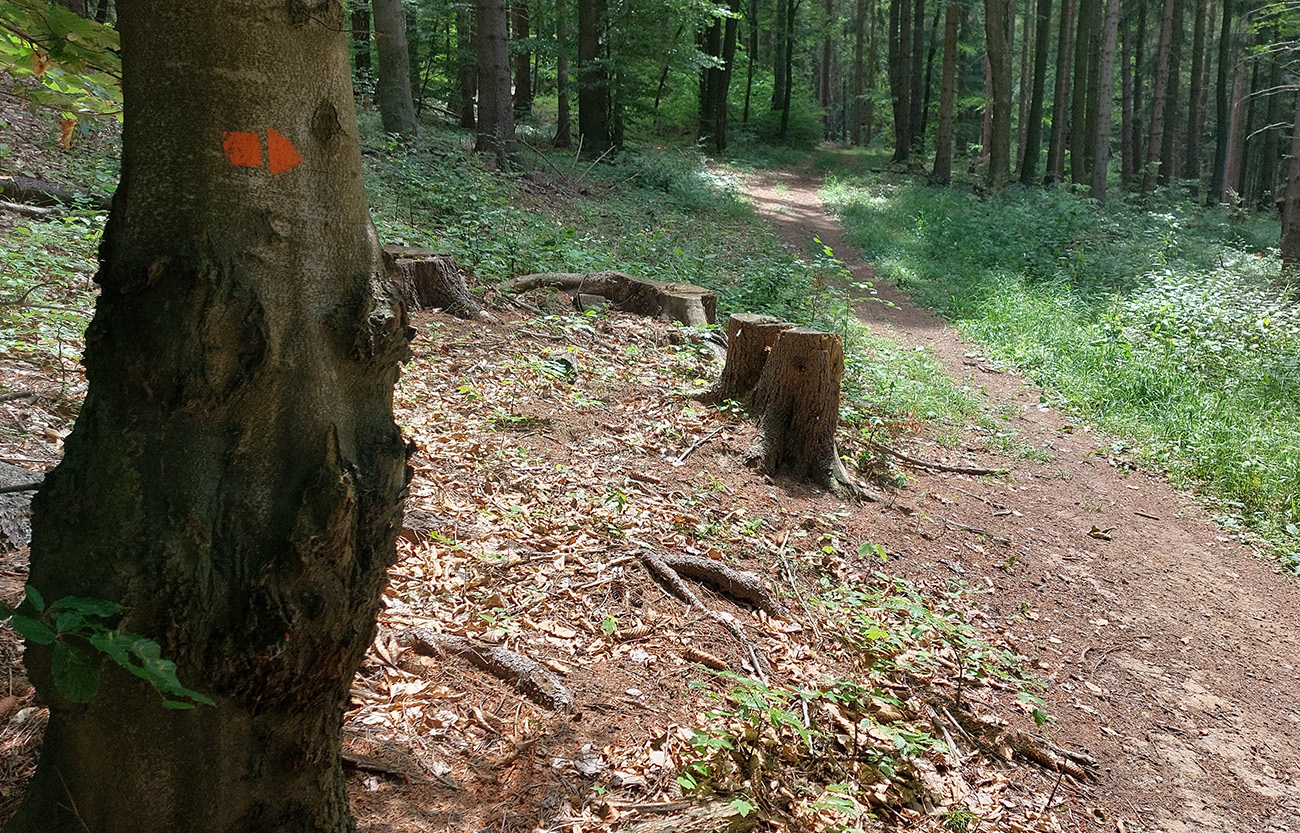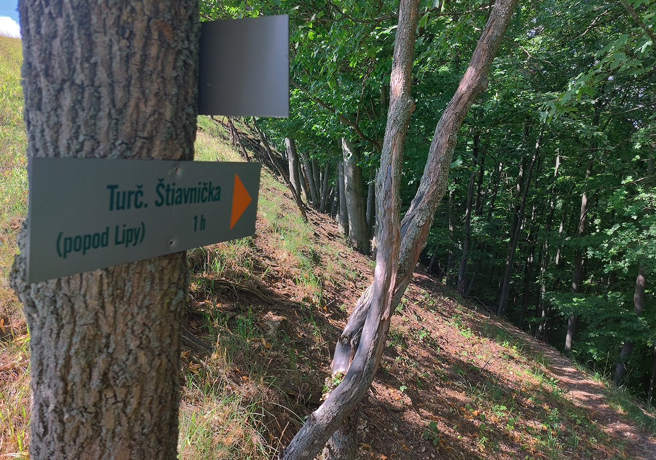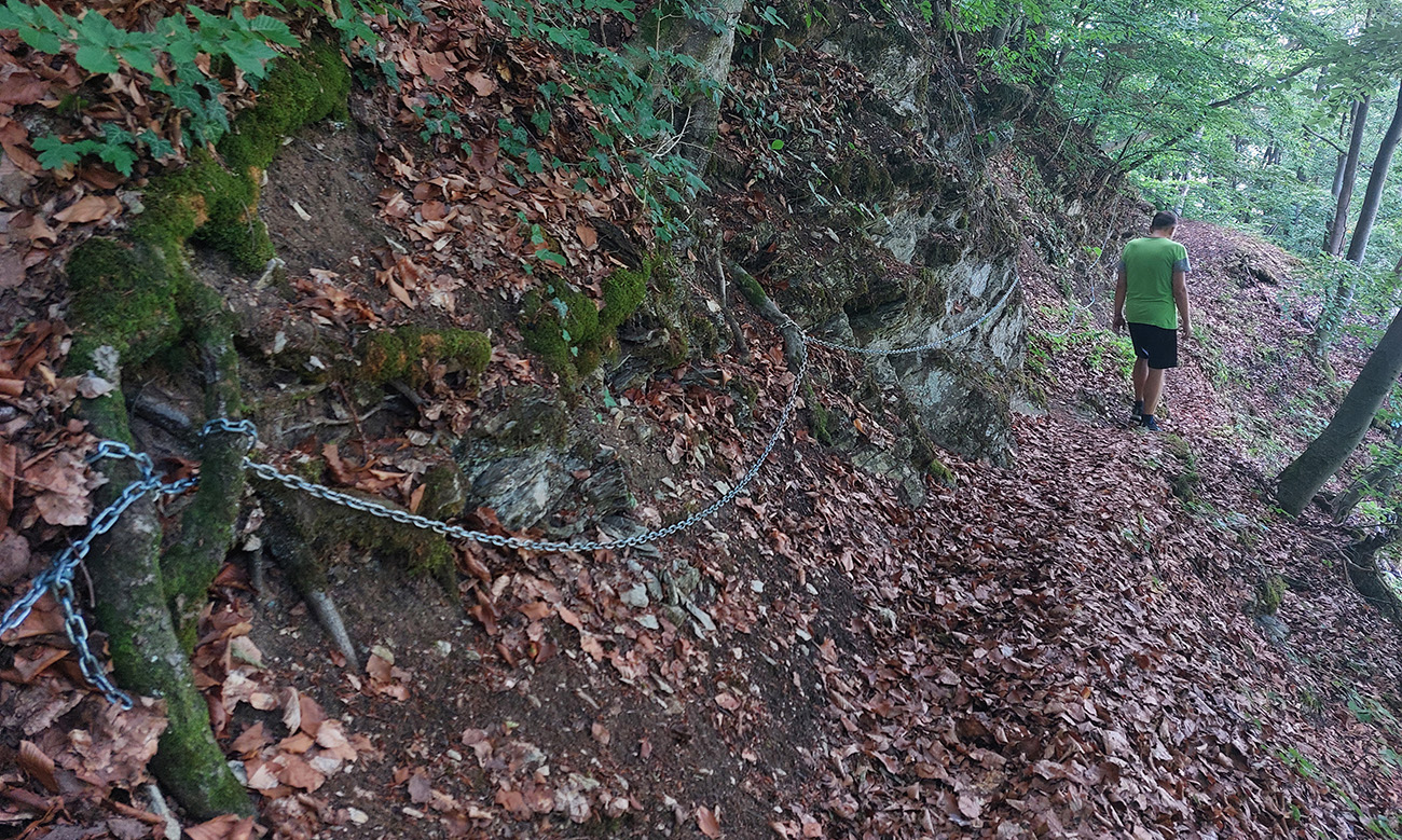 No a posledná časť okruhu je definitívne dole kopcom. Hneď nad hradom rozhranie lesa a lúky zvádza síce k výstupu hore na horizont, ale oranžové štvorčeky a výrazné šípky na strome navigujú doprava, do diery v zelenej hradbe, kade začína príjemný, aj keď úzky, traverzový chodník „Popod lipy“ nazad dole ku minerálke. Miestami je dokonca vylepšený reťazou na pridržanie sa a zvýšenie sebavedomia. Ale dal by sa aj na bajku.